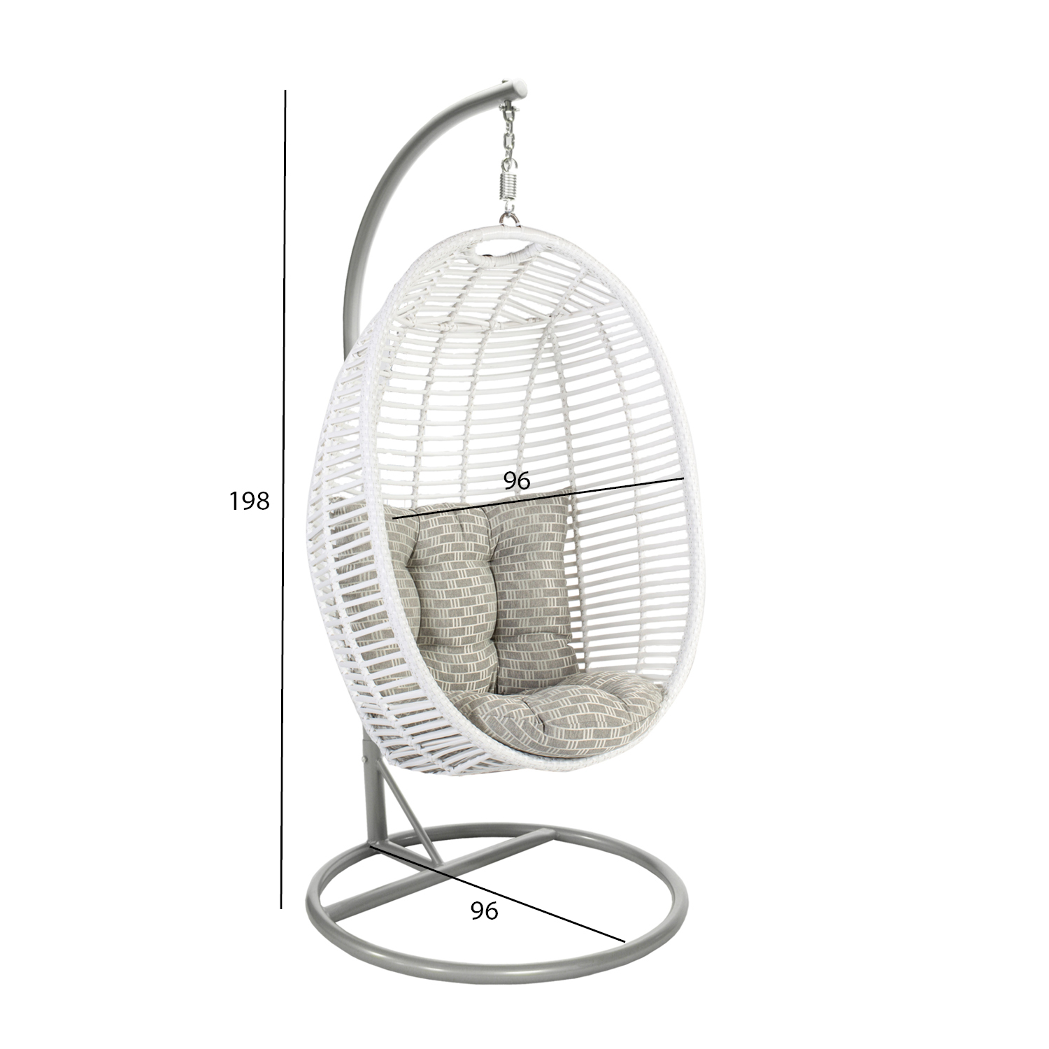 CORA 96x96xH198cm, baltos spalvos. Su šiuo madingu pakabinamu krėslu vasaros kambarį paverskite poilsio oaze! Patogiai svyrantis minkštai paminkštintas pintas krėslas suteikia malonų pavėsį ir kartu yra pakankamai atviras, kad galėtumėte mėgautis saulėtu vasaros oru. Pakabinamas krėslas taip pat puikiai tinka naudoti patalpose. Tvirtos plieninės supamojo krėslo kojos padengtos pilkais milteliniais dažais. Milteliais dažytas plieninis krepšio rėmas padengtas baltu plastikiniu pynimu. Gaminį įeina 2 čiužiniai. Pagalvėlių užvalkalai pagaminti iš pilko poliesterio audinio. Čiužinių matmenys D70xH10 cm ir 72x58x8 cm. Galvūgalio matmenys yra 90x65xH123 cm. Ribinis svoris 120 kg. Gaminys atsparus besikeičiančioms oro sąlygoms ir labai lengvai prižiūrimas. Nuo oro sąlygų reikia saugoti tik pagalvėles. Rekomenduojame naudoti lauko baldų užvalkalus, kad prailgintumėte lauko baldų tarnavimo laiką. PRIEŽIŪRA: Pasibaigus vasaros sezonui rekomenduojame sodo baldus laikyti patalpoje. Pasibaigus vasaros sezonui, rekomenduojame palikti baldus sode žiemos mėnesiais. Sandėliavimui naudokite sausą ir gerai vėdinamą patalpą.