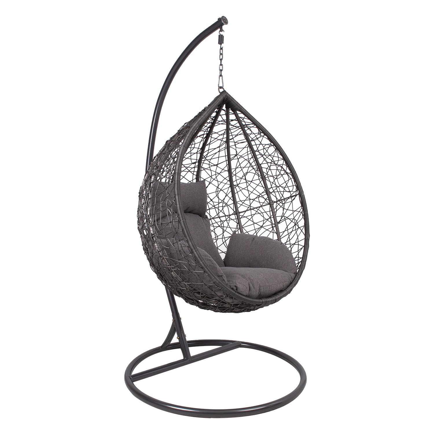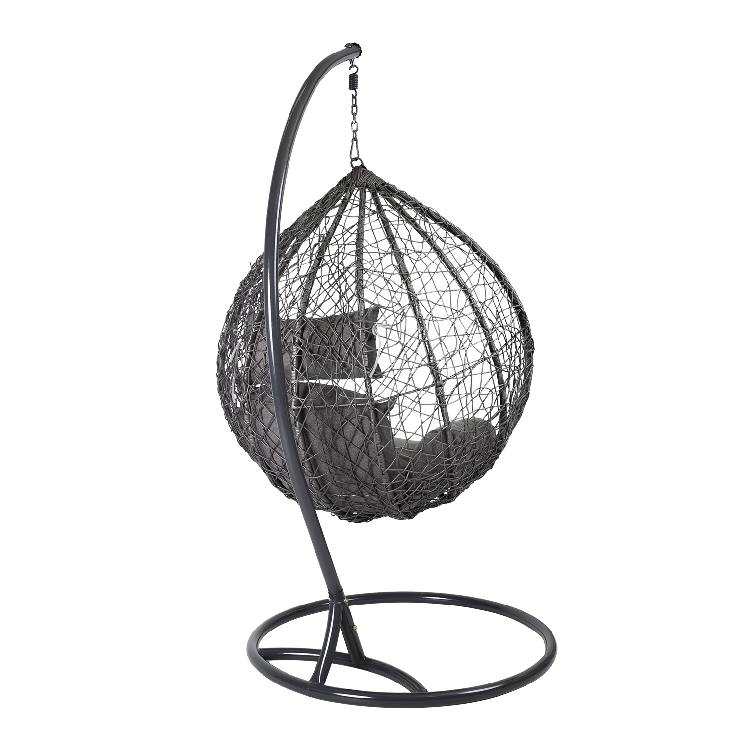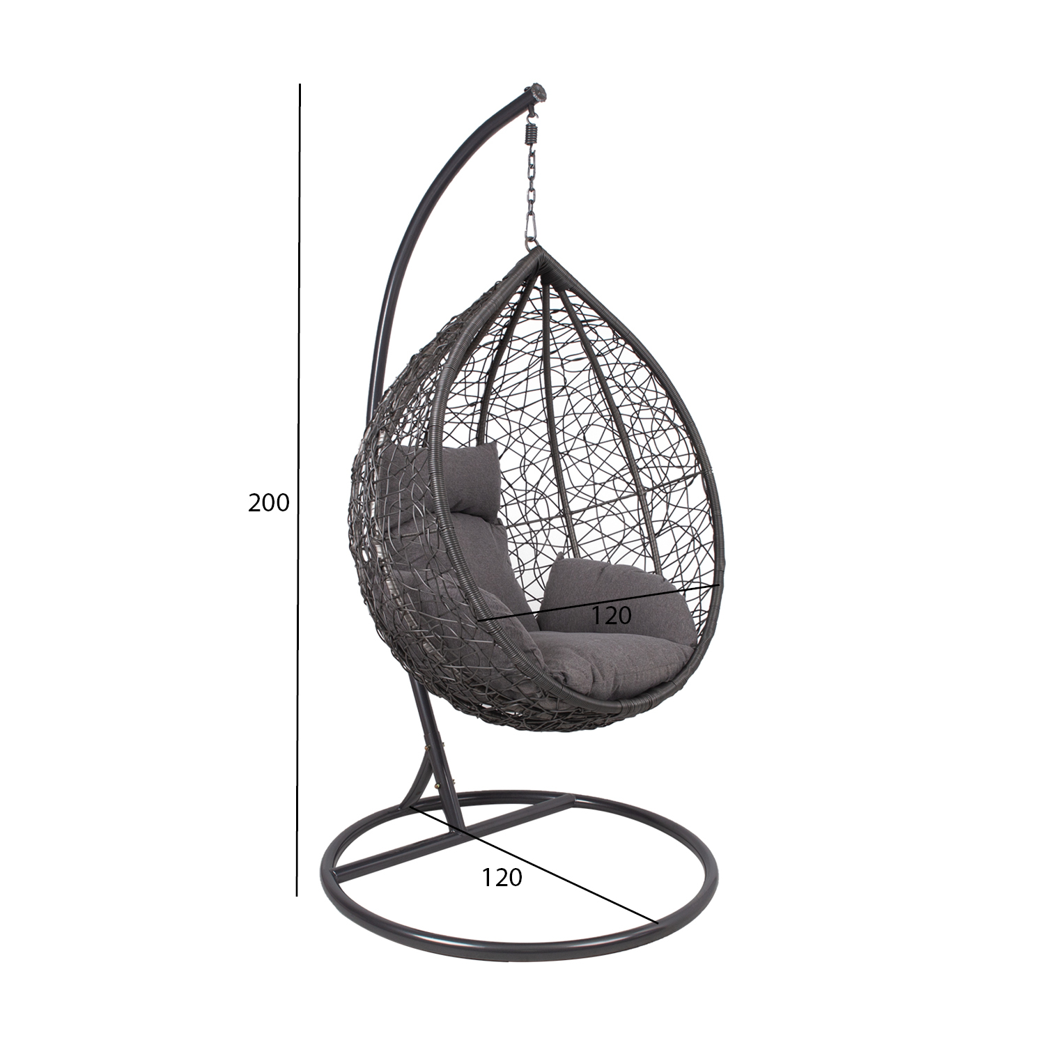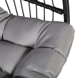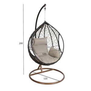 Pakabinama kėdė DROPLET tamsiai pilka. Puiki vieta atsipalaiduoti. Pridedamos patogios pagalvėlės. Pilkos spalvos pagalvėlės aptrauktos poliesterio audiniu ir užpildytos poliesterio putplasčiu. Supamojo krėslo sėdynės matmenys 105x70x120 cm. Plieninis kėdės rėmas aptrauktas tamsiai pilku plastikiniu apvadu. Plieninis pagrindas dažytas milteliniu būdu tamsiai pilka spalva. Pagrindo matmenys yra D105xH200 cm, o vamzdžio skersmuo – 42 mm. Supamojo krėslo matmenys yra 120x120xH200 cm, o keliamoji galia – 100 kg. PRIEŽIŪRA: pakabinamo krėslo negalima palikti saulėje ar lietuje ilgesnį laiką, nes tai sutrumpins gaminio tarnavimo laiką. Gaminį reikėtų laikyti sausoje ir pavėsingoje vietoje. ĮSPĖJIMAS: gaminys nėra skirtas naudoti esant stipriam vėjui ir lietui.