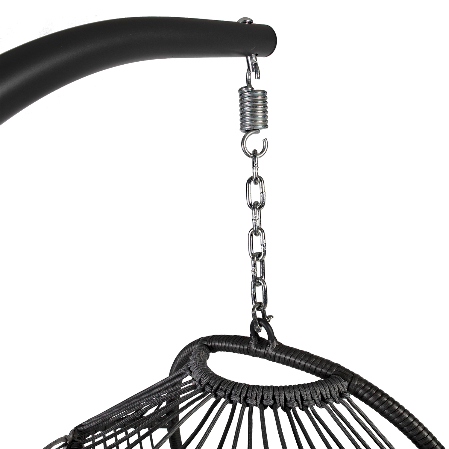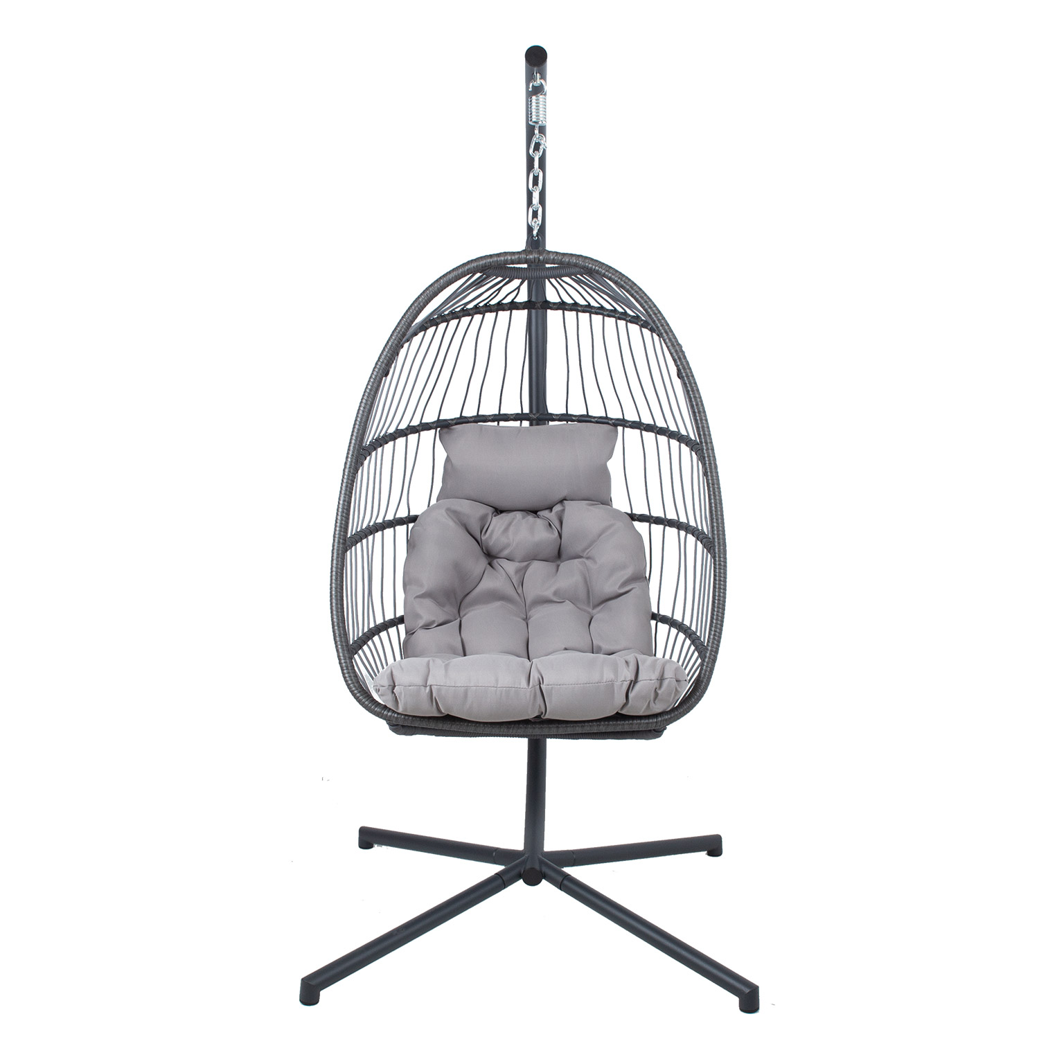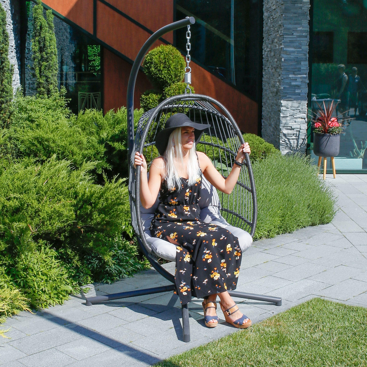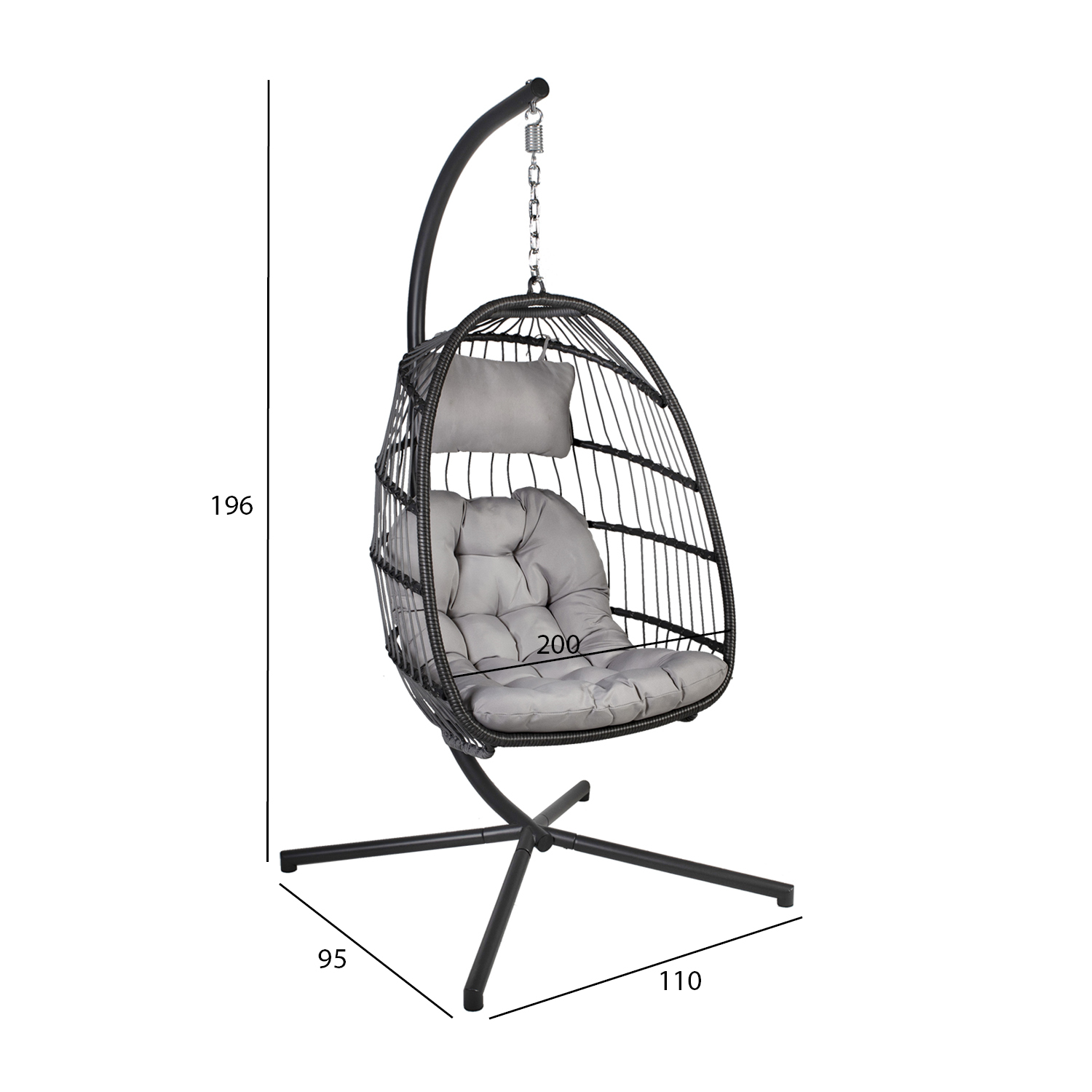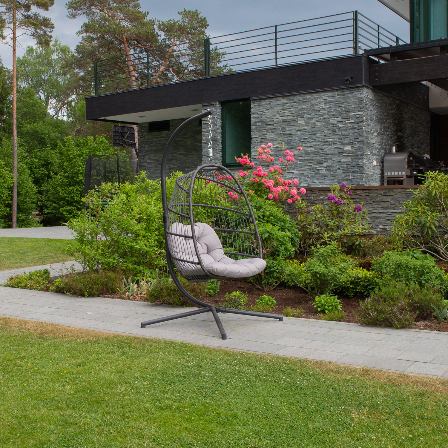 Pakabukas YOYO pilkos spalvos. Ši supamoji kėdė – puikus būdas atsipalaiduoti. Pridedamos patogios ir minkštos pagalvėlės. Kėdės aliumininis rėmas padengtas pilku plastikiniu apvadu. Plieninis pagrindas dažytas milteliniu būdu juoda spalva. Supamojo krėslo matmenys yra 100×95/110xH196 cm, jo keliamoji galia – 130 kg. PRIEŽIŪRA: pakabinamo krėslo negalima palikti saulėje ar lietuje ilgesnį laiką, nes tai sutrumpins gaminio tarnavimo laiką. Gaminį reikėtų laikyti sausoje ir pavėsyje esančioje vietoje. ĮSPĖJIMAS: gaminys nėra skirtas naudoti esant stipriam vėjui ir lietui.