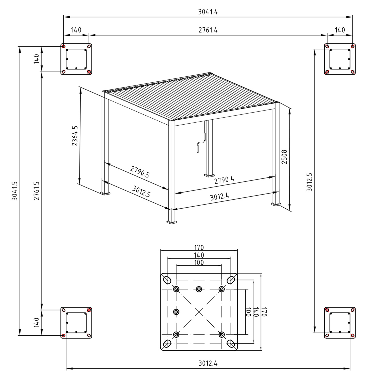 Stogelis MIRADOR-111 3x3xH2,5 m, tamsiai pilkos spalvos. Moderni, elegantiška ir funkcionali markizė / pavėsinė, tinkanti bet kur – sode, terasoje, prie baseino ar automobilio pastogėje. Ją galima naudoti ištisus metus. Inovatyvus lamelių stogas atidaromas ir uždaromas rankenėle ir suteikia apsaugą bei pavėsį nuo lengvo lietaus ir kaitrios saulės. Uždaras skersinis stogas yra atsparus vandeniui. Dėl įmontuotos lietaus nuvedimo sistemos vanduo saugiai nuteka nuo stogo. Papildomai galite pasirinkti tinkamo tipo sieneles arba užuolaidas, kad stoglangiui suteiktumėte kitokią išvaizdą ir funkcionalumą. Sienos ir užuolaidos į komplektą neįeina, jas galima užsisakyti atskirai. Pagrindinė markizės konstrukcija pagaminta iš aliuminio ir padengta tamsiai pilka milteline danga. 4 atraminiai stulpeliai 111×111 mm, horizontaliai sija 140×75 mm, cinkuoto plieno stogo lamelės 173×30 mm. Tikslūs stoginės matmenys yra 3012,5×3012,5×2508 mm. Stogelį sumontuokite ant stabaus ir lygaus paviršiaus ir tinkamai pritvirtinkite. Jei stoginę naudosite ištisus metus, įsitikinkite, kad ant stogo nesikaupia per daug sniego. Kuo greičiau pašalinkite susikaupusį sniegą. Įsitikinkite, kad vandens nutekėjimo angos yra laisvos. Prieš prasidedant žiemos sezonui patikrinkite, ar šoniniuose stulpeliuose nesusidarė vandens sankaupų. Užšalęs vanduo gali pažeisti stulpelius.