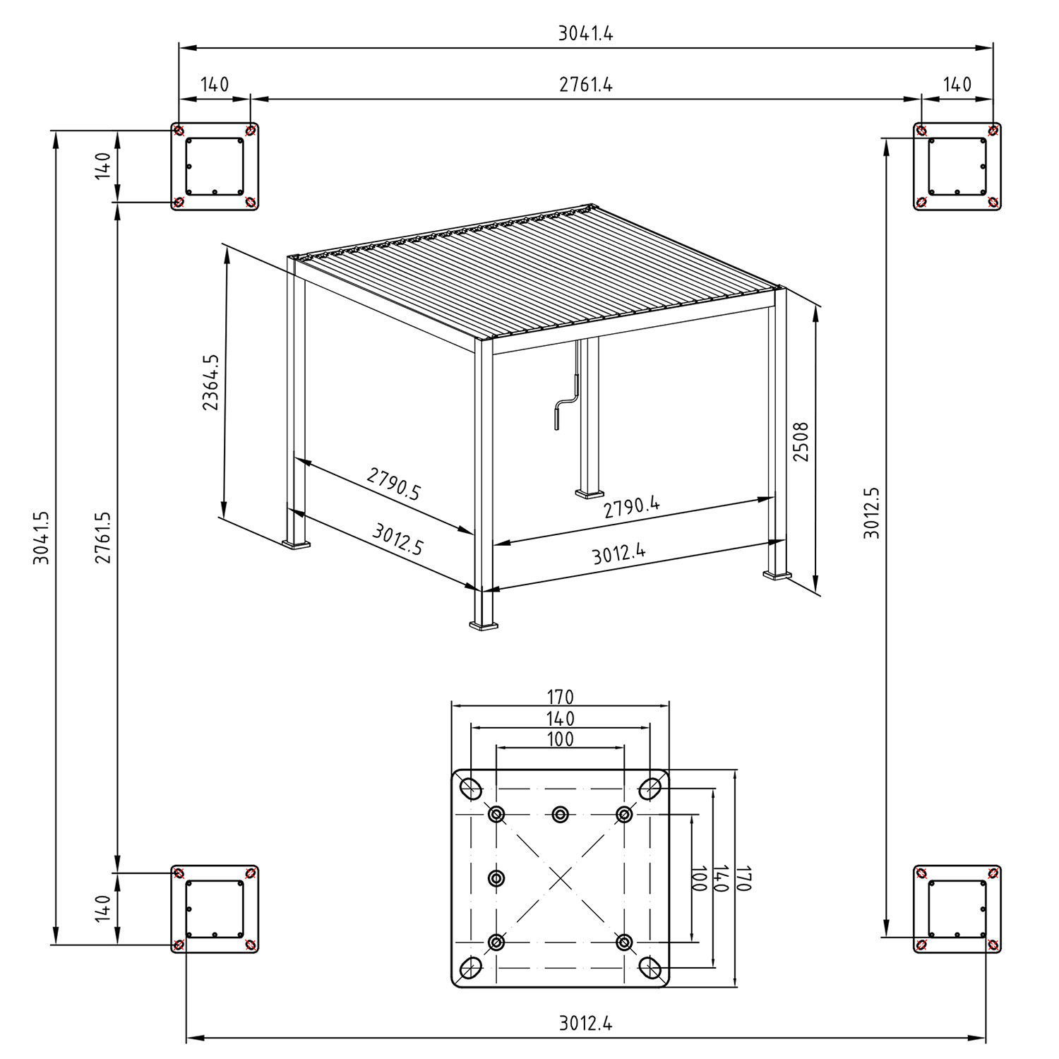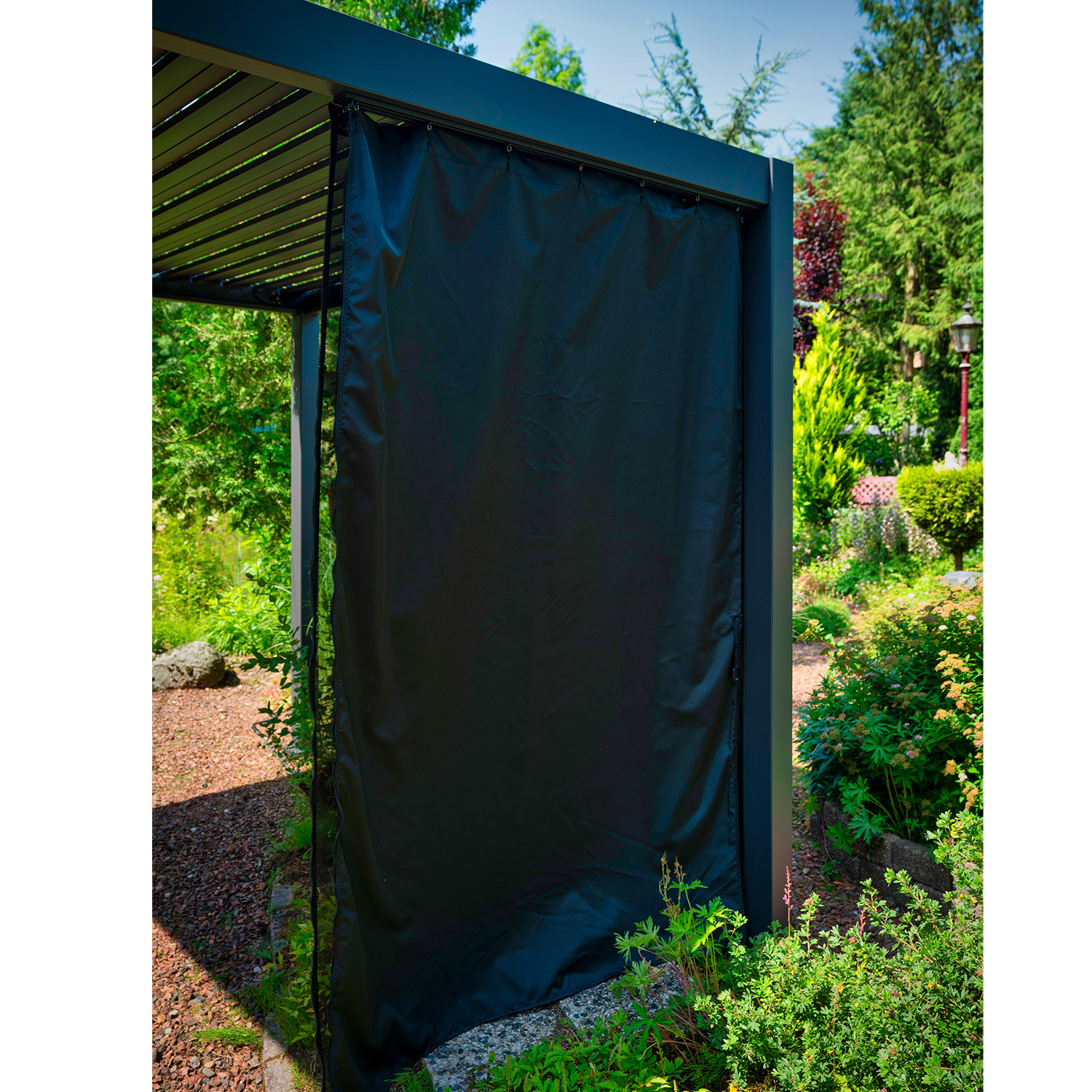 Stogelis MIRADOR-111 3x3xH2,5 m su šoninėmis užuolaidomis ir tinkleliais nuo uodų. Moderni, elegantiška ir funkcionali markizė / pavėsinė, tinkanti bet kurioje vietoje – sode, terasoje, prie baseino ar automobilio pastogėje ir tinkama naudoti ištisus metus. Novatoriškas lamelių stogas, atidaromas ir uždaromas rankenėle, suteikia apsaugą ir pavėsį nuo lengvo lietaus ir kaitrios saulės. Uždaras skersinis stogas yra atsparus vandeniui. Dėl įmontuotos lietaus nuvedimo sistemos vanduo saugiai nuvedamas nuo stogo. Komplekte yra šoninės užuolaidos, tinkleliai nuo uodų ir visų keturių pusių užuolaidų linijos. Šoninės užuolaidos pagamintos iš juodo poliesterio audinio 180 g/m². Tinkleliai nuo uodų pagaminti iš juodo poliesterio tinklo 70 g/m². Užuolaidas ir tinklelius nuo uodų galima užrakinti. Pagrindinė markizės konstrukcija pagaminta iš aliuminio ir nudažyta tamsiai pilkais milteliniais dažais. 4 atraminiai stulpeliai 111×111 mm, horizontalioji dalis 140×75 mm, cinkuoto plieno stogo lamelės 173×30 mm. Tikslūs stoginės matmenys yra 3012,5×3012,5x2508mm. Stogelį sumontuokite ant stabilaus ir lygaus paviršiaus ir tinkamai pritvirtinkite. Jei stoginę naudosite ištisus metus, įsitikinkite, kad ant stogo nesikaupia per daug sniego. Kuo greičiau pašalinkite susikaupusį sniegą. Rekomenduojame žiemos sezonui nuimti užuolaidas ir tinklelius nuo uodų. Prieš laikydami užuolaidas išvalykite ir išdžiovinkite. Užtikrinkite, kad nebūtų vandens nutekėjimo angų. Prieš prasidedant žiemos sezonui patikrinkite, ar šoniniuose stoveliuose nesusidarė vandens sankaupų. Jei jie užšals, vanduo gali pažeisti stulpelius.
