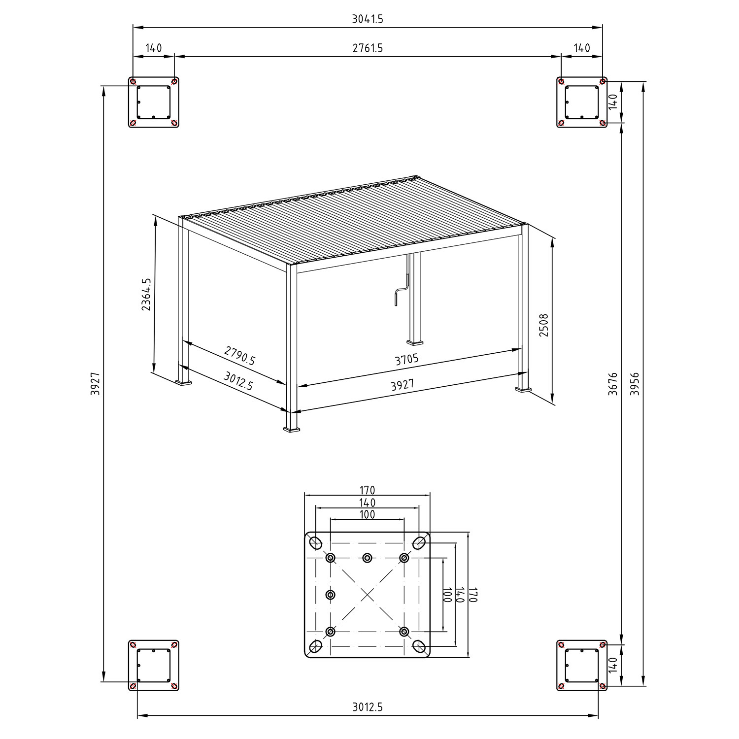Stogelis MIRADOR-111 3x4xH2,5 m, tamsiai pilkos spalvos. Moderni, elegantiška ir funkcionali markizė / pavėsinė, tinkanti bet kokiai vietai – sode, terasoje, prie baseino ar automobilio pastogėje. Ją galima naudoti ištisus metus. Inovatyvus lamelių stogas atidaromas ir uždaromas rankenėle ir suteikia apsaugą bei pavėsį nuo lengvo lietaus ir kaitrios saulės. Uždaras skersinis stogas yra atsparus vandeniui. Dėl įmontuotos lietaus nuvedimo sistemos vanduo saugiai nuteka nuo stogo. Komplekte yra šoninės užuolaidos, tinkleliai nuo uodų ir visų keturių pusių užuolaidų linijos. Šoninės užuolaidos pagamintos iš juodo poliesterio audinio 180 g/m². Tinkleliai nuo uodų pagaminti iš juodo poliesterio tinklo 70 g/m². Užuolaidas ir tinklelius nuo uodų galima užrakinti. Pagrindinė markizės konstrukcija pagaminta iš aliuminio ir nudažyta tamsiai pilkais milteliniais dažais. 4 atraminiai stulpeliai 111×111 mm, horizontalioji dalis 140×75 mm, cinkuoto plieno stogo lamelės 173×30 mm. Tikslūs stoginės matmenys yra 3012,5x3927x2508 mm. Stogelį sumontuokite ant stabilaus ir lygaus paviršiaus ir tinkamai pritvirtinkite. Jei stoginę naudosite ištisus metus, įsitikinkite, kad ant stogo nesikaupia per daug sniego. Kuo greičiau pašalinkite susikaupusį sniegą. Rekomenduojame žiemos sezonui nuimti užuolaidas ir tinklelius nuo uodų. Prieš laikydami užuolaidas išvalykite ir išdžiovinkite.