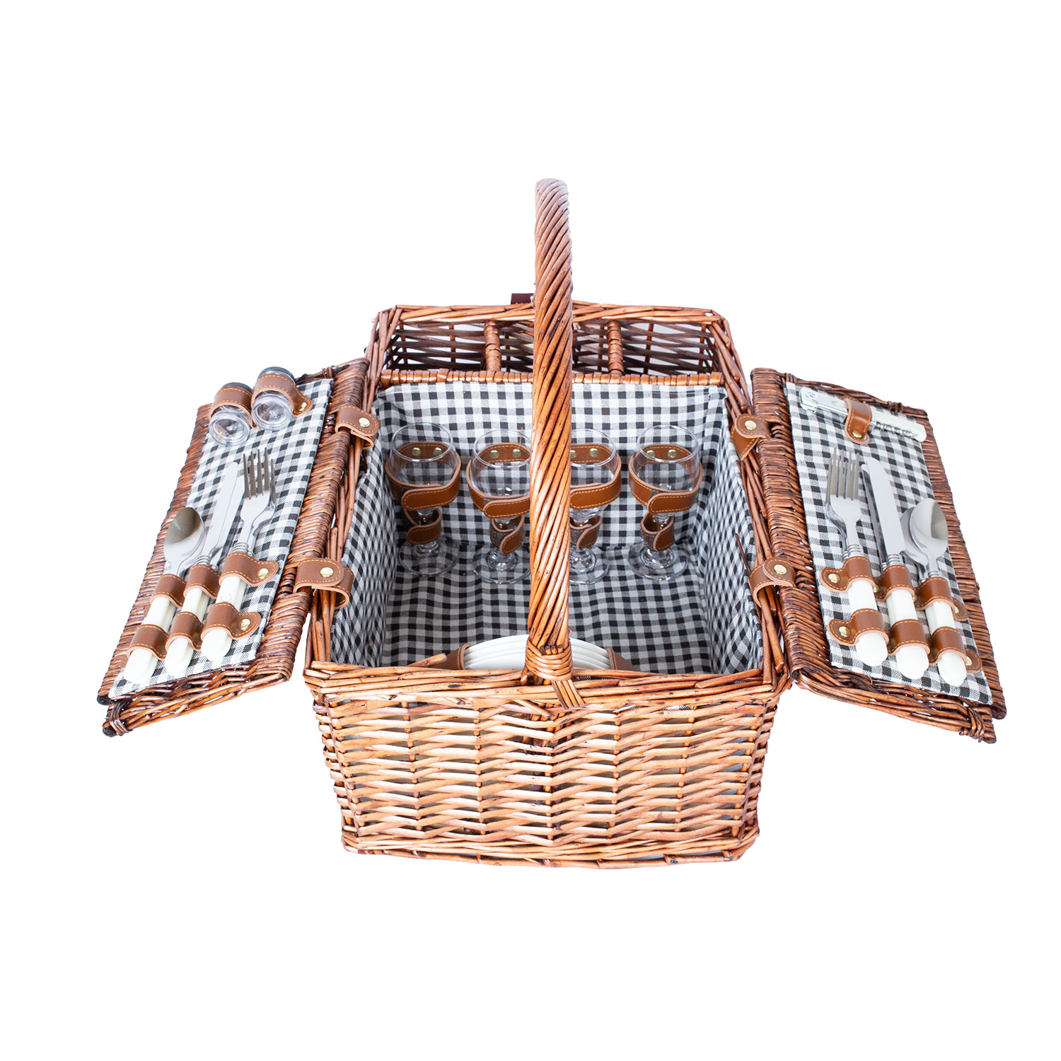 Elegantiškas pintas krepšys su stalo įrankiais.