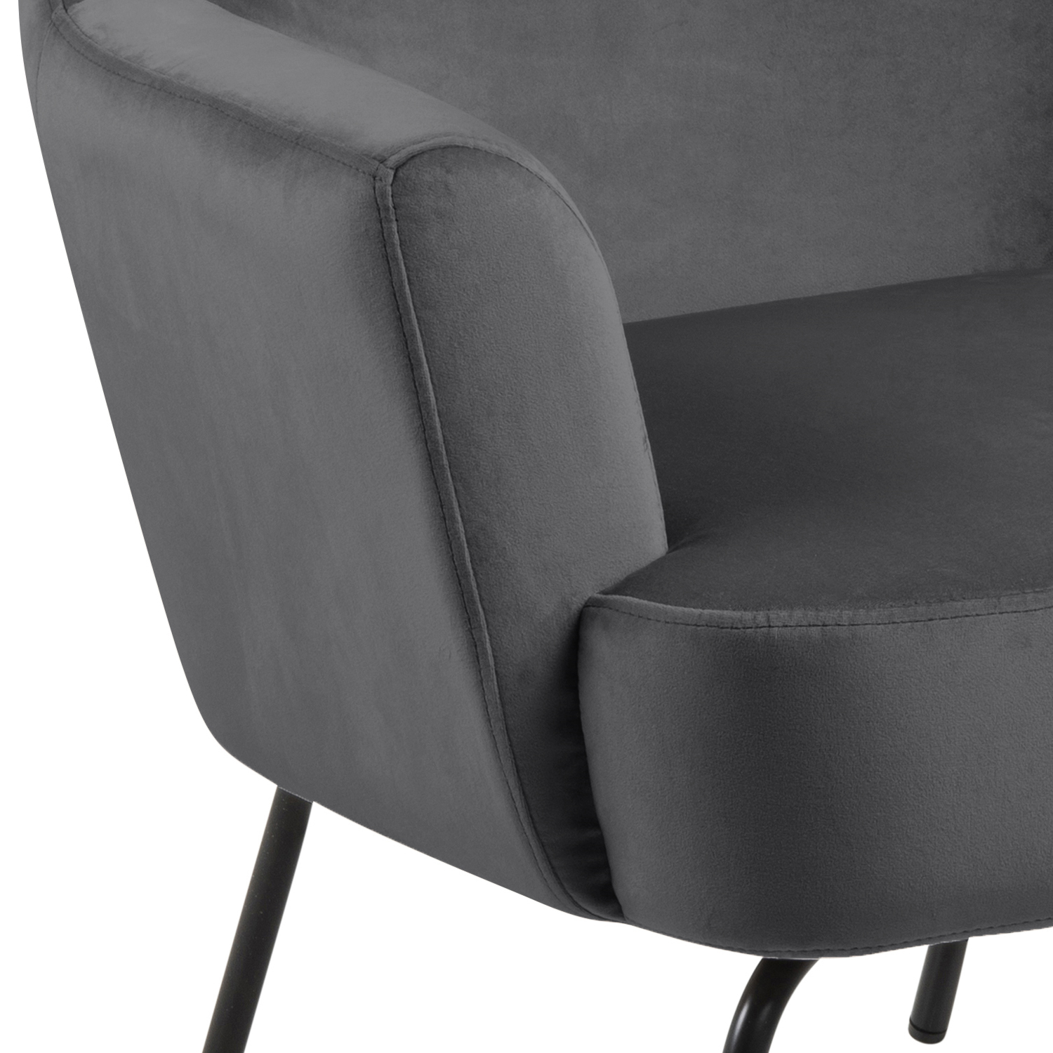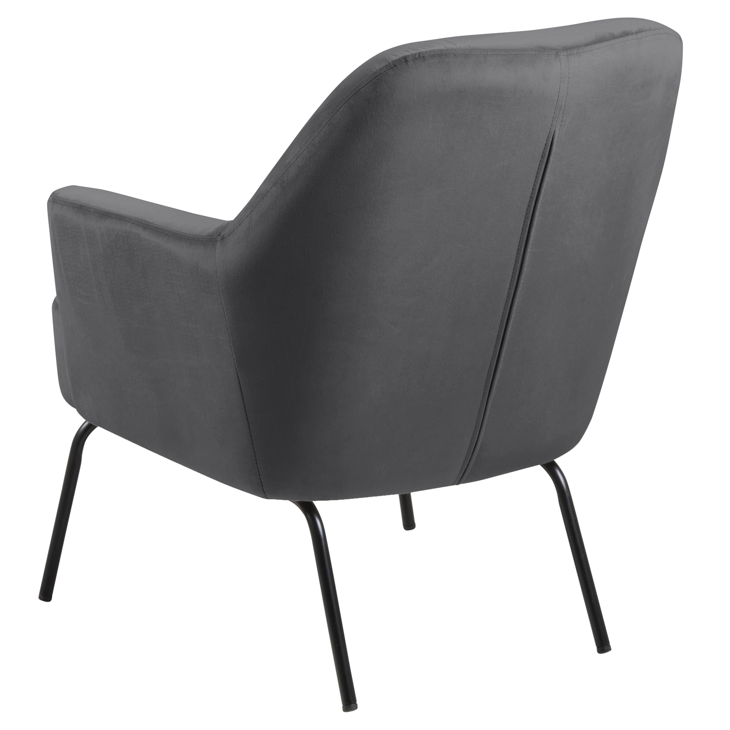 Fotelis MELISSA tamsiai pilkos spalvos. Kėdė aptraukta VIC audiniu tamsiai pilka 28. Kojos pagamintos iš juodo milteliniu būdu dažyto metalo. Gaminio matmenys 75x75xH83 cm.