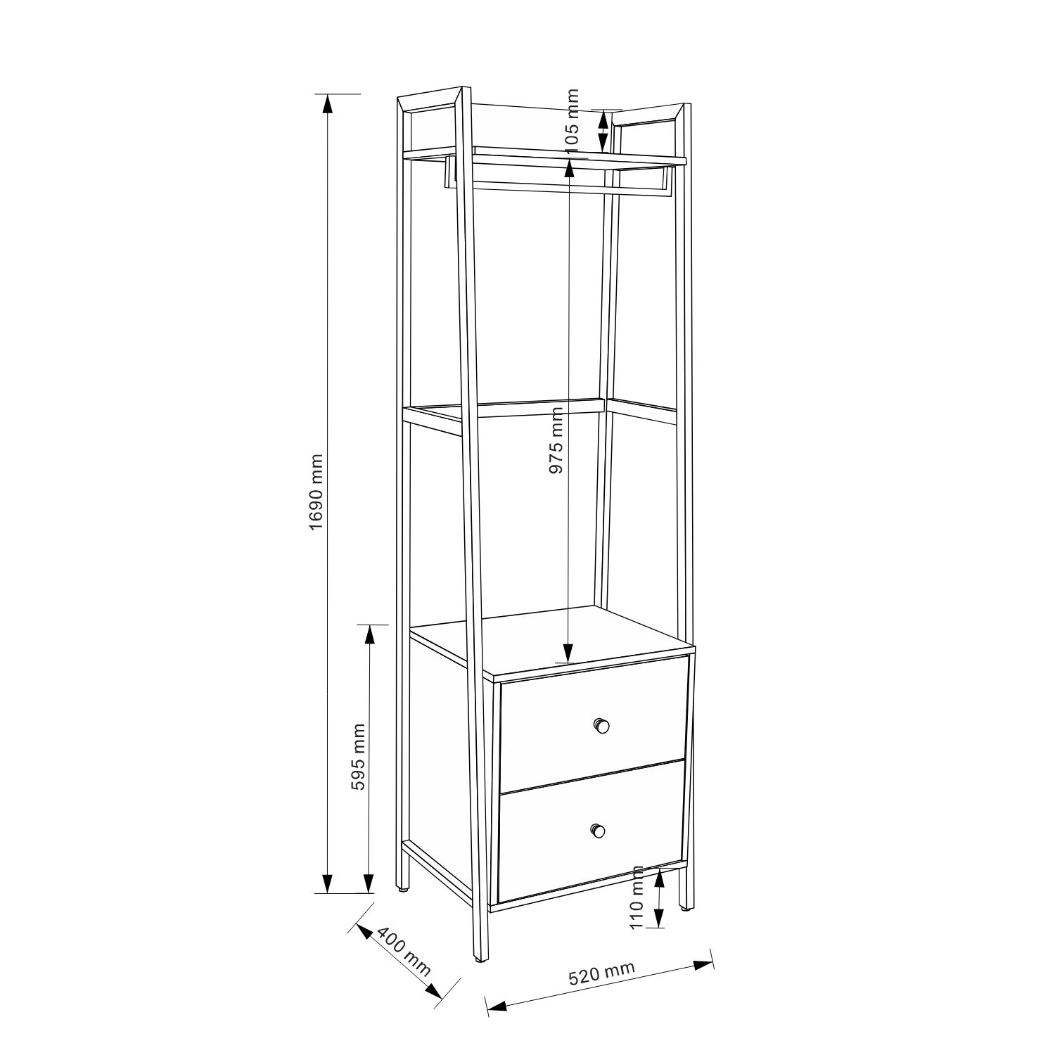 Priekinė lentyna LAVINIA su 2 stalčiais ir strypu 52x40xH169cm, uosio/juodos spalvos. Lentynos rėmas pagamintas iš metalo ir padengtas juoda milteline danga. Lentynos su stalčiais pagamintos iš melamino plokštės su salos apvalkalu.