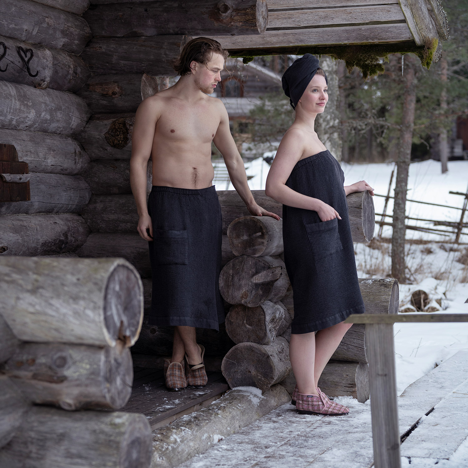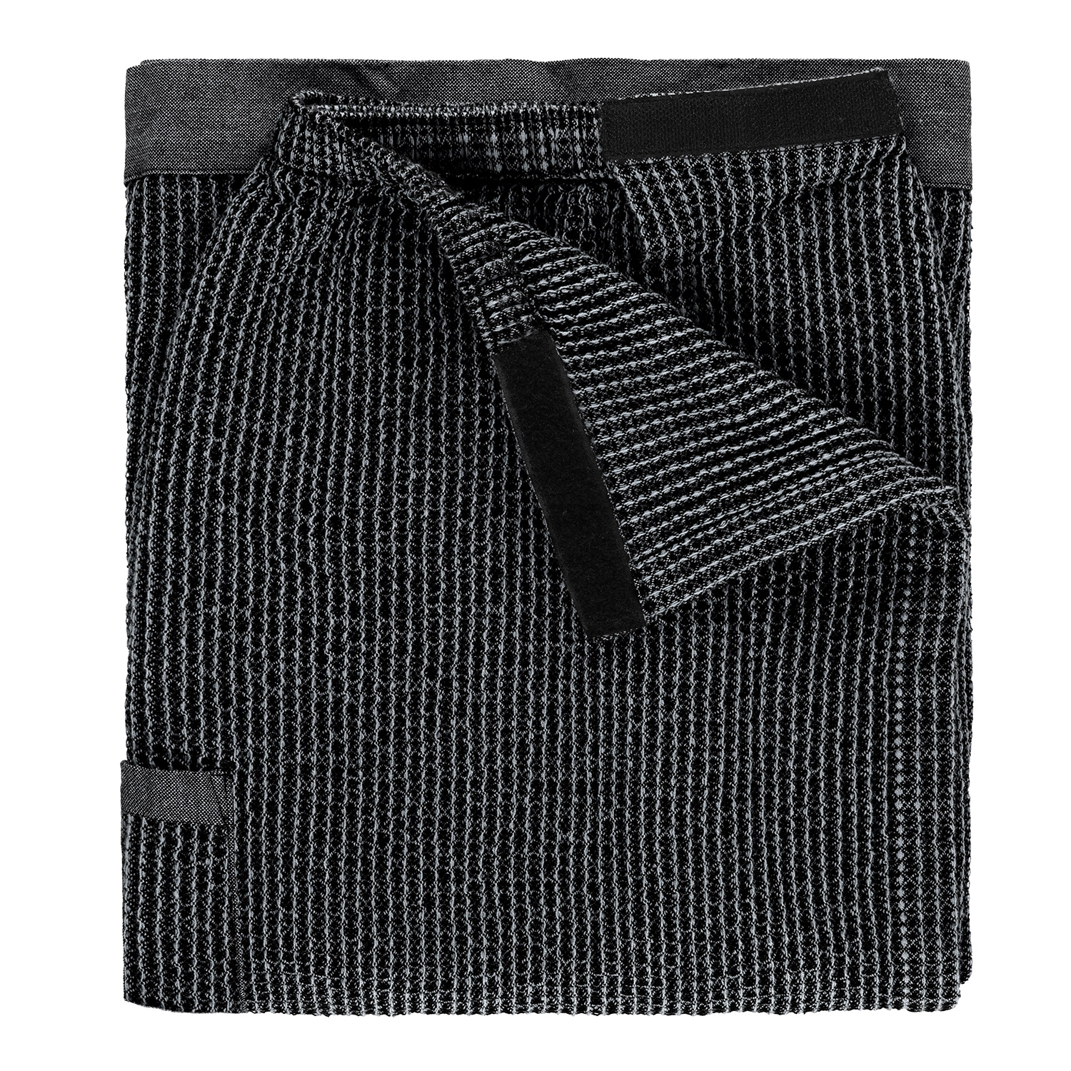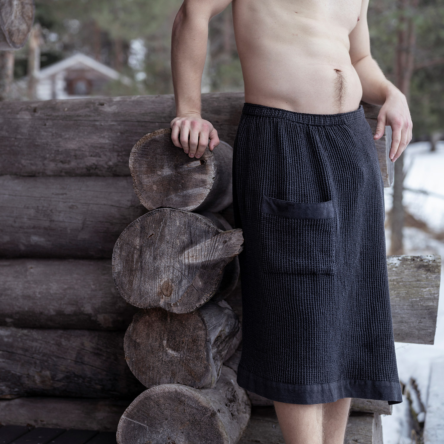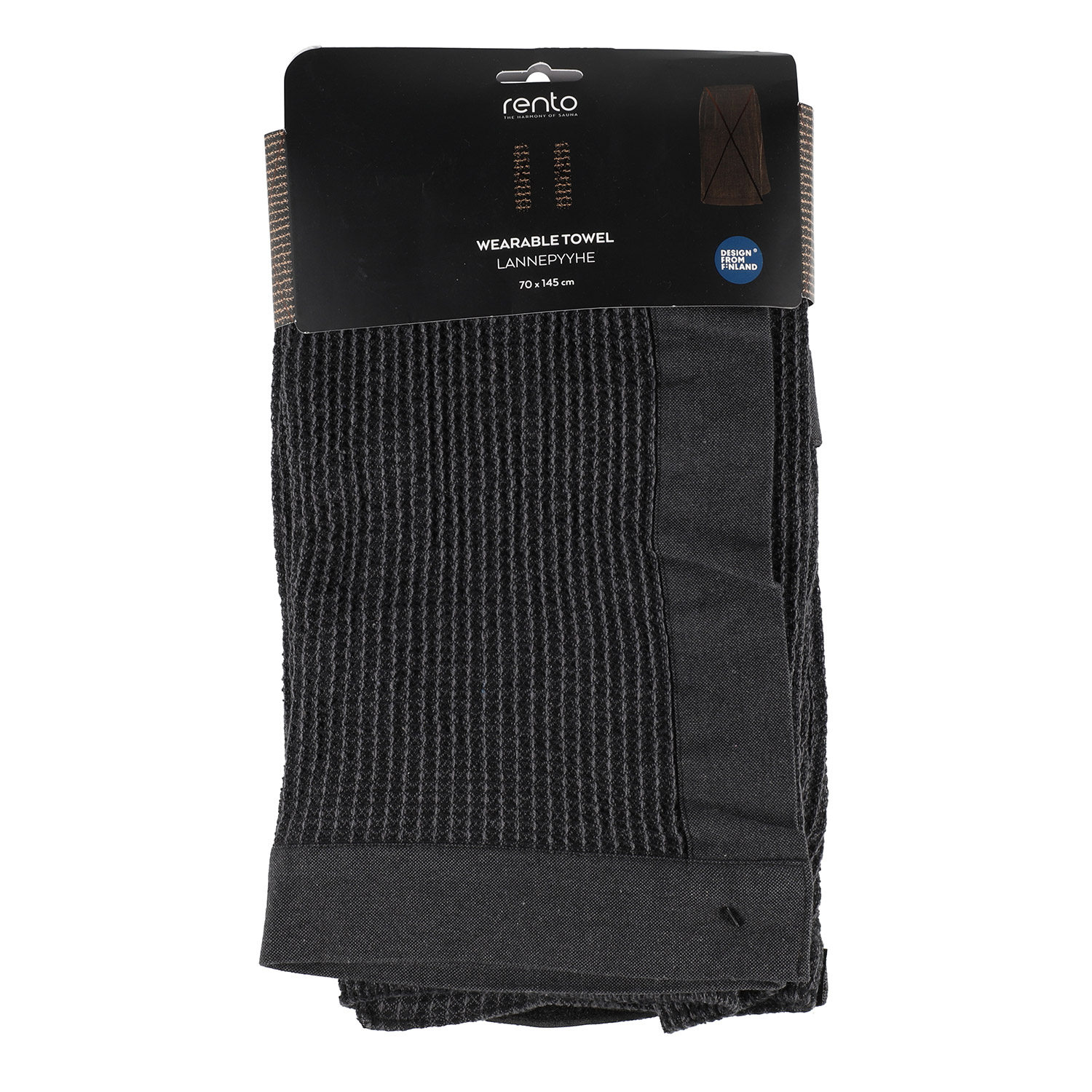 Rankšluostis pirčiai RENTO GREY 70x145cm. Šis patogus saunos rankšluostis turi platų šambrajaus spalvos kraštą, kuris suteikia elegantiškumo. Gaminys turi velcro užsegimą. Gaminys pagamintas iš perdirbtos medvilnės, todėl audinys yra natūraliai minkštas ir gyvos tekstūros.