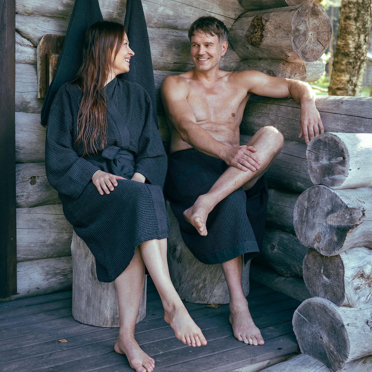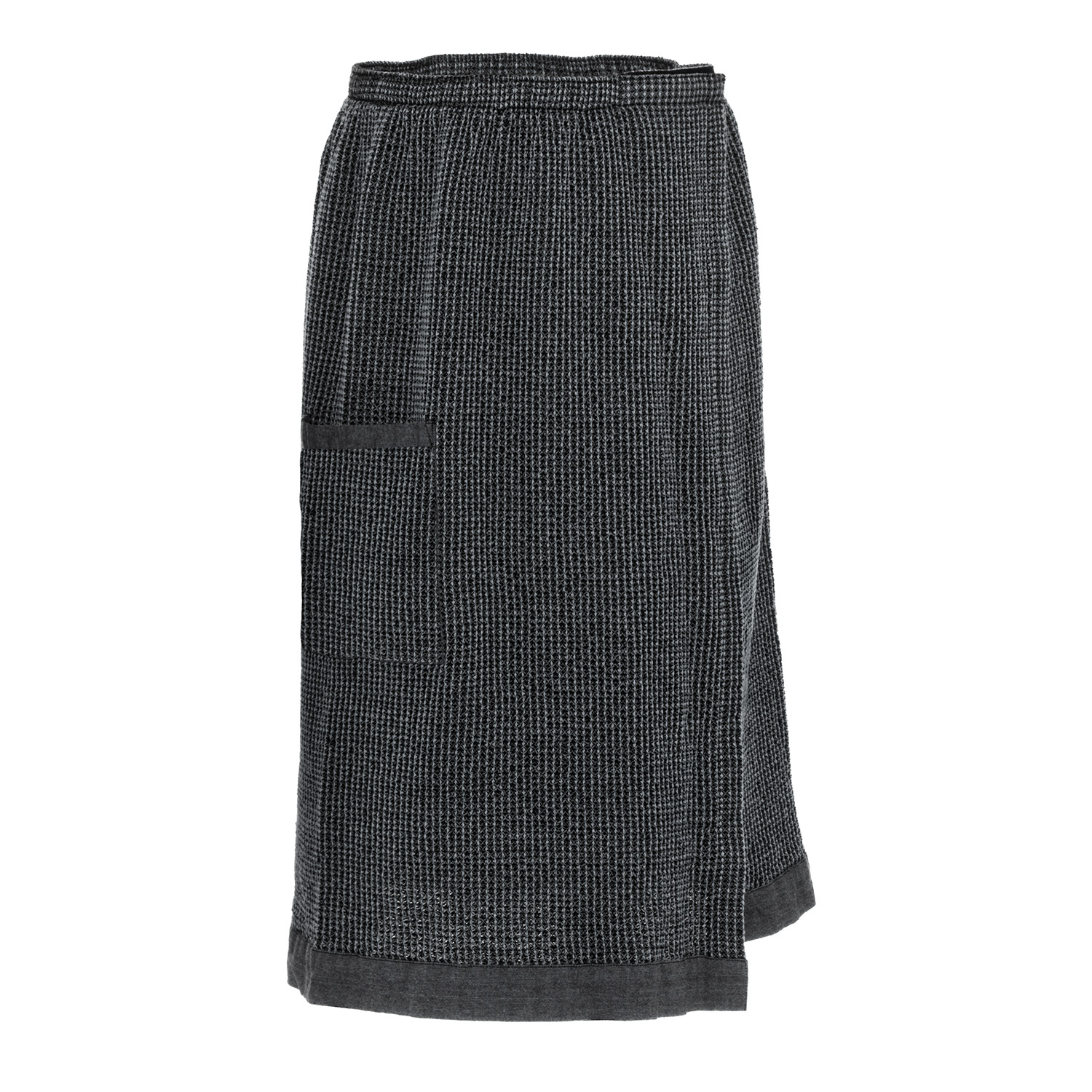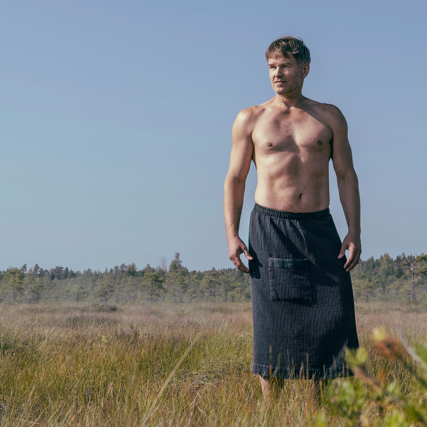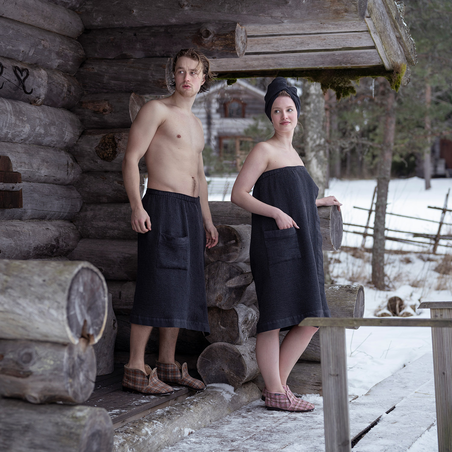 Rankšluostis pirčiai RENTO GREY 70x145cm. Šis patogus saunos rankšluostis turi platų šambrajaus spalvos kraštą, kuris suteikia elegantiškumo. Gaminys turi velcro užsegimą. Gaminys pagamintas iš perdirbtos medvilnės, todėl audinys yra natūraliai minkštas ir gyvos tekstūros.