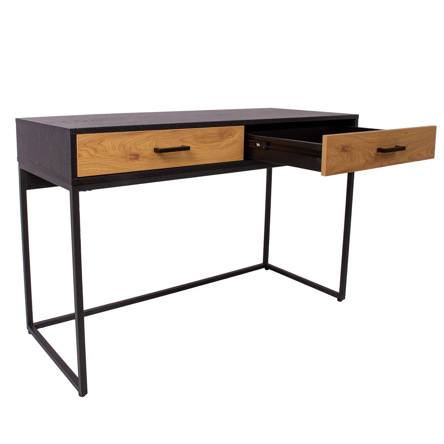 Rašomasis stalas AMSTERDAM 120x50xH79cm, juodos spalvos. Rašomasis stalas yra būtinas bet kurių namų priedas, leidžiantis patogiau naudotis kompiuteriu arba susikurti praktišką namų biuro erdvę. Rašomasis stalas pagamintas melamino. Spalva – ąžuolas, juoda. Pagrindo rėmas iš juodo metalo. Tyliai užsidarantys stalčių bėgeliai. Juodos spalvos aliuminio rankenos. Gaminio matmenys 120x50xH79 cm.