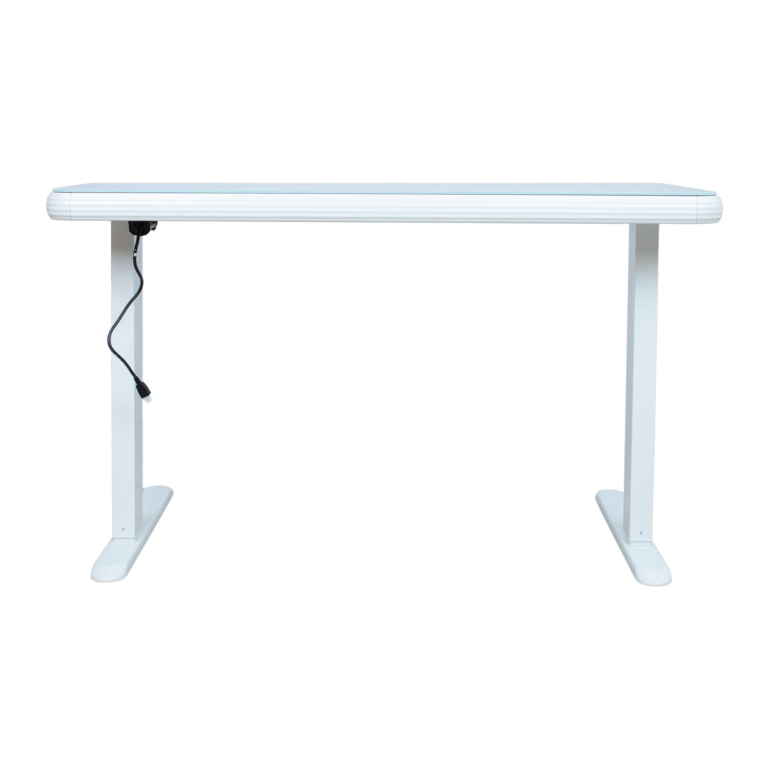 Itin baltas grūdinto stiklo stalviršis su užapvalintais kampais yra priklijuotas prie baldo plokštės, todėl stiklo dūžio atveju užtikrinamas saugumas, nes stiklo nuolaužos neišsibarsto.