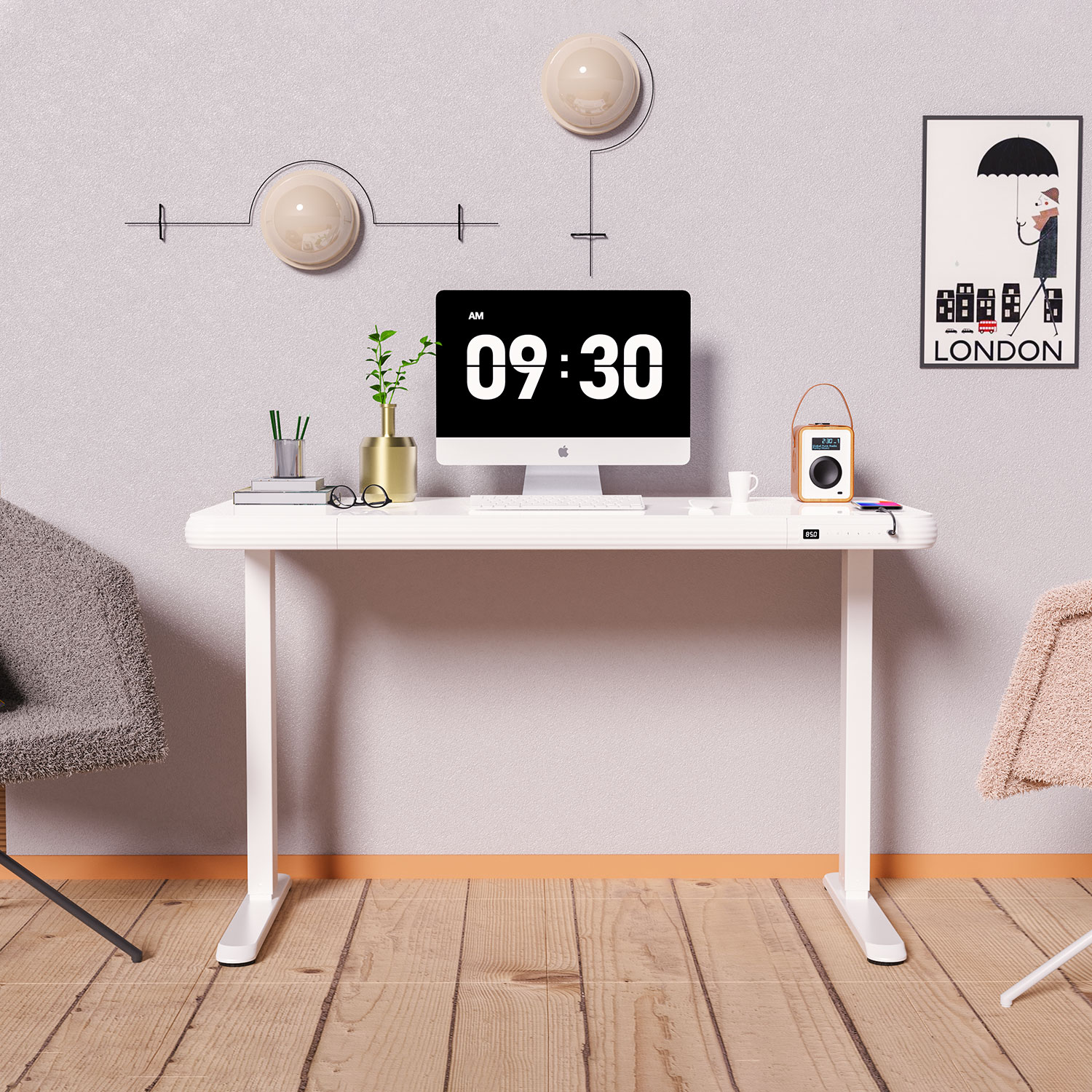 Dėl švaraus ir universalaus dizaino šį reguliuojamo aukščio rašomąjį stalą galima lengvai integruoti į bet kokią biuro ar namų aplinką.