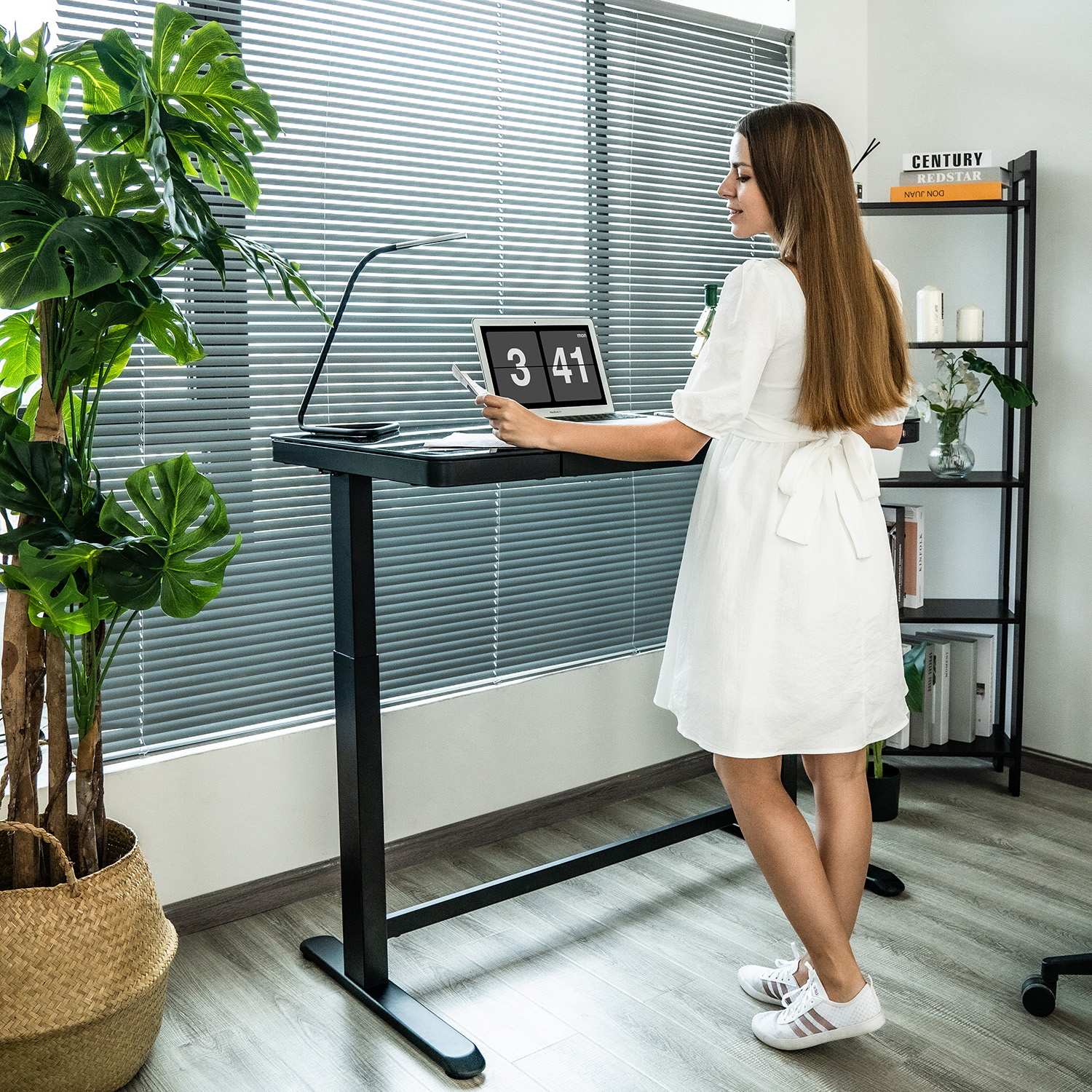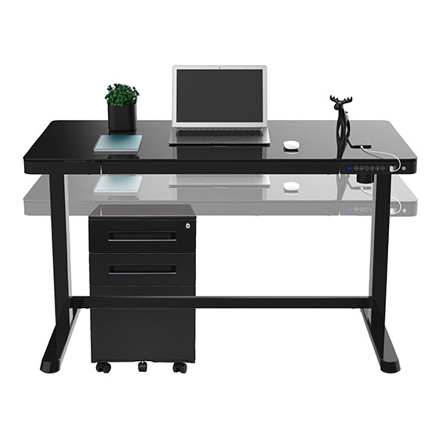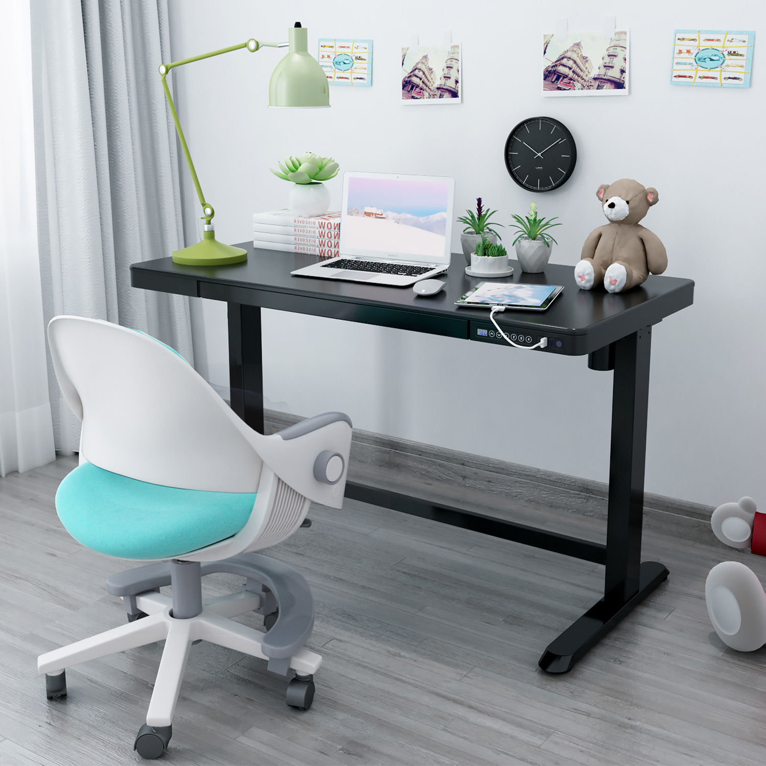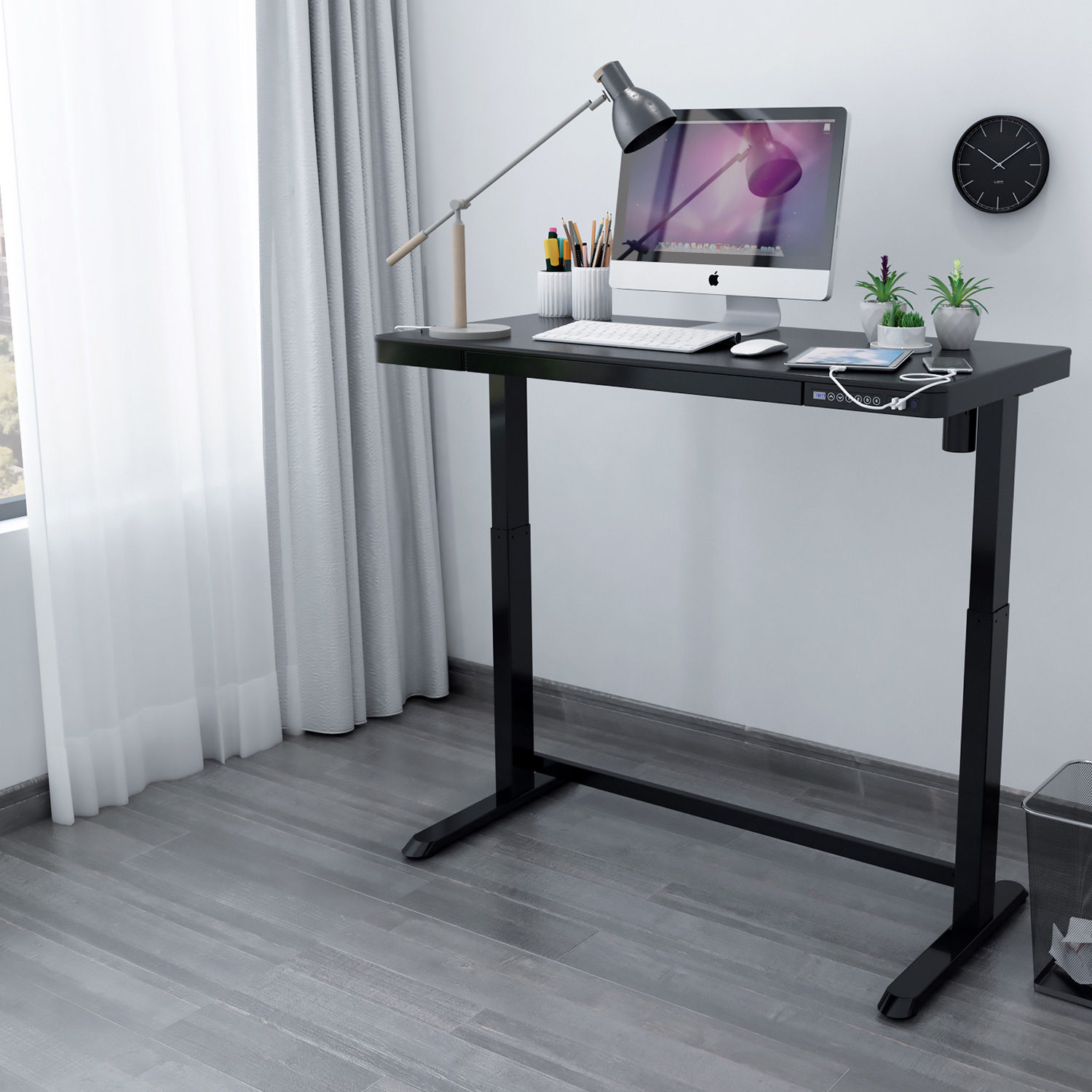 Rašomasis stalas ERGO 1 variklio 120×60 cm, juodos spalvos. Reguliuojamo aukščio rašomasis stalas – protingas pasirinkimas visai šeimai! Pasirūpinkite, kad jūsų ar jūsų vaikų darbo aplinka būtų patogi, ir išlikite sveiki! Vienas elektros variklis ir dvifazė kėlimo sistema užtikrina greitą, sklandų ir tylų (<50 dB) judėjimą. Kėlimo greitis 25 mm/s. Stalo aukštį galima reguliuoti nuo 72 iki 121 cm. Valdymo pulto atmintyje išsaugomos 4 padėtys. Didžiausia apkrovos keliamoji galia esant visam greičiui 50 kg. Įvesties įtampa: 100 V-240 V. Stalas turi apsauginį užraktą, 3 USB įkrovimo lizdus ir didelį skyrių. 120×60 cm juodos spalvos melamino dengtas stalviršis. Dviguba kvadratinė plieninė konstrukcija užtikrina stalo kojos stabilumą net aukščiausioje padėtyje. Metalinės dalys dažytos milteliniu būdu juoda spalva. Bendrieji gaminio matmenys yra 120x60xH72-121 cm.