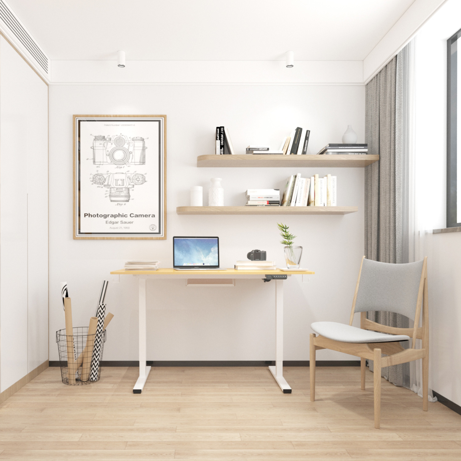Rašomasis stalas ERGO su 1 varikliu 120x60xH73-121cm, ąžuolo/baltos spalvos