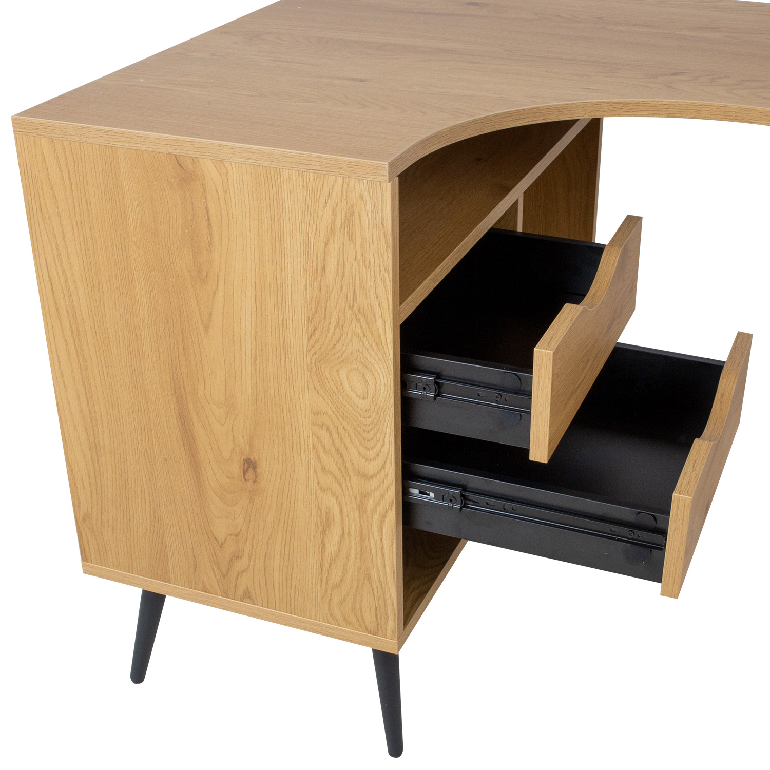 Rašomasis stalas GEORGIA 145x80xH75cm, melamino su ąžuoliniu stalviršiu. Pagamintas iš melamino dengtos baldinės plokštės. Stalo kojos pagamintos iš metalo ir padengtos juoda milteline danga. Po stalviršiu yra du stalčiai ir trys atviros skirtingo dydžio lentynos. Stalčių šliaužikliai yra tyliai užsidarantys. Trumpesnių kojų aukštis – 20 cm.