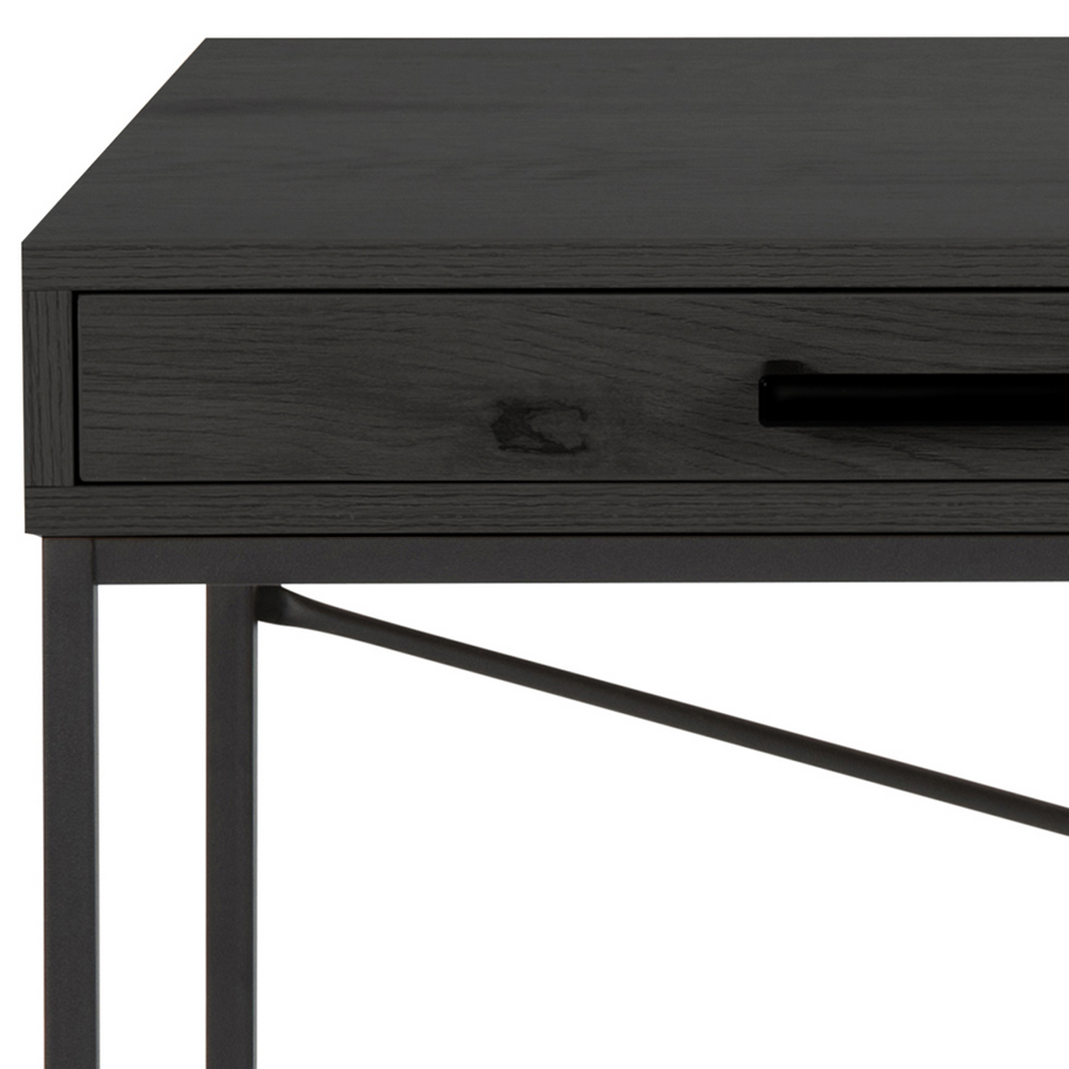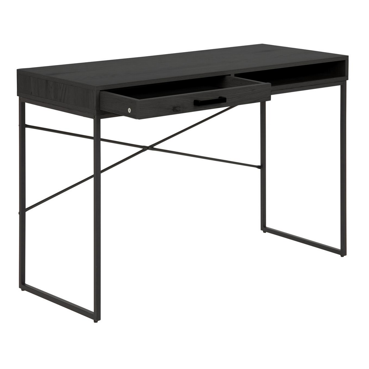 Rašomasis stalas SEAFORD 110x45xH75cm, juodos spalvos. Rašomasis stalas yra būtinas bet kurių namų priedas, leidžiantis patogiau naudotis kompiuteriu arba susikurti praktišką namų biuro erdvę. Rašomasis stalas turi stalčių. Stalviršis pagamintas iš MDF ir melamino. Spalva – juodas uosis. Rėmas pagamintas iš juodo metalo. Gaminio matmenys yra 110x45xH75 cm. Stalo keliamoji galia – 100 kg.