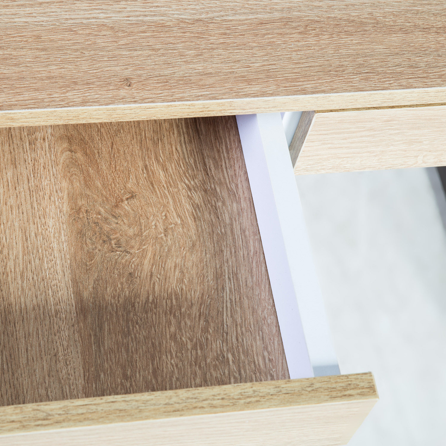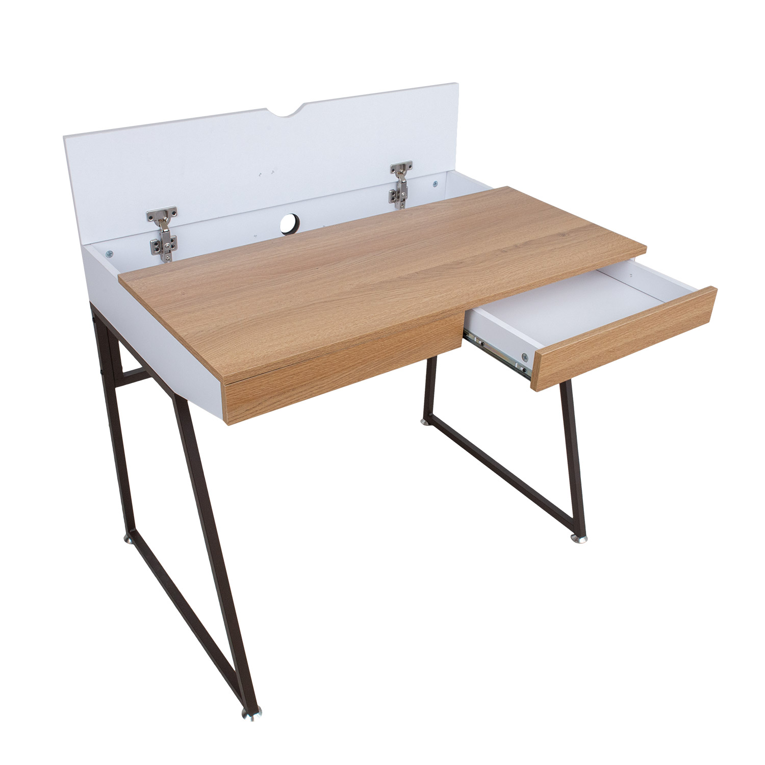 Rašomasis stalas STUDIJA 90x60xH76cm, ąžuolas. Rašomasis stalas yra būtinas bet kurių namų priedas, leidžiantis patogiau naudotis kompiuteriu arba susikurti praktišką namų biuro erdvę. Medžio atspalvio rašomasis stalas idealiai tinka naudoti namų aplinkoje, nes šilta medžiaga ir švelnūs tonai puikiai dera su įvairiais baldais. Stalas pagamintas iš melamino plokštės. Spalva – ąžuolo, balta. Metalinės kojos ir rėmas dažyti pilka milteline spalva. Stalas turi du stalčius su metaliniais vyriais ir viršuje atidaromą lentyną. Gaminio matmenys 90x60xH76 cm.
