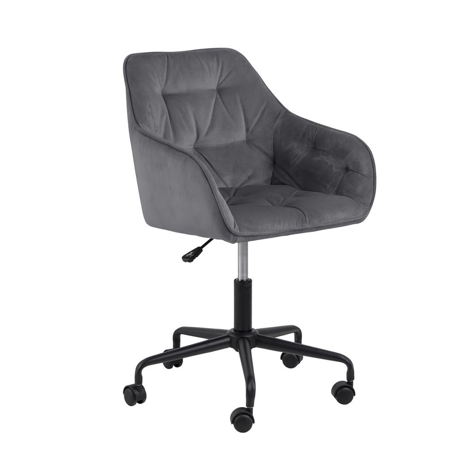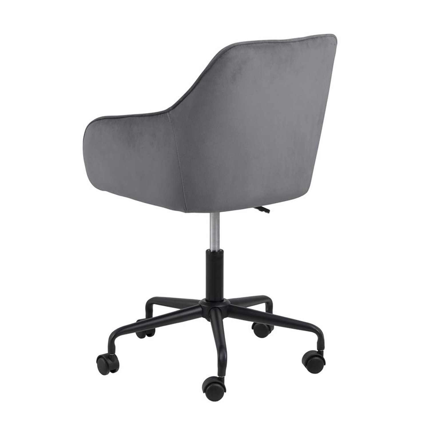 Darbo kėdė BROOKE 59x59xH89cm, tamsiai pilkas aksomas. Idealiai tinka ieškantiems patogumo ir stiliaus. Minkštas aksomas ir detalės suteikia kėdei prabangos pojūtį. Kėdė turi juodą metalinį pagrindą ir stabdomuosius ratukus. Sėdynės aukštis reguliuojamas nuo 46-55,5 cm. Audinys: 100 % poliesteris, Martindale > 25 000. Kojos: metalinės, juodos spalvos. PRIEŽIŪRA: priežiūra apsiriboja dulkių siurbliu ir dėmių šalinimu. Reikia atsargiai šalinti dėmes. Pirmiausia išbandykite dėmių šalinimo priemones mažiau matomoje vietoje ir atitinkamai elkitės. Niekada nenaudokite tirpiklių. Nestatykite baldų tiesioginiuose saulės spinduliuose. Pagrindą kasdien valykite sausu, muiluotu vandeniu ištrintu skudurėliu. Paviršių sausai nušluostykite šluoste, kad nerūdytų. Netrinkite paviršiaus kietais daiktais.