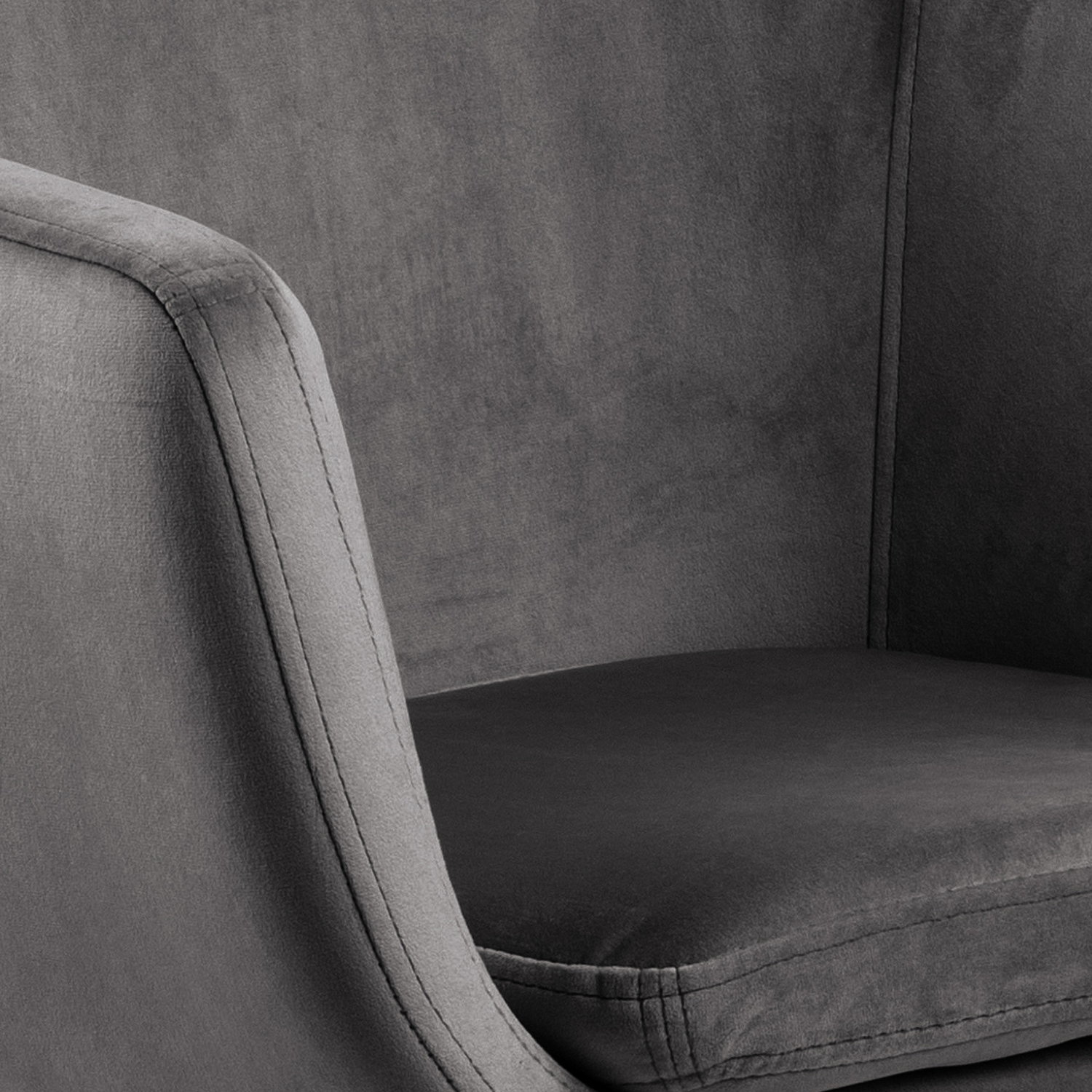 Darbo kėdė NORA tamsiai pilka. Ideali kėdė namų biurui. Klasikinio silueto, suteikianti šiuolaikiškumo. Dėl patogios minkštos sėdynės ir porankio ji idealiai tinka darbui namuose. Darbo kėdė turi reguliuojamo aukščio sėdynę ir pasukimo funkciją. Gražus aksominis audinys pasižymi išskirtiniu minkštumu ir suteikia kėdei gilumo. Sėdynė ir atlošas aptraukti tamsiai pilku audiniu. Kojų atrama yra iš juodo metalo. Kėdė turi plastikinius ratukus. Sėdynės aukštis 44-54 cm. Gaminio matmenys 58x58xH91 cm. PRIEŽIŪRA. Reikia atsargiai šalinti dėmes. Pirmiausia išbandykite dėmių šalinimo priemones mažiau matomoje vietoje ir atitinkamai elkitės. Niekada nenaudokite tirpiklių. Nestatykite baldų tiesioginiuose saulės spinduliuose. Pagrindą kasdien valykite sausu, muiluotu vandeniu ištrintu skudurėliu. Paviršių sausai nušluostykite šluoste, kad nerūdytų. Netrinkite paviršiaus kietais daiktais.