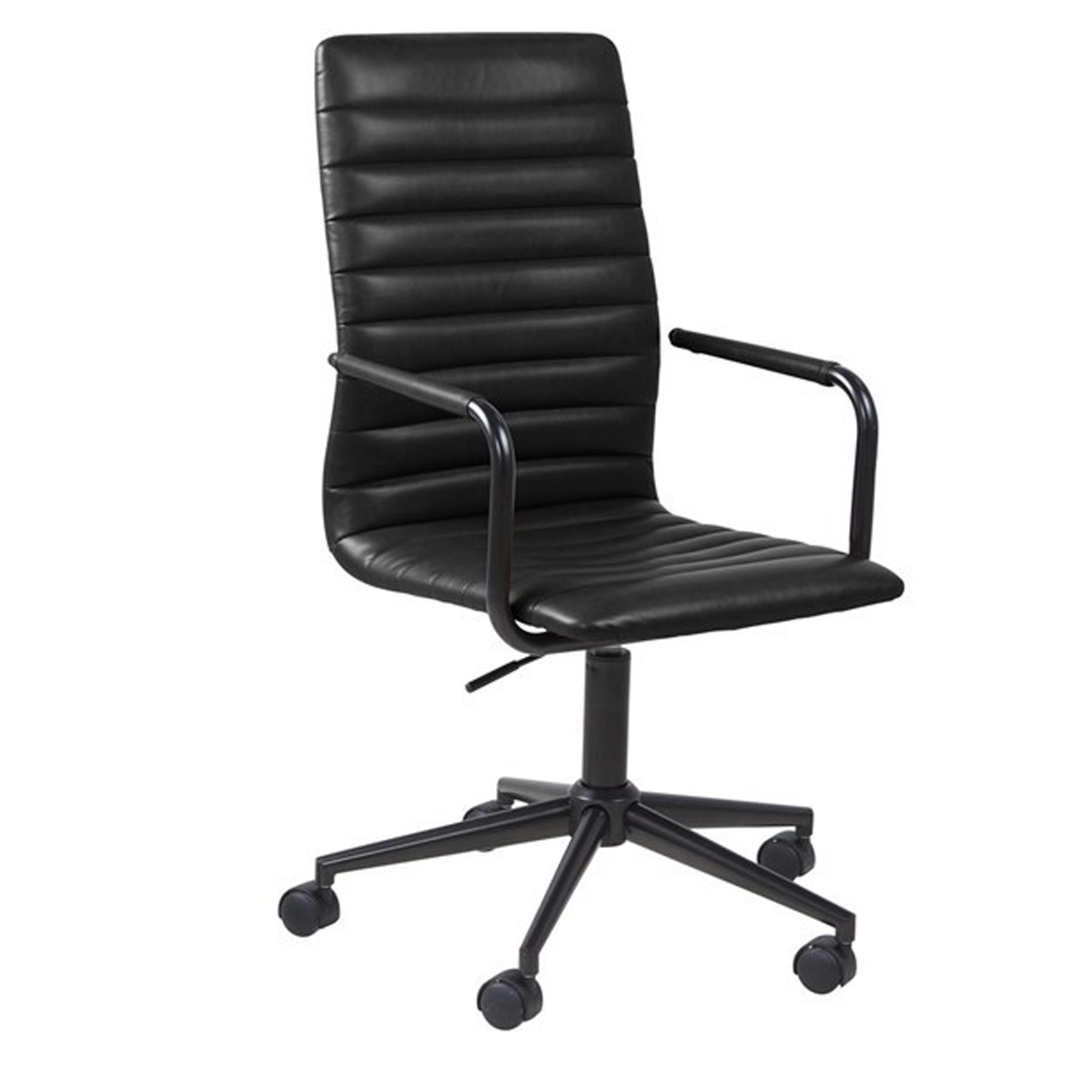 Darbo kėdė WINSLOW juoda PU. Sėdynė ir atlošas – juodos spalvos oda. Porankiai pagaminti iš metalo, aptraukti juoda zomša. Kojų atrama yra iš juodo metalo. Gaminio matmenys 45x58xH103 cm. Reguliuojamas sėdynės aukštis 42-52 cm.