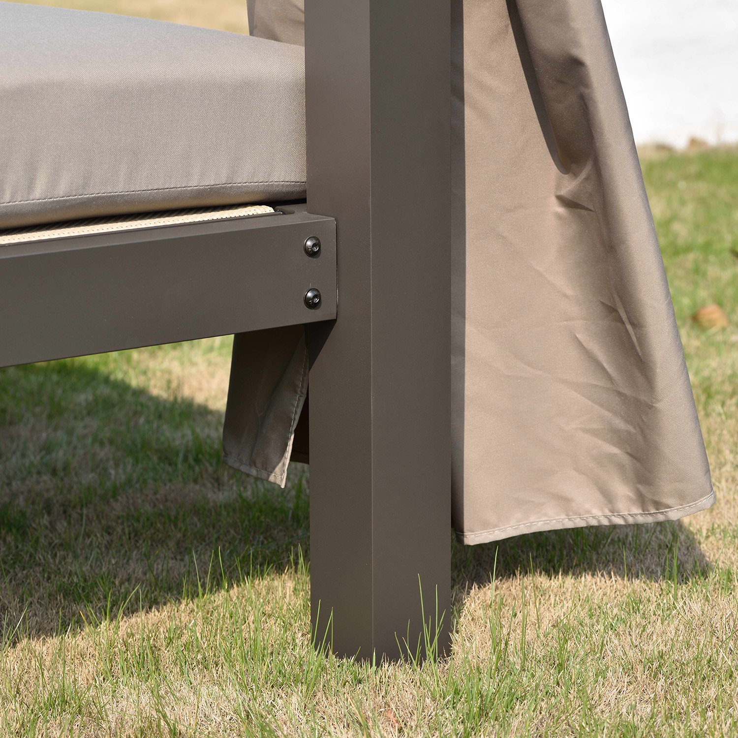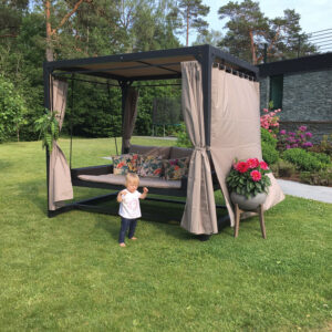 Lebola MOROCCO 200x188xH210cm, rudos spalvos/bee˛. Mėgaukitės vasara ir atsipalaiduokite neišeidami iš namų! Modernaus dizaino erdvi lebola puikiai papildo įprastus sodo baldus. Tvirta pagrindinė lebolos konstrukcija pagaminta iš plieno ir nudažyta tamsiai rudais milteliniais dažais. Poliesterio audeklo stogas ir šoninės užuolaidos suteikia malonų pavėsį nuo saulės. Šezlongas „Lebola” padalytas į dvi lygias dalis, kurių atlošai gali būti reguliuojami nepriklausomai vienas nuo kito. Atlošai reguliuojami keturiomis padėtimis. Šezlongo pagrindas pagamintas iš tekstileno, kuris praleidžia orą, greitai džiūsta ir yra lengvai prižiūrimas. Minkštos pagalvėlės užtikrina tikrą naudojimo komfortą. Pagalvėlių užvalkalai pagaminti iš poliesterio audinio. Vienos pagalvėlės matmenys 85/115x88xH12 cm. Plieninio rėmo atraminio stulpelio matmenys 80×80 mm. Sėdynės aukštis iki rėmo krašto yra 40 cm, su pagalve – 52 cm. Atlošo ilgis yra 77 cm. Ribinis svoris 200 kg. Gaminys labai atsparus besikeičiančioms oro sąlygoms ir lengvai prižiūrimas. Tik pagalvėles ir baldakimą reikia apsaugoti nuo atmosferos poveikio. Pagalvių dėžė yra geras sprendimas čiužiniams kasdien laikyti ir išlaikyti juos sausus. Norėdami prailginti lauko baldų tarnavimo laiką, rekomenduojame naudoti lauko baldų užvalkalus. Galima įsigyti specialų užvalkalą, skirtą MOROCCO bendrabučiams, kodas 13260. Smarkaus lietaus atveju pasirūpinkite, kad ant stogo nesikauptų per daug vandens. PRIEŽIŪRA: pasibaigus vasaros sezonui, rekomenduojame išardyti ir laikyti sausoje ir gerai vėdinamoje patalpoje.