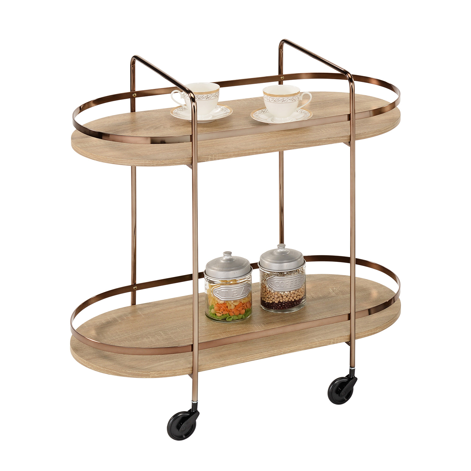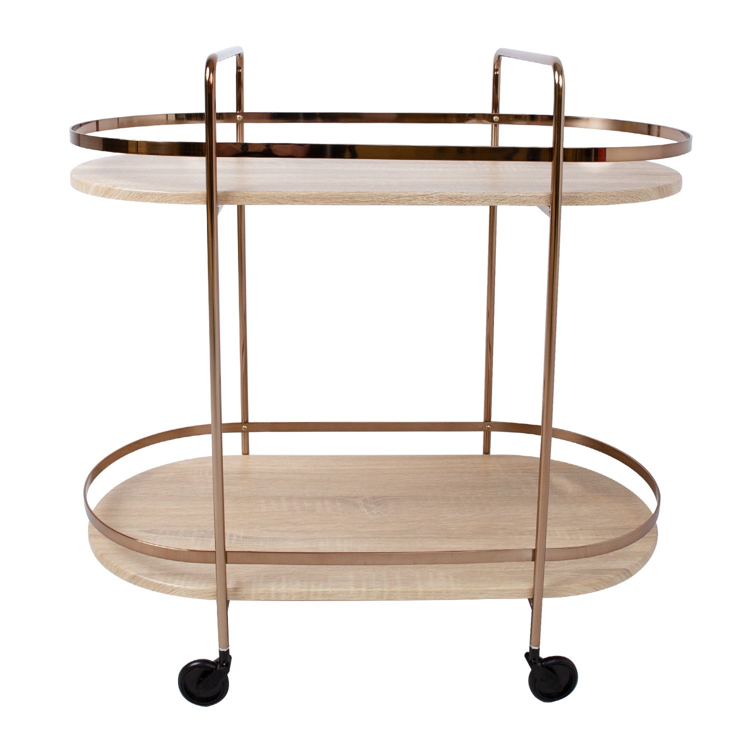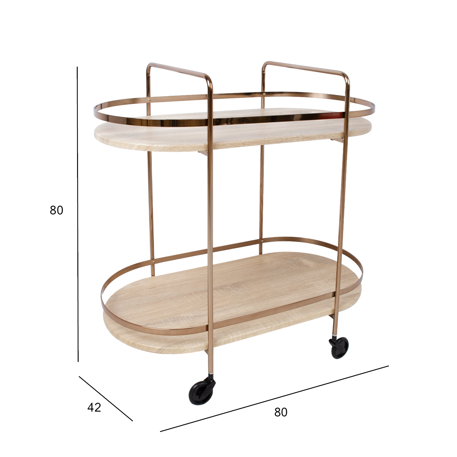 Serviruojamasis stalas GENOVA šviesiai rudos spalvos. Šis skoningas ir patogus serviravimo staliukas pravers kasdien, taip pat palengvins svečių priėmimą namuose. Stalo lentynos pagamintos iš ąžuolo dengto laminato. Plieniniai vamzdžiai apdailinti elegantiška amplua spalva. Serviruojamasis stalas turi keturis ratukus, kad būtų galima lengvai judėti. Stalo matmenys 80x42xH80 cm.