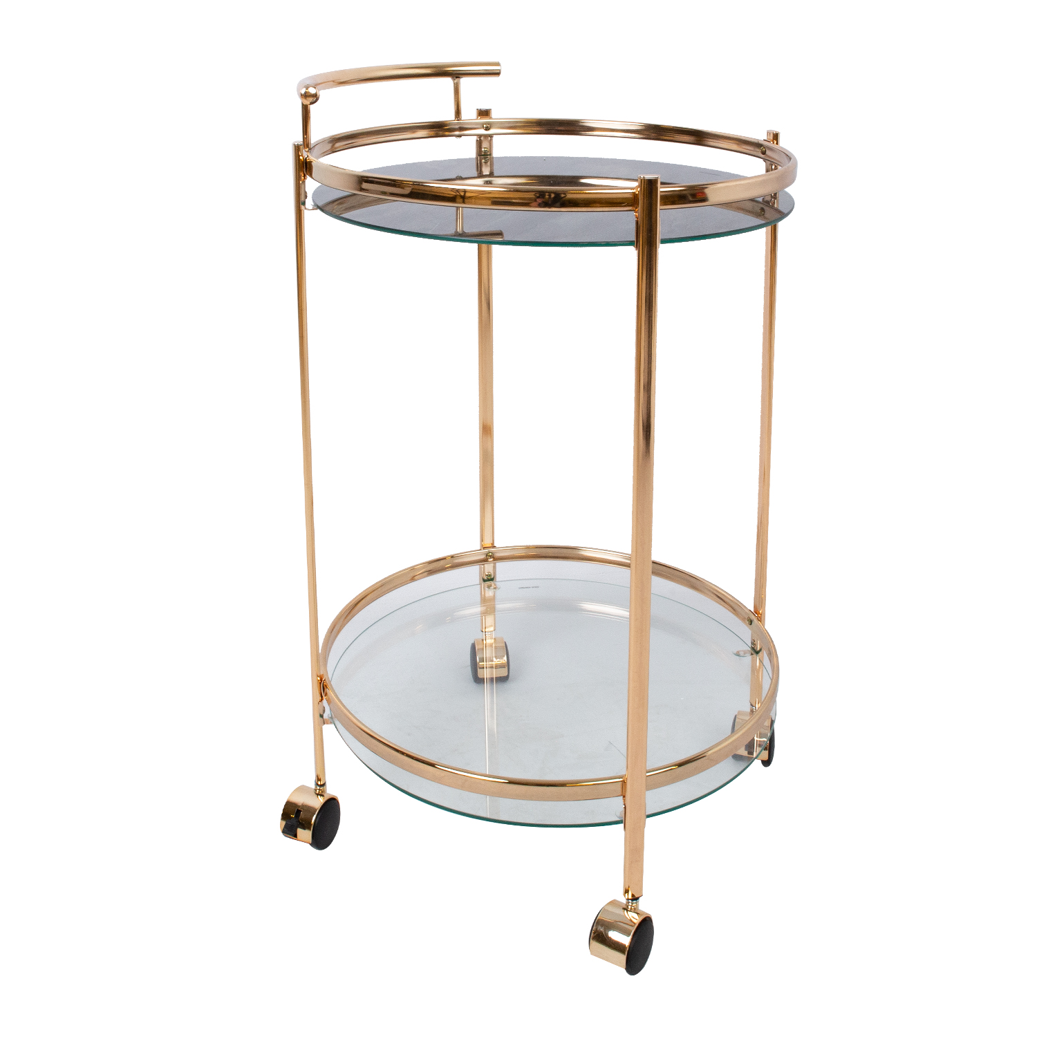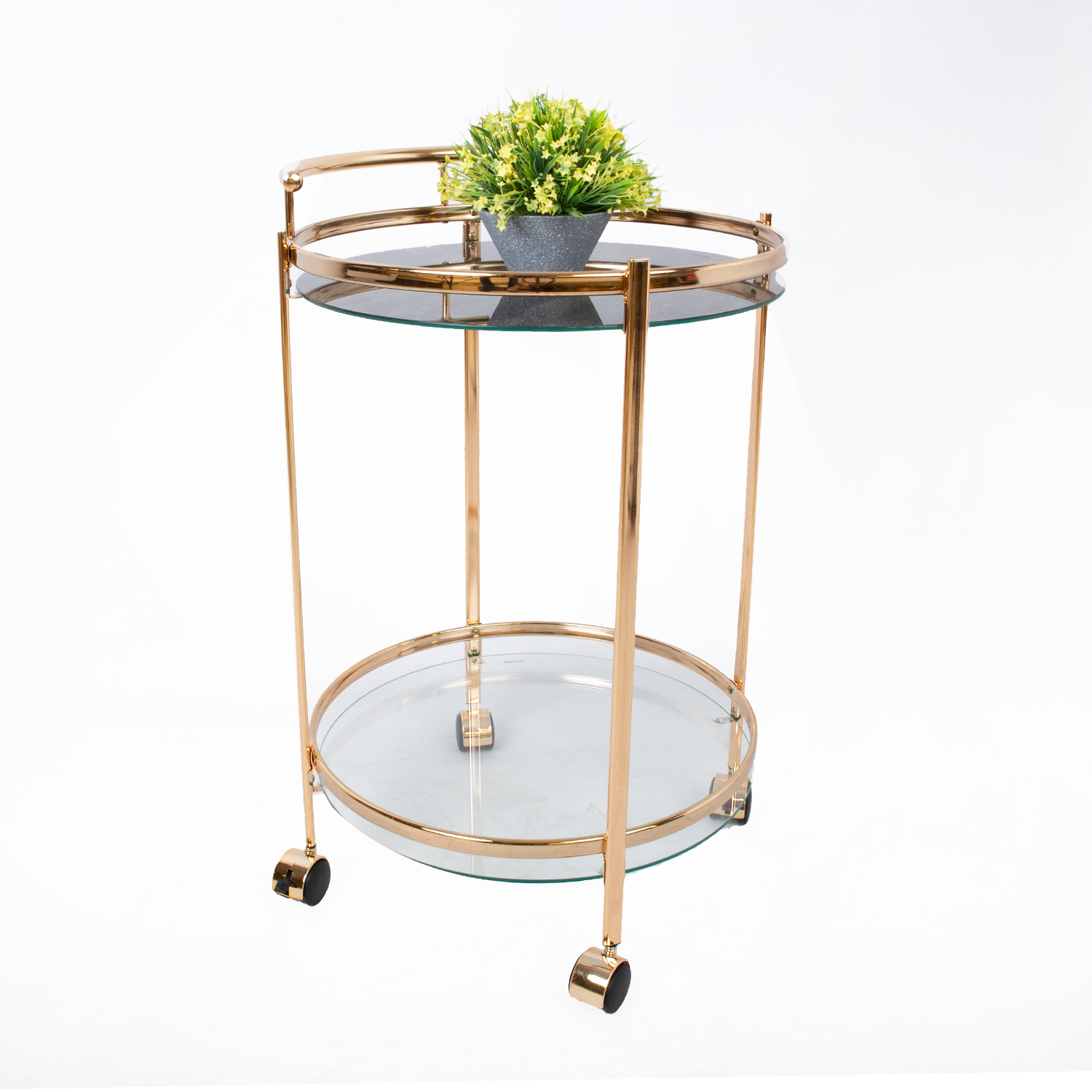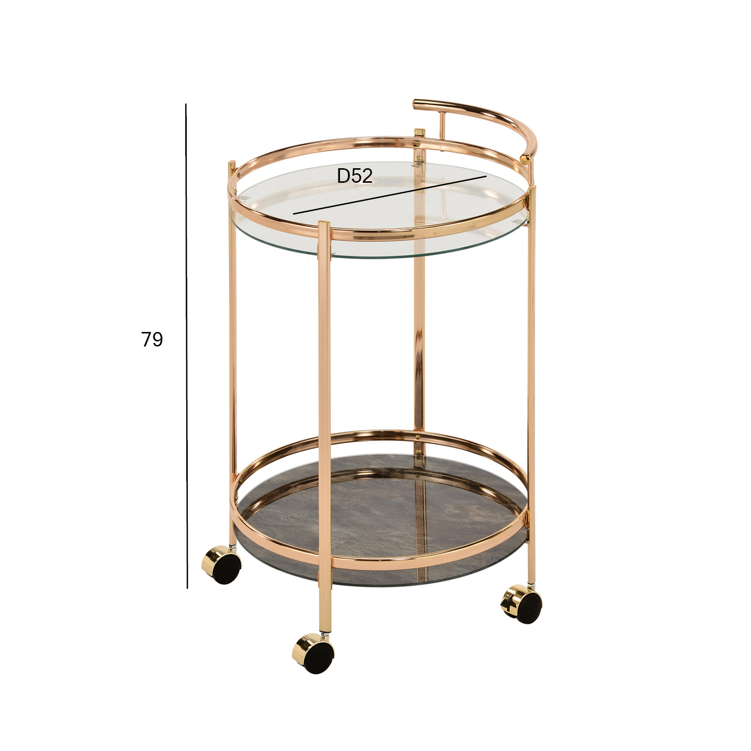 Auksinis serviravimo stalas GENUA. Šis skoningas ir patogus serviravimo staliukas pravers kasdien, taip pat palengvins svečių priėmimą namuose. Lentynos pagamintos iš 5 mm storio grūdinto stiklo. Viršutinė lentyna yra skaidri, o apačia padengta prabangiu marmuro raštu. Plieniniai vamzdžiai apdailinti elegantišku aukso spalvos atspalviu. Padėklas serviravimui turi keturis ratukus, kad būtų lengva judėti. Stalo matmenys D52xH79 cm.