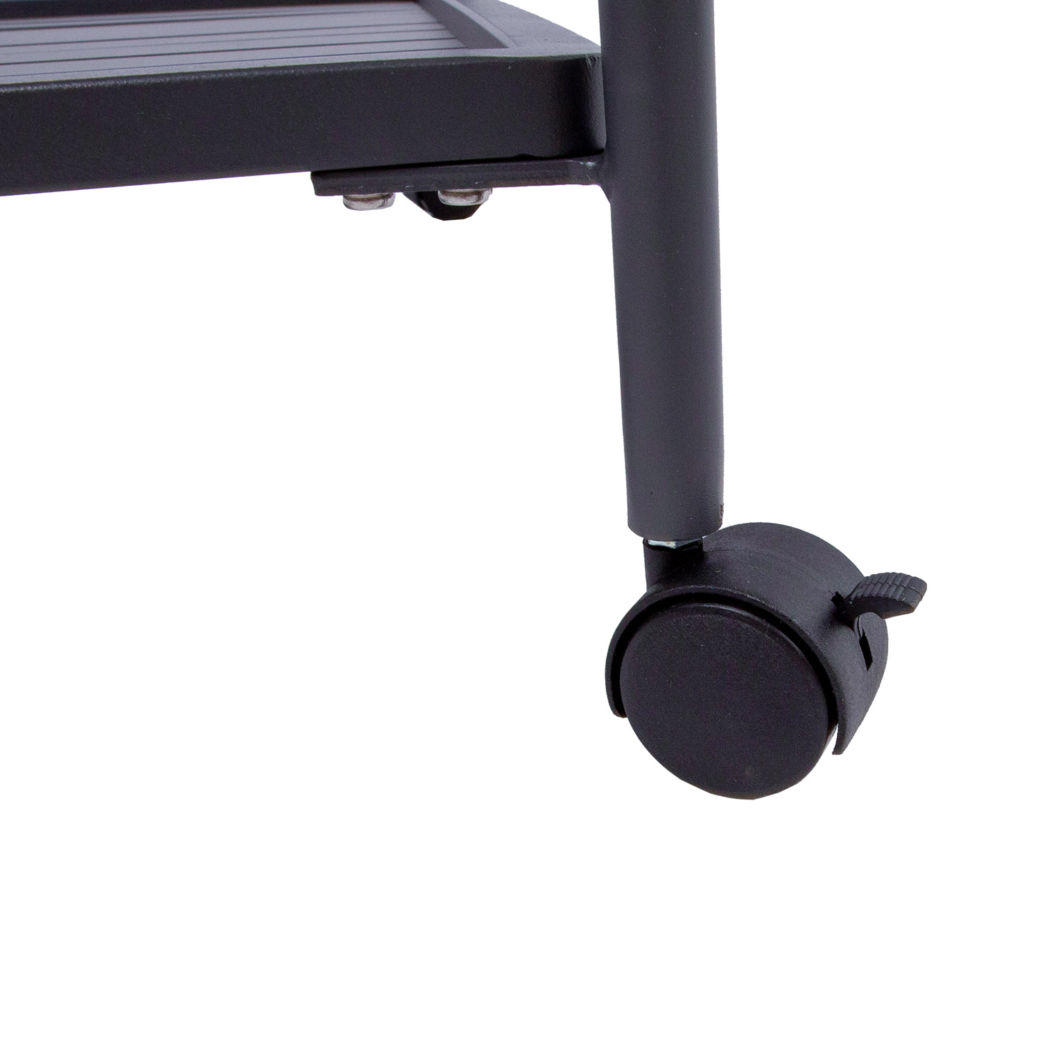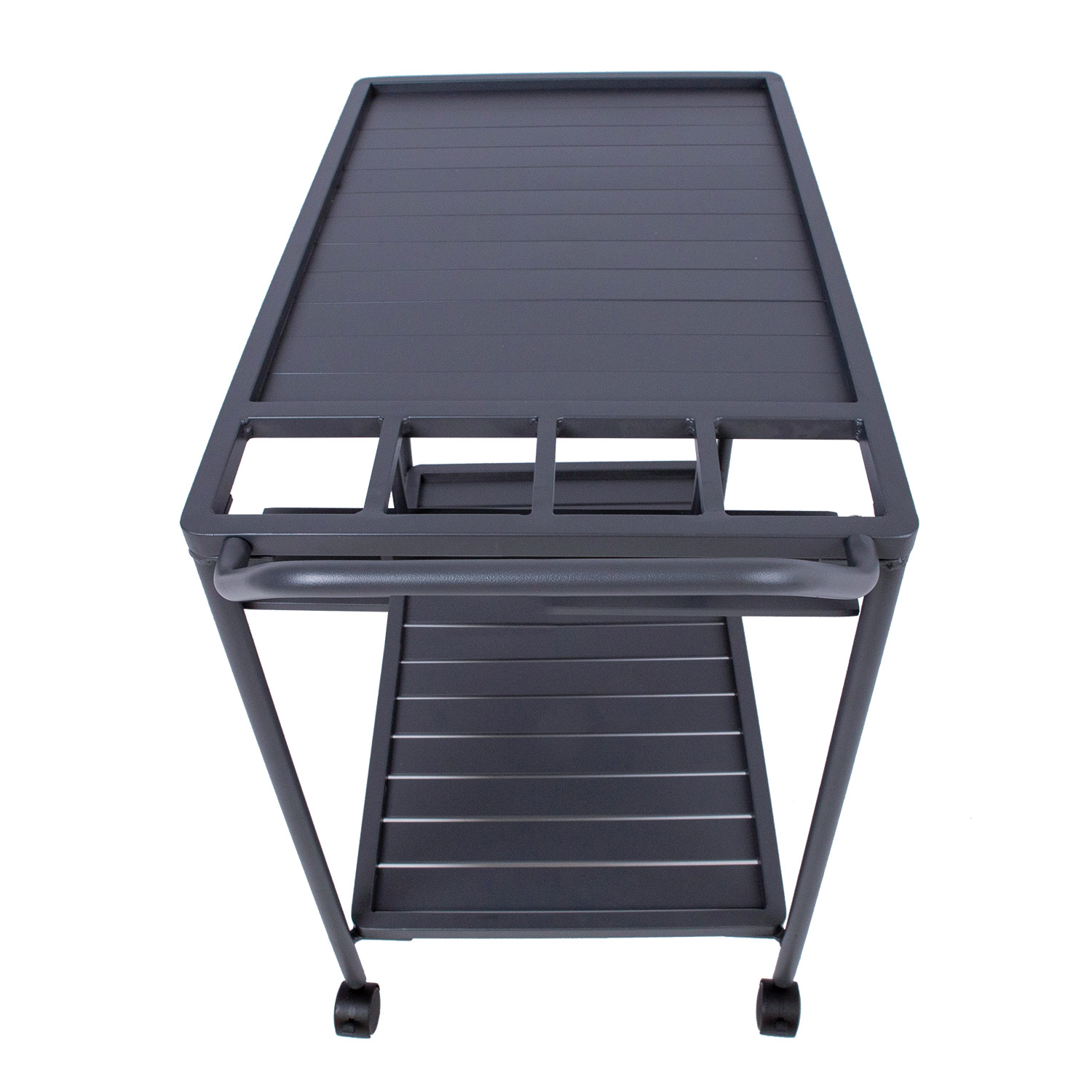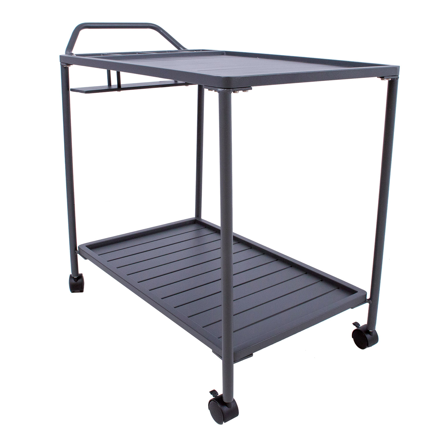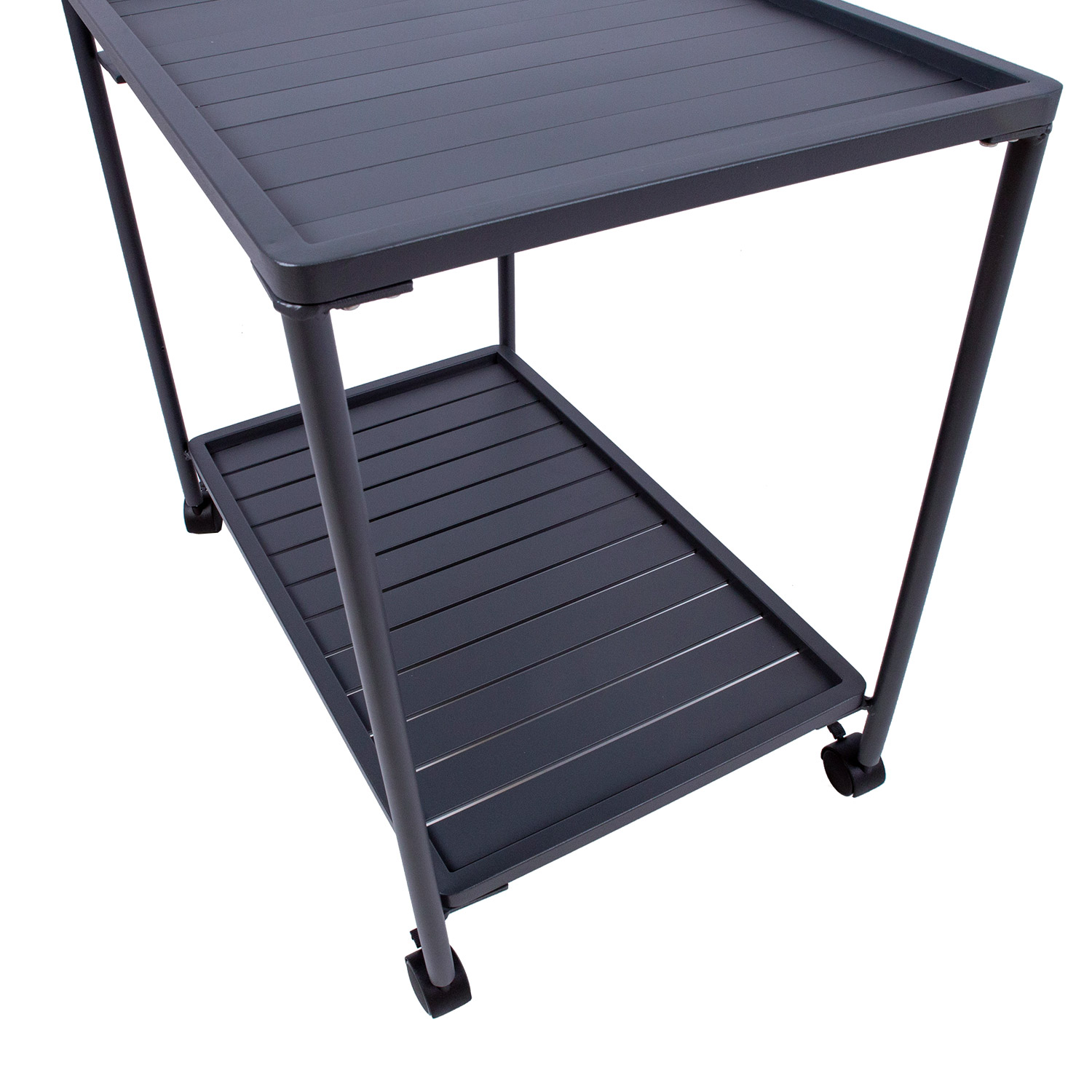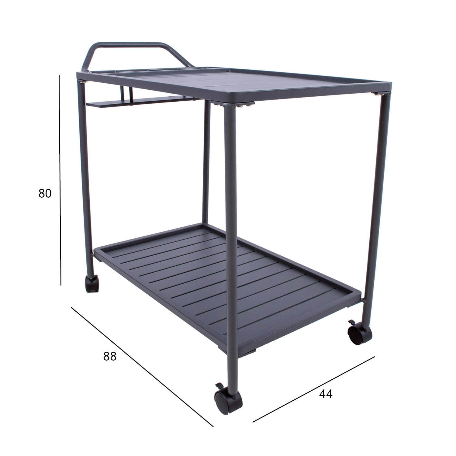 Serviruojamasis stalas MAGIC 88x44xH80cm, tamsiai pilkos spalvos. Stalo stalviršiai ir rėmas pagaminti iš aliuminio ir padengti tamsiai pilka milteline danga. Serviruojamasis stalas turi užrakinamus ratukus. Gaminys atsparus atmosferos poveikiui.