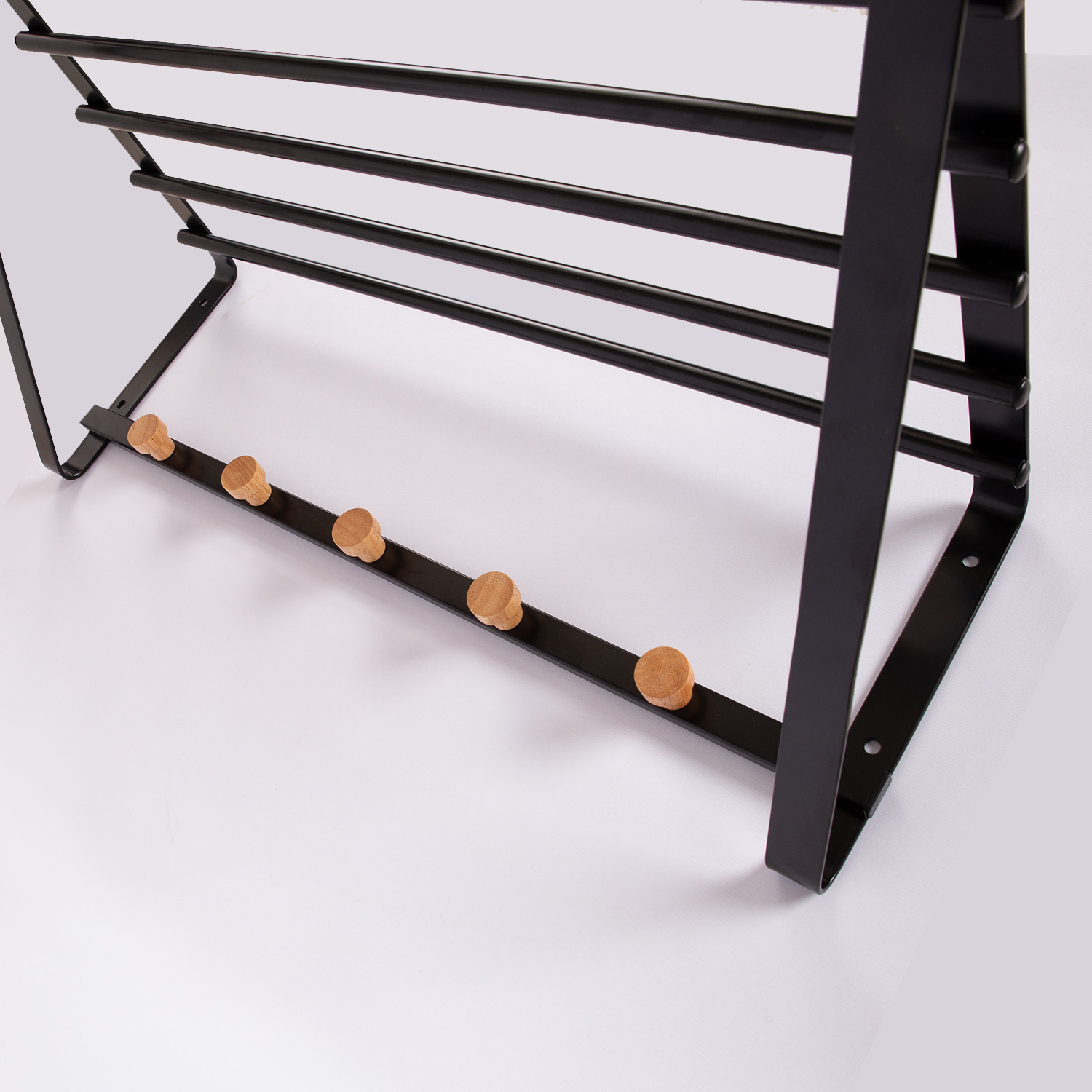 Sieninis pakabukas – lentynėlė FOREST 60x33x20cm, juodos spalvos. Medžiaga: plieninis vamzdis, padengtas juoda milteline danga. 5 mediniai kabliukai.