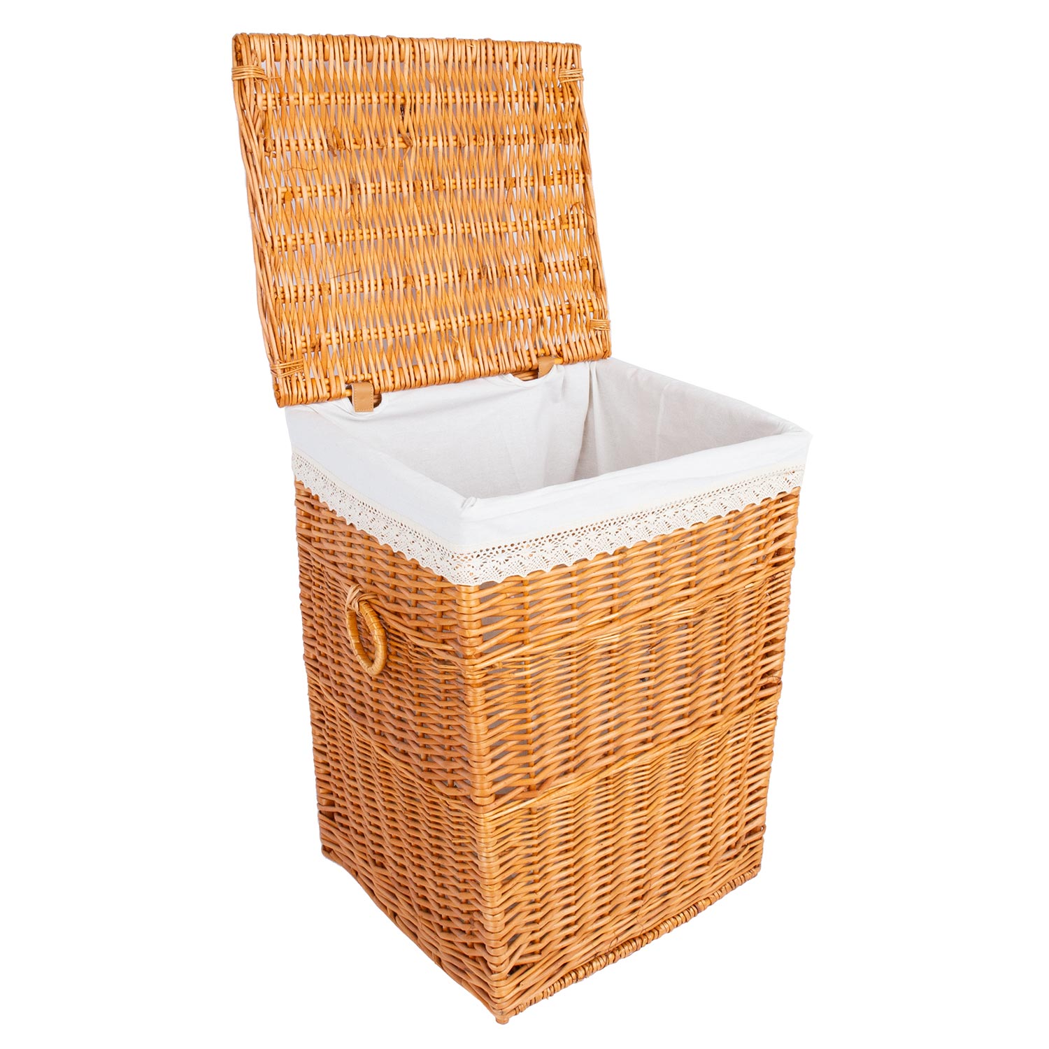 Skalbinių krepšys MAX-1, 44x39xH59cm, rudos spalvos, nėriniai. Krepšelio medžiaga: natūrali pintinė, lakuota. Tekstilės pamušalas: medvilnė su nėriniais.