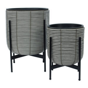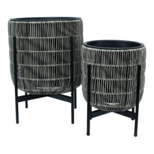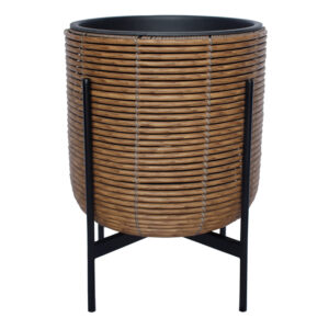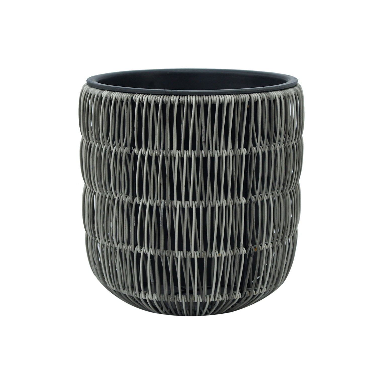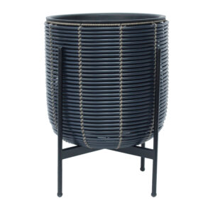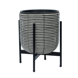 Gėlių vazonas WICKER D27xH28cm, pilkos spalvos. Metalinis vazonas karkasas padengtas plastikiniu pynimu. Vidinio plastikinio maišelio matmenys D23xH23cm. Vidinis vazonas neturi skylės.