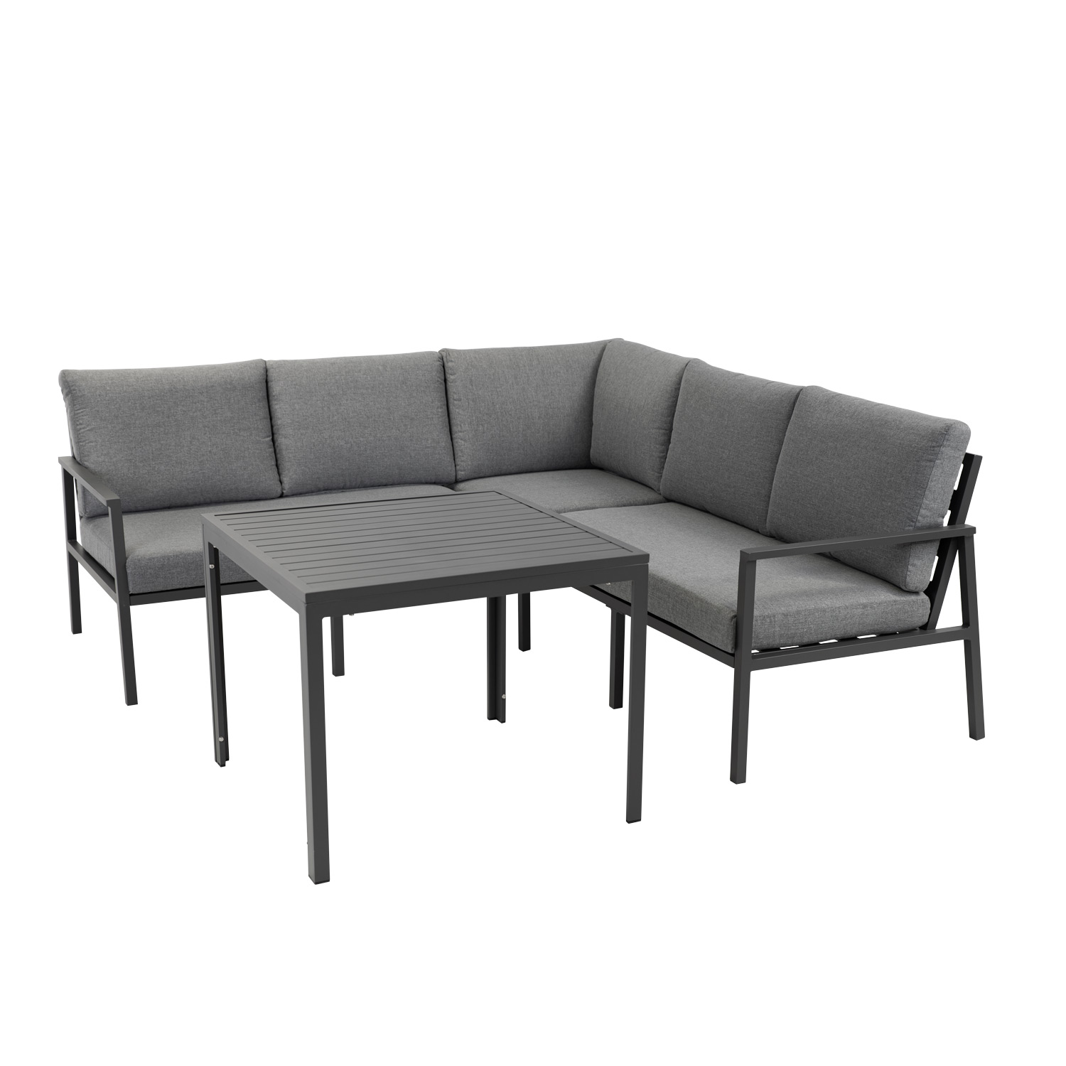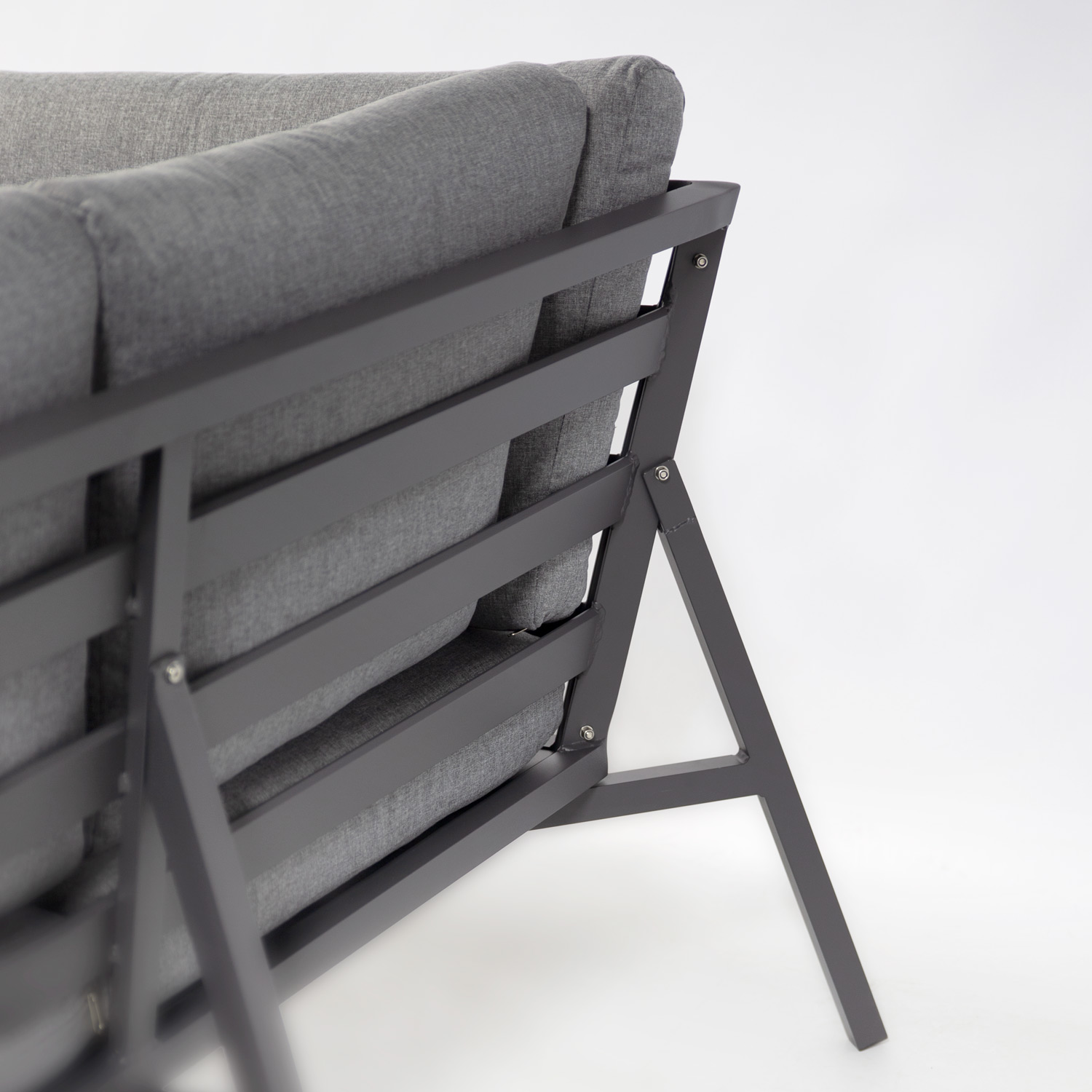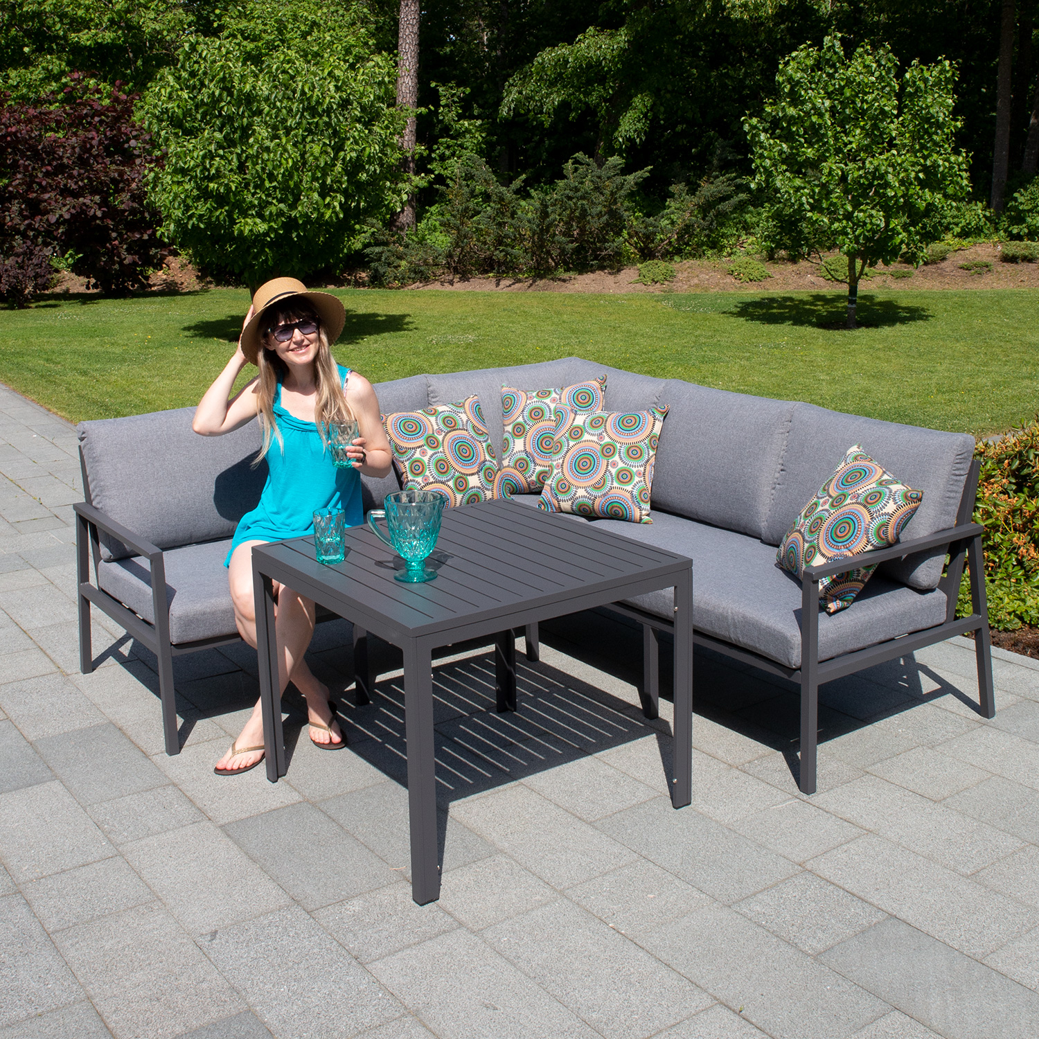 Sodo baldų komplektas ADRIAN stalas ir kampinė sofa, pilkos spalvos. Visų komplekto dalių pagrindinė konstrukcija ir stalo stalviršis pagamintas iš aliuminio ir nudažyti pilkais milteliniais dažais. Stalo matmenys 81x81xH65 cm. Kampinę sofą sudaro dvi dalys, kurių matmenys 205x80xH78 cm ir 197x80xH78 cm. Į komplektą įeina 3 sėdimosios pagalvėlės ir 6 atlošo pagalvėlės. Pagalvėlės pagamintos iš pilko poliesterio audinio. Sėdimųjų pagalvių storis 10 cm, atlošų pagalvių storis 8 cm. Gaminys labai atsparus besikeičiančioms oro sąlygoms ir lengvai prižiūrimas. Tik pagalvėles reikia apsaugoti nuo atmosferos poveikio. Norėdami prailginti lauko baldų tarnavimo laiką, rekomenduojame naudoti lauko užvalkalus. PRIEŽIŪRA: pasibaigus vasaros sezonui, rekomenduojame sodo baldus laikyti patalpoje. Jei plaktuko sezonui, rekomenduojame palikti baldus sode žiemos mėnesiais. Sandėliavimui naudokite sausą ir gerai vėdinamą patalpą.