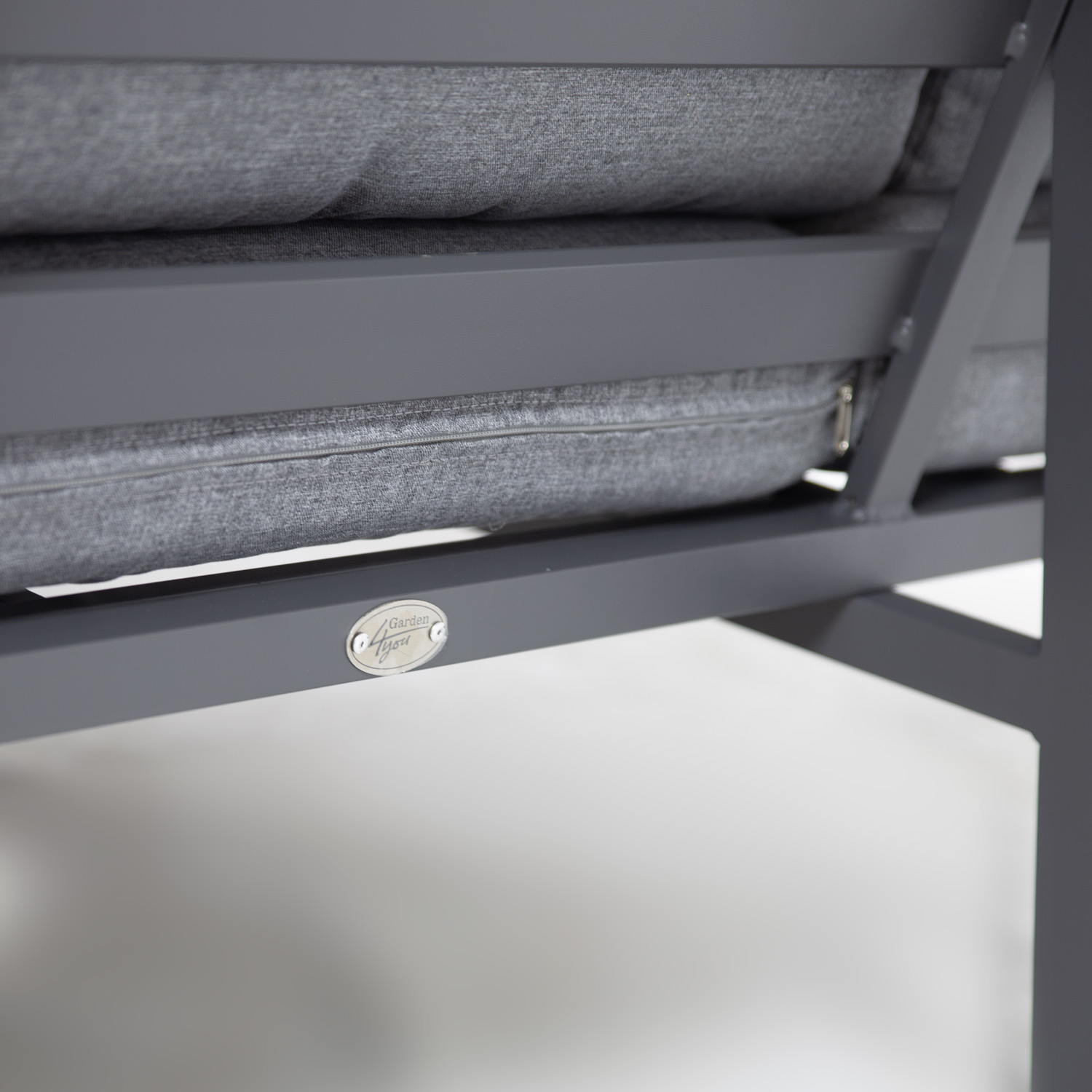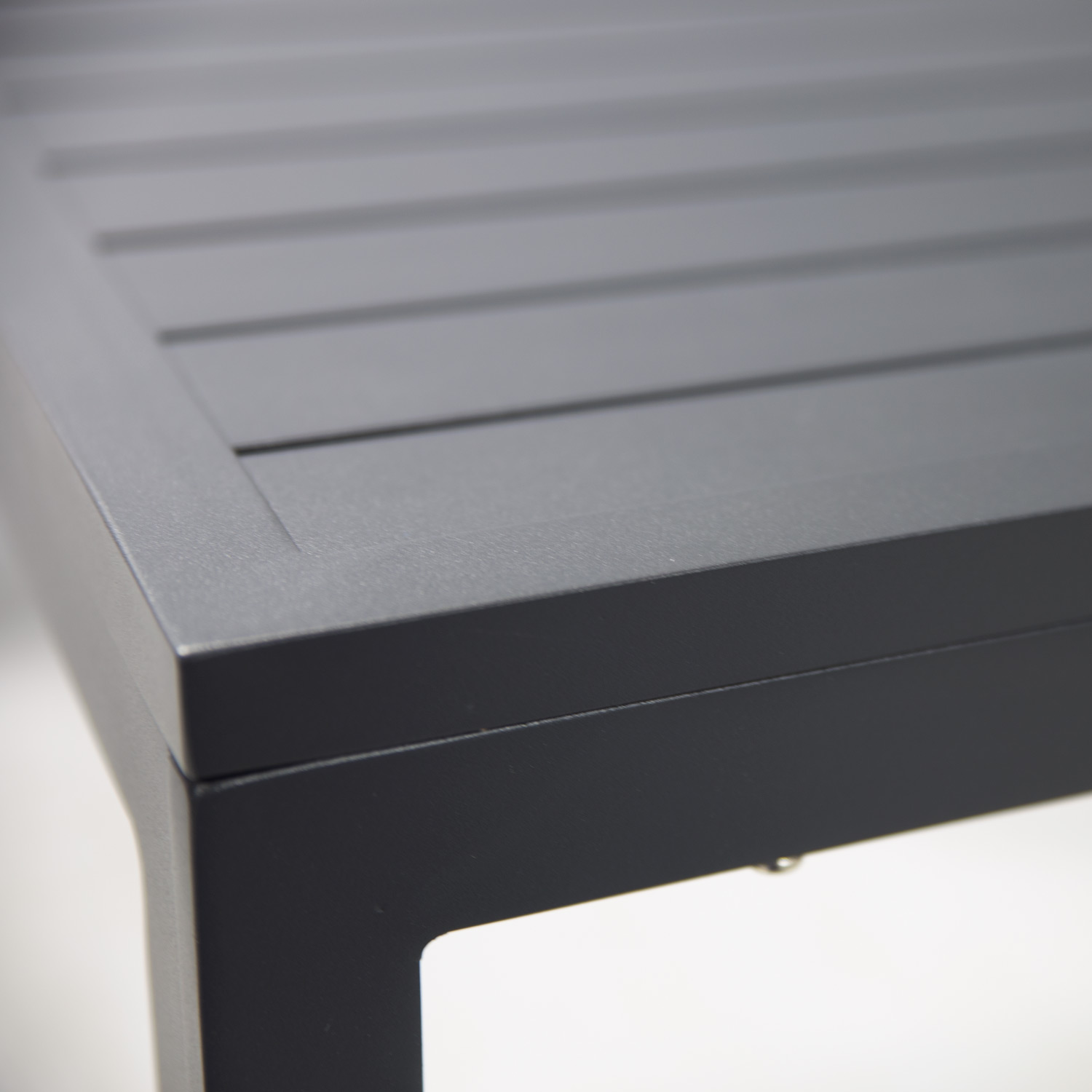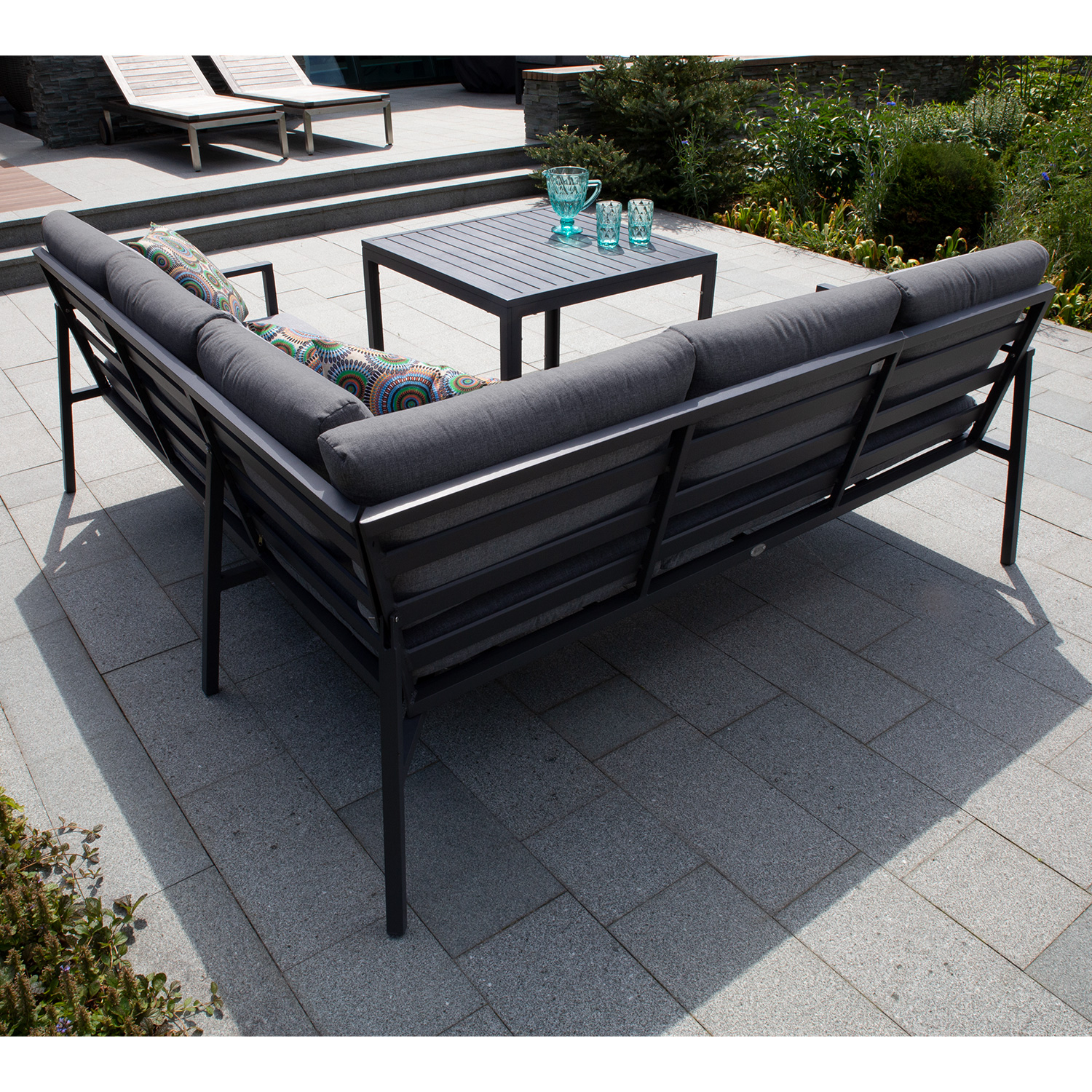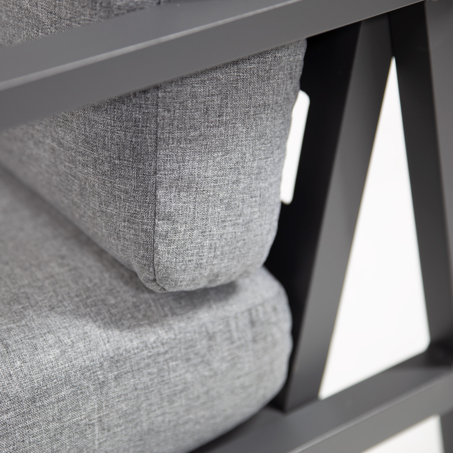 Sodo baldų komplektas ADRIAN stalas ir kampinė sofa, pilkos spalvos. Visų komplekto dalių pagrindinė konstrukcija ir stalo stalviršis pagamintas iš aliuminio ir nudažyti pilkais milteliniais dažais. Stalo matmenys 81x81xH65 cm. Kampinę sofą sudaro dvi dalys, kurių matmenys 205x80xH78 cm ir 197x80xH78 cm. Į komplektą įeina 3 sėdimosios pagalvėlės ir 6 atlošo pagalvėlės. Pagalvėlės pagamintos iš pilko poliesterio audinio. Sėdimųjų pagalvių storis 10 cm, atlošų pagalvių storis 8 cm. Gaminys labai atsparus besikeičiančioms oro sąlygoms ir lengvai prižiūrimas. Tik pagalvėles reikia apsaugoti nuo atmosferos poveikio. Norėdami prailginti lauko baldų tarnavimo laiką, rekomenduojame naudoti lauko užvalkalus. PRIEŽIŪRA: pasibaigus vasaros sezonui, rekomenduojame sodo baldus laikyti patalpoje. Jei plaktuko sezonui, rekomenduojame palikti baldus sode žiemos mėnesiais. Sandėliavimui naudokite sausą ir gerai vėdinamą patalpą.