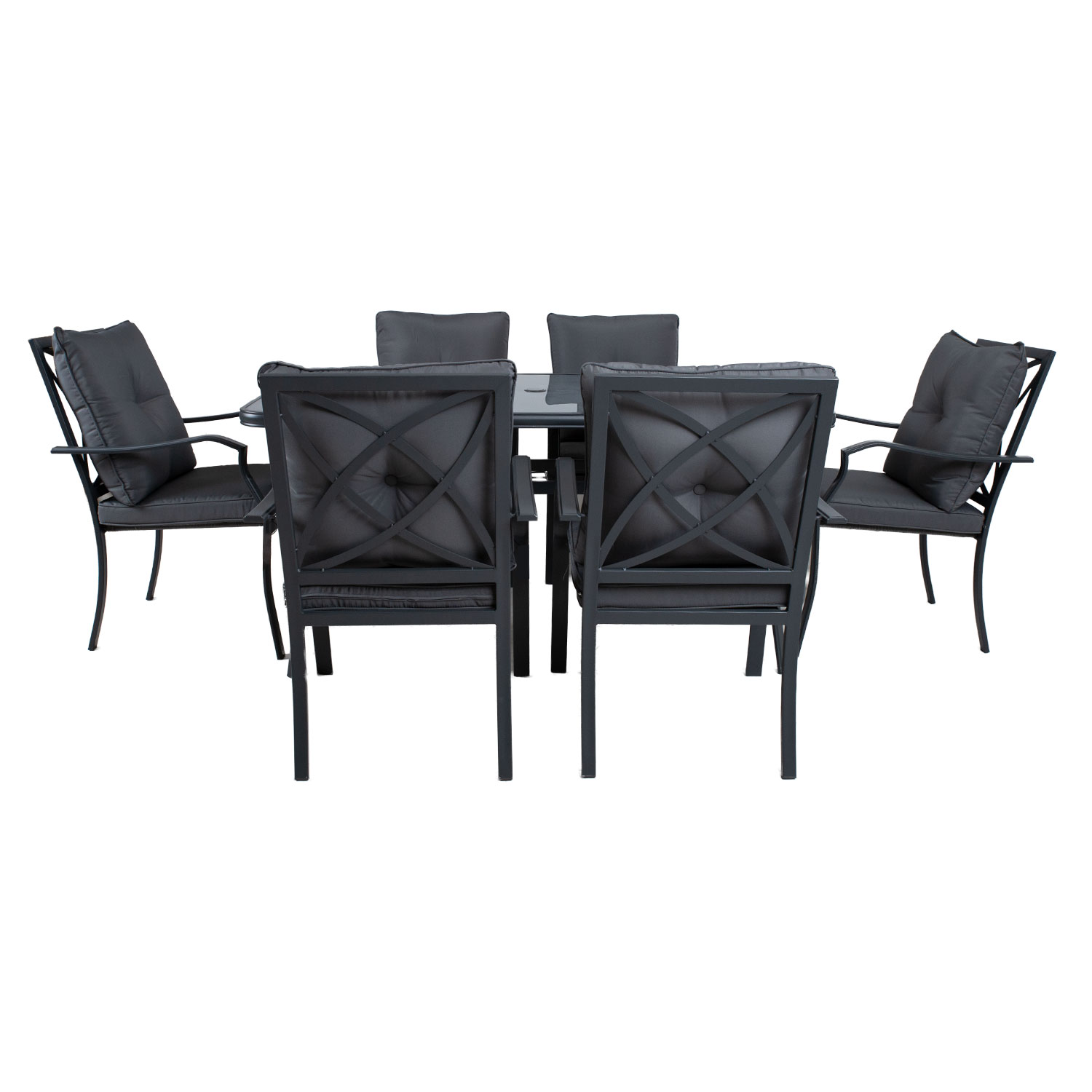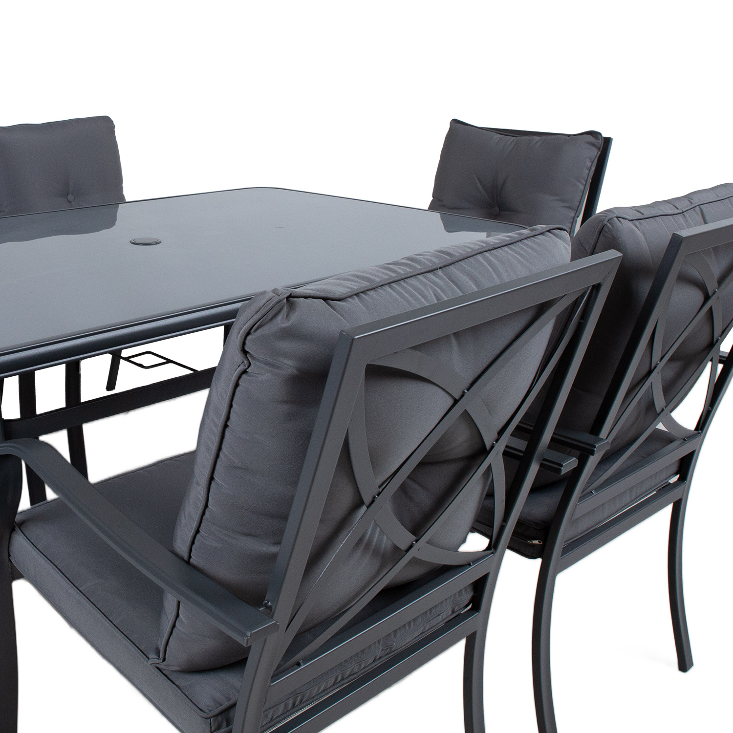 Sodo baldų komplektas BOSLER stalas ir 6 kėdės. Stalo ir kėdžių rėmai pagaminti iš plieno ir nudažyti pilka milteline danga. Stalo matmenys: 150x90xH72 cm, stalviršis: 5 mm pilkas grūdintas stiklas. Stalo viduryje yra skylė D4 cm skėčiui nuo saulės uždengti. Kėdės matmenys 56x63xH86 cm, sėdynės aukštis iki rėmo krašto yra 38,5 cm. Porankio aukštis nuo žemės yra 62 cm. Kėdės sėdynės pagrindas aptrauktas pilku tekstiliniu audiniu, kuris gerai praleidžia orą, greitai džiūsta ir yra lengvai valdomas. Minkštos sėdynės pagalvėlės aptrauktos pilku poliesterio audiniu. Sėdynės pagalvėlės matmenys 48x48xH7 cm, atlošo pagalvėlės matmenys 50x50x15 cm. Kėdės gali būti sukraunamos viena ant kitos. Gaminys atsparus besikeičiančioms oro sąlygoms ir labai lengvai prižiūrimas. PRIEŽIŪRA: pasibaigus vasaros sezonui, rekomenduojame sodo baldus laikyti patalpoje. Vasaros sezonui, baldus reikėtų laikyti sode. Prieš laikydami baldus išvalykite ir išdžiovinkite. Sandėliavimui naudokite sausą ir gerai vėdinamą patalpą.