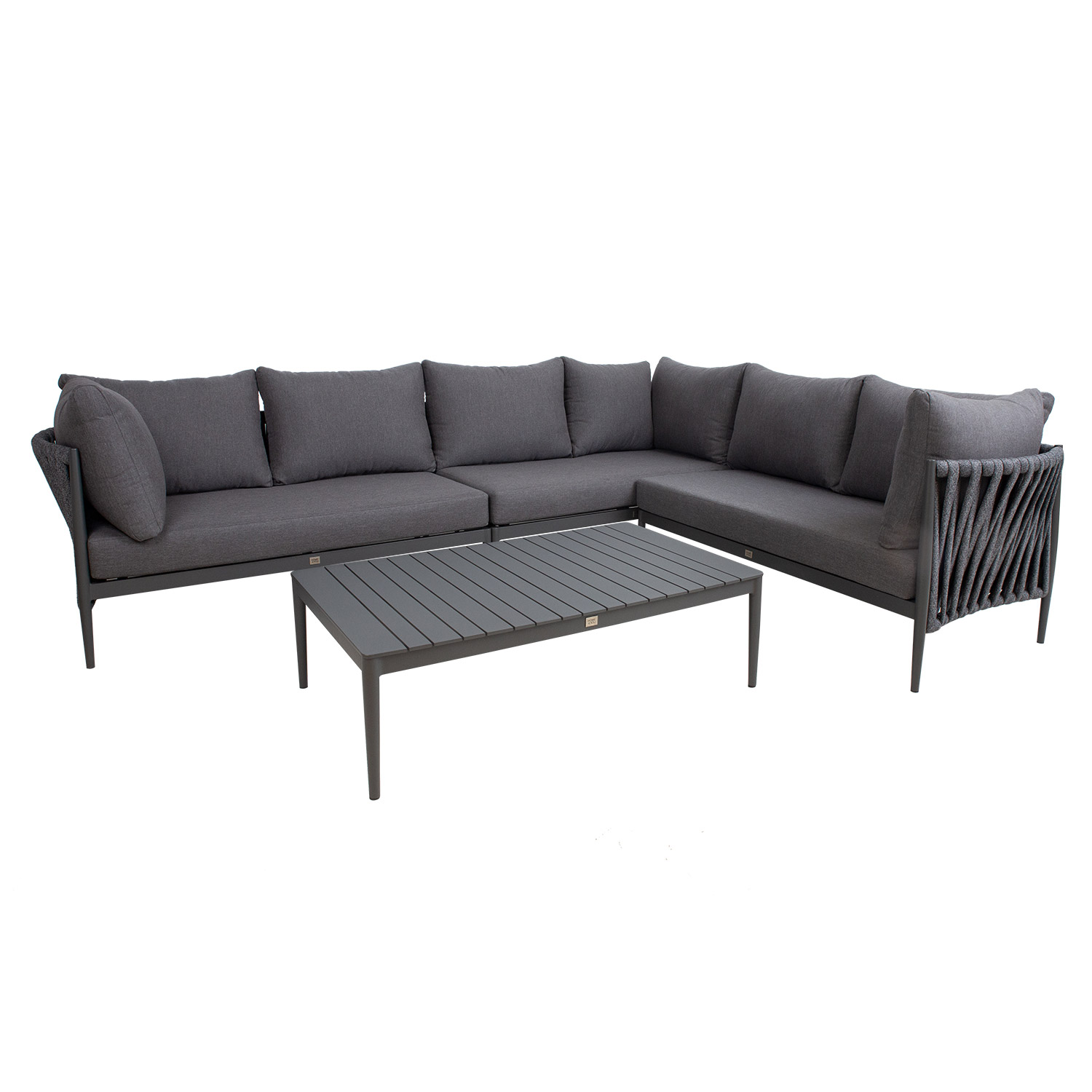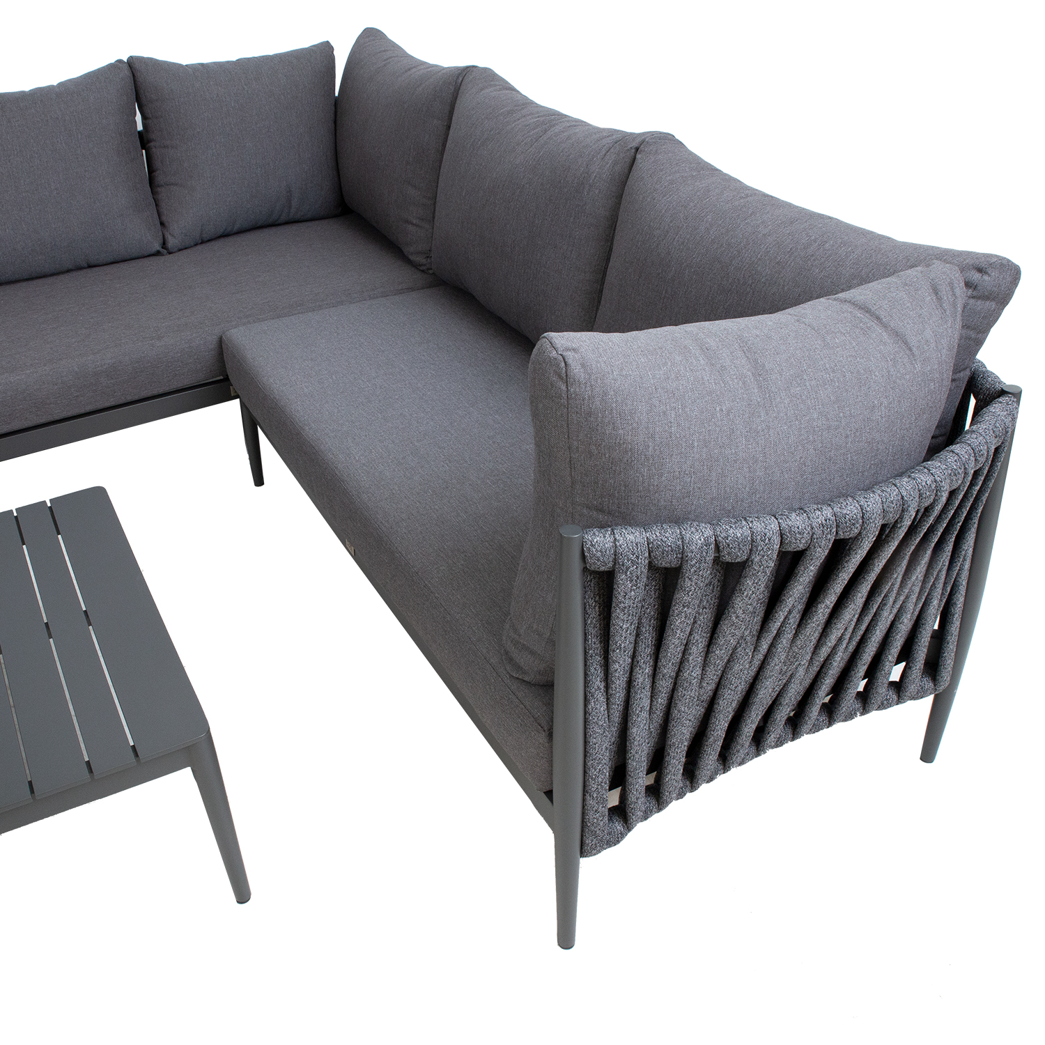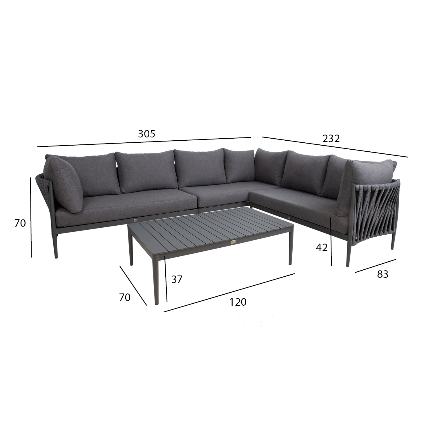 Sodo baldų komplektas BREMEN stalas ir kampinė sofa, pilkos spalvos. Kampinę sofą sudaro trys 2 vietų dalys. Sofos aliuminio rėmas, padengtas pilku milteliniu būdu dažytu aliuminiu, padengtas įspūdingu virvių pynimu. Į komplektą įeina pagalvėlės. Pagalvėlės pagamintos iš pilko poliesterio audinio. Stalo stalviršis ir rėmas pagaminti iš aliuminio. Sofos 2 vietų sekcijos matmenys yra 152x83xH71 cm. Stalo matmenys 120x70xH37 cm. Sofos moduliai tiekiami su jungiamaisiais laikikliais. Gaminys yra patvarus kintamomis oro sąlygomis ir lengvai prižiūrimas. Tik pagalvėles reikia apsaugoti nuo atmosferos poveikio. Rekomenduojame naudoti lauko baldų užvalkalus, kad prailgintumėte lauko baldų tarnavimo laiką. PRIEŽIŪRA: pasibaigus vasaros sezonui, rekomenduojame sodo baldus laikyti patalpoje. Pasibaigus vasaros sezonui, rekomenduojame palikti baldus sode žiemos mėnesiais. Sandėliavimui naudokite sausą ir gerai vėdinamą patalpą.