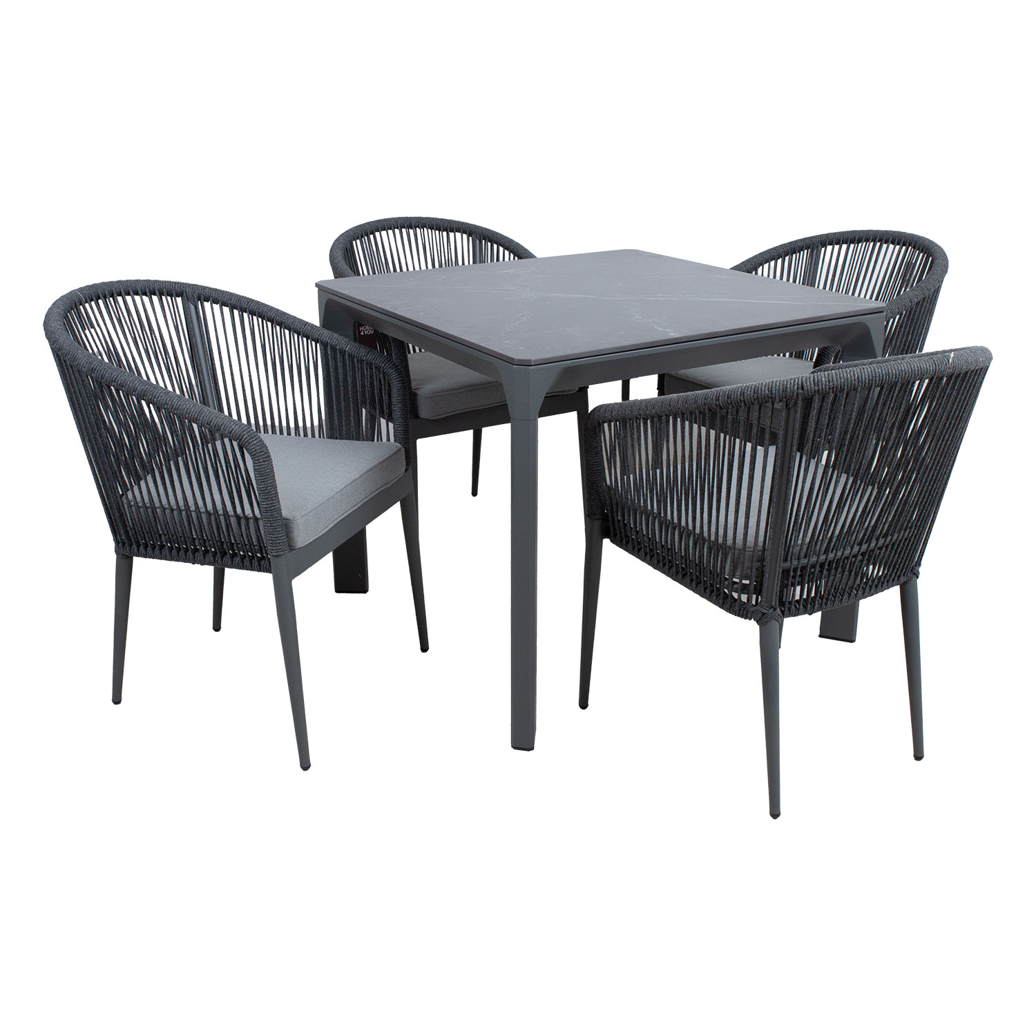 Sodo baldų komplektas CARVES stalas ir 4 kėdės. CARVES stalas sujungia minimalistinį dizainą ir naujoviškas technologijas. Sukepintas akmens stalviršis pagamintas naudojant naujovišką technologiją, kuri imituoja natūralaus akmens susidarymo procesą žemės plutos gelmėse. Kaolino arba porcelianinio molio dalelės apdorojamos 1200 laipsnių pagal Celsijų temperatūroje, todėl gaunama medžiaga, savo savybėmis ir išvaizda primenanti natūralų akmenį. Ji plona, bet labai tvirta (santykinis kietumas pagal Moso skalę – 7), patvari, atspari aukštai temperatūrai ir atmosferos poveikiui, atspari dėmėms, ją labai lengva valyti ir prižiūrėti. Kadangi nenaudojamos cheminės rišamosios medžiagos, ši medžiaga yra higieniška. DĖMESIO! Venkite smūgių, atsitrenkimų ir kritimų. Stalo matmenys yra 90x90xH75 cm, stalviršio storis – 11 mm. Stalo ir kėdžių kojos bei rėmas pagaminti iš aliuminio ir nudažyti pilkais milteliniais dažais. Kėdės atlošas ir porankiai aptraukti virvės pynimu. Į komplektą įeina sėdynės pagalvėlė. Pagalvėlės užvalkalas pagamintas iš poliesterio audinio. Pagalvėlės matmenys 45x42x5 cm. Sėdynės pagrindas paremtas aliuminio juostomis. Kėdės matmenys 57x65xH81 cm, sėdynės aukštis 44 cm. Ribinis svoris 100 kg. Kėdės yra sukraunamos viena ant kitos, kad jas būtų lengva ir taupant vietą laikyti. Gaminys yra patvarus kintamomis oro sąlygomis ir lengvai prižiūrimas. Rekomenduojame naudoti lauko baldų užvalkalus, kad prailgintumėte lauko baldų tarnavimo laiką. PRIEŽIŪRA: Pasibaigus vasaros sezonui rekomenduojame sodo baldus laikyti patalpoje. Pasibaigus vasaros sezonui, rekomenduojame palikti baldus sode žiemos mėnesiais. Sandėliavimui naudokite sausą ir gerai vėdinamą patalpą.