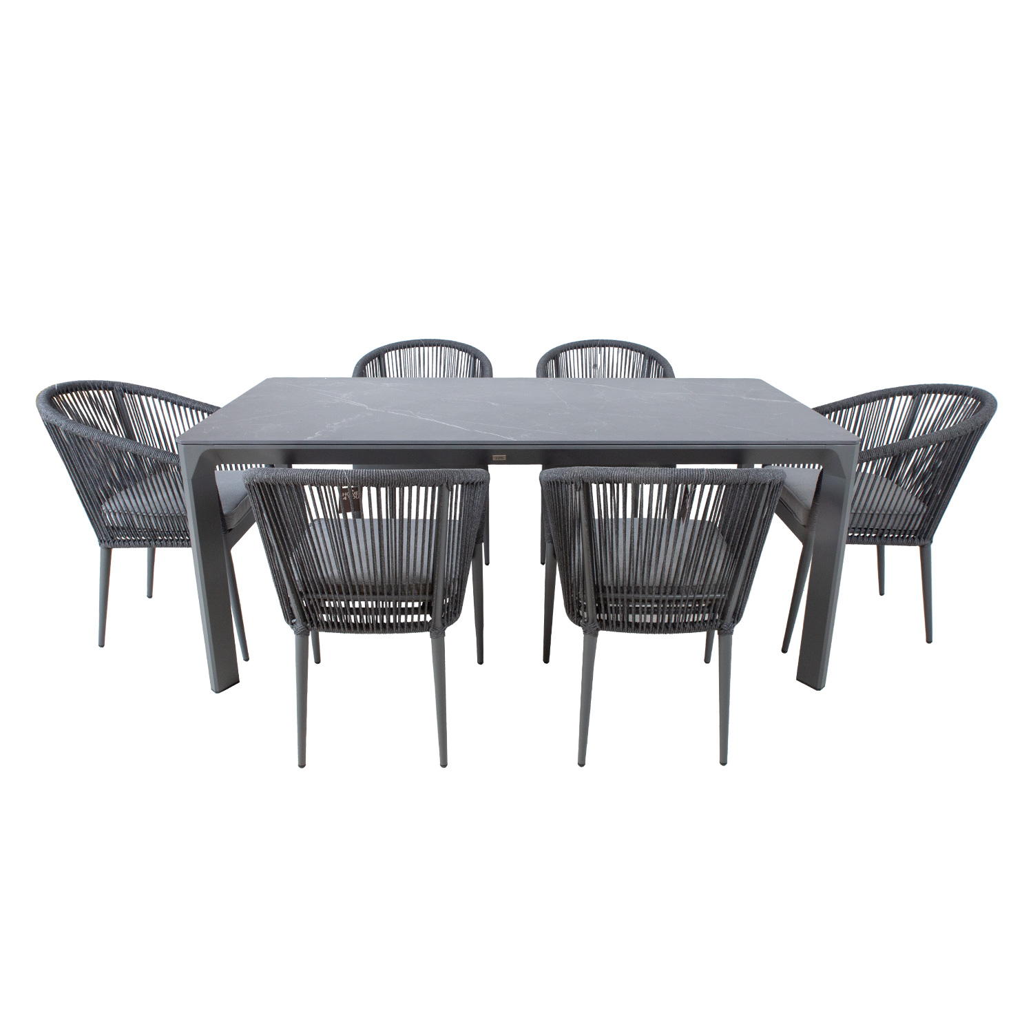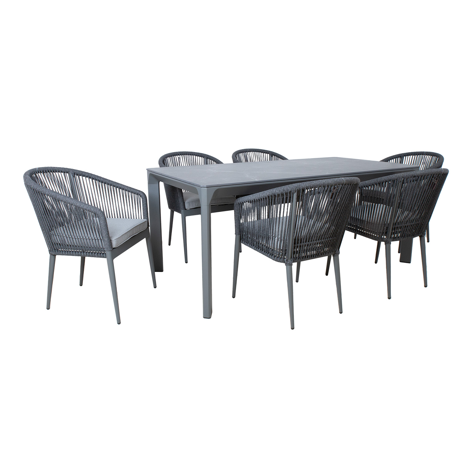 Sodo baldų komplektas CARVES stalas ir 6 kėdės. Stalo matmenys 180x90xH75 cm, stalviršio storis 11 mm. Kojos ir rėmas pagaminti iš aliuminio (48x25x1,2 mm) ir nudažyti pilkais milteliniais dažais. Sukepintas akmens stalviršis pagamintas naudojant naujovišką technologiją, kuri imituoja natūralaus akmens susidarymo procesą žemės plutos gelmėse. Kaolino arba porcelianinio molio dalelės apdorojamos 1200 laipsnių Celsijaus temperatūroje, todėl gaunama medžiaga, savo savybėmis ir išvaizda primenanti natūralų akmenį. Ji plona, bet labai tvirta (santykinis kietumas pagal Moso skalę – 7), patvari, atspari aukštai temperatūrai ir atmosferos poveikiui, atspari dėmėms, ją labai lengva valyti ir prižiūrėti. Kadangi nenaudojamos cheminės rišamosios medžiagos, ši medžiaga yra higieniška. DĖMESIO! Venkite smūgių, atsitrenkimų ir kritimų. Kėdės rėmas ir kojos pagamintos iš aliuminio ir padengtos pilkais milteliniais dažais. Kėdės atlošas ir porankiai aptraukti virvės pynimu. Į komplektą įeina sėdynės pagalvėlė. Pagalvėlės užvalkalas pagamintas iš poliesterio audinio. Pagalvėlės matmenys 45x42x5 cm. Sėdynės pagrindą palaiko aliuminio juostelės. Kėdės matmenys 57x65xH81 cm, sėdynės aukštis 44 cm. Ribinis svoris 100 kg. Kėdės yra sukraunamos viena ant kitos, kad jas būtų lengva ir taupant vietą laikyti. PRIEŽIŪRA: pasibaigus vasaros sezonui, rekomenduojame sodo baldus laikyti patalpoje. Pasibaigus sezonui, sodo baldus reikėtų laikyti sode. Laikykite vėsioje, sausoje ir gerai vėdinamoje vietoje.