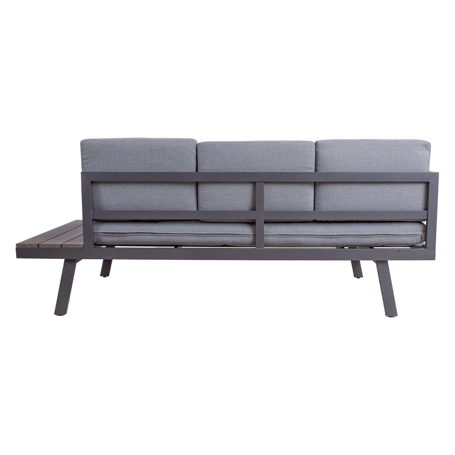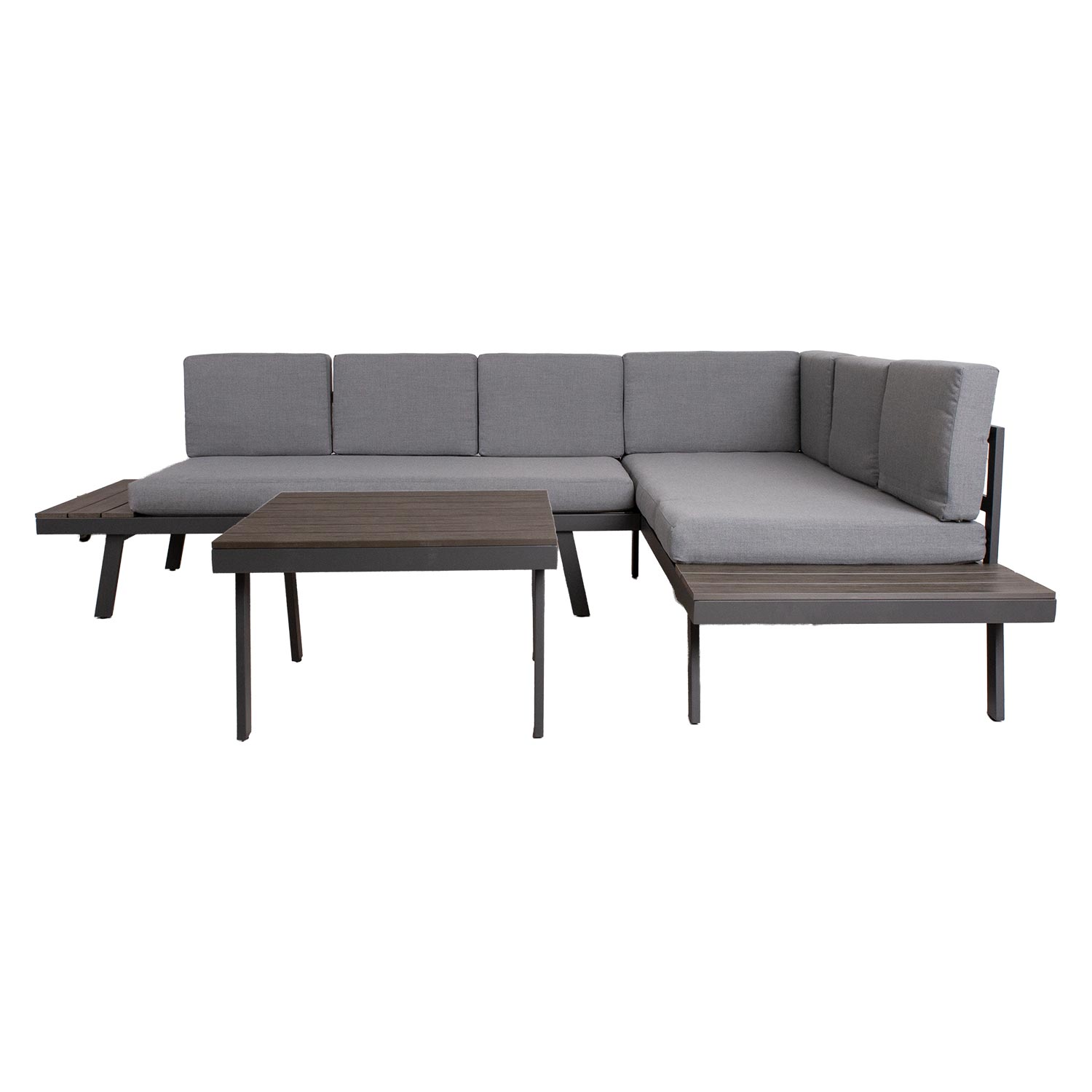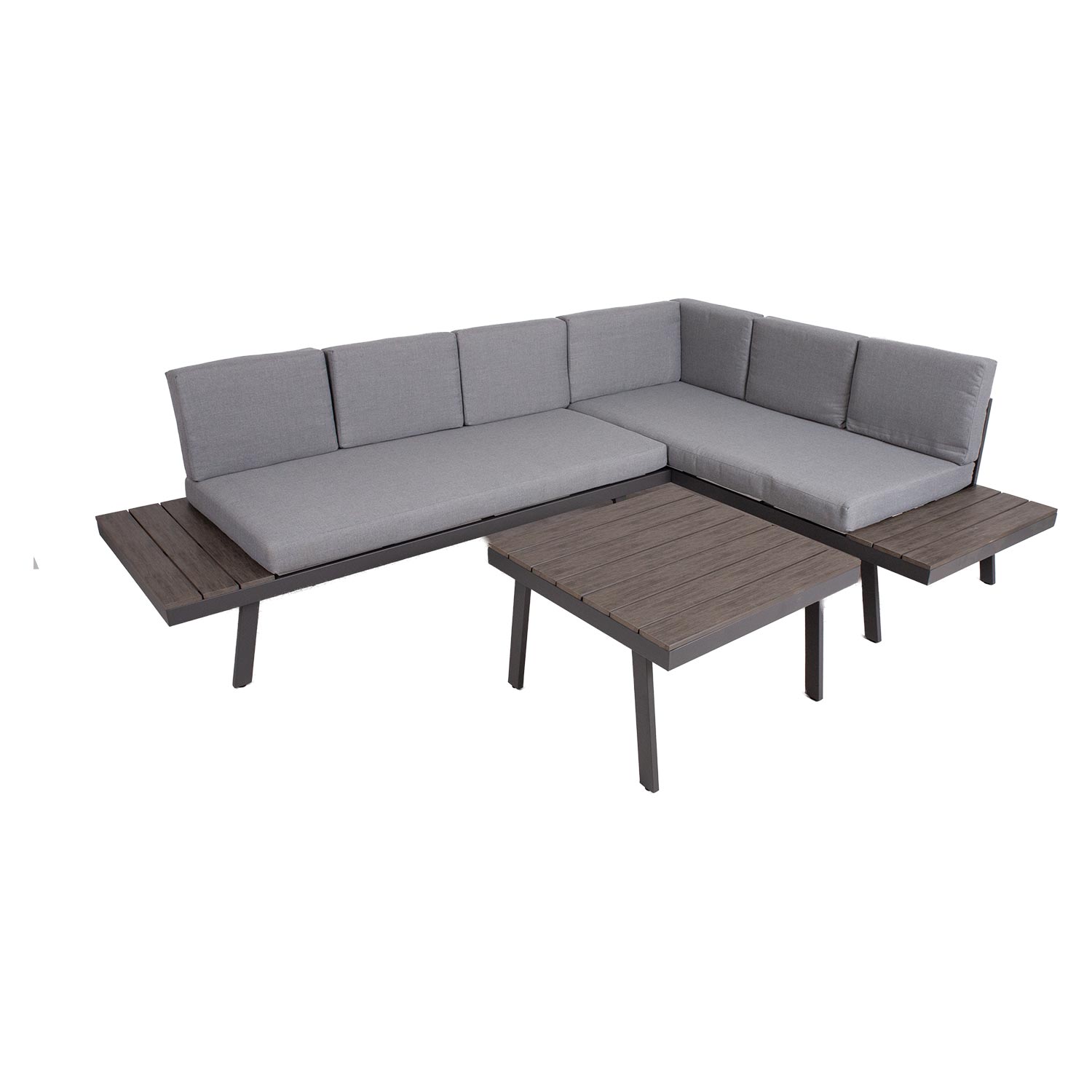 Sodo baldų komplektas DELGADO kampinė sofa ir stalas. Pagrindinė kampinės sofos ir stalo konstrukcija pagaminta iš plieno ir padengta pilka milteline danga. Stalo stalviršis ir sofos šoniniai staliukai padengti plastikinėmis juostelėmis. Į komplektą įeina 2 sėdimosios pagalvės 148x73xH10 cm, 6 atlošo pagalvės 50x35x10 cm, 1 atlošo pagalvė 61x35x10 cm. Pagalvių užvalkalai pagaminti iš pilko poliesterio audinio. Pagalvių užvalkalus galima nuimti ir skalbti. Sofos matmenys 70x70xH44,5 cm. Kampinę sofą sudaro dvi dalys, kurių matmenys 180x75xH65cm ir 182x75xH65cm. Bendri sofos matmenys yra 255×75/182xH65cm. Sėdynės aukštis iki rėmo krašto yra 32 cm. Šoninio staliuko matmenys 75×29,5 cm. Gaminys yra labai patvarus kintamomis oro sąlygomis ir lengvai prižiūrimas. Tik pagalvėles reikia apsaugoti nuo atmosferos poveikio. Pagalvių dėžė yra geras sprendimas čiužiniams kasdien laikyti ir išlaikyti juos sausus. Norėdami prailginti lauko baldų tarnavimo laiką, rekomenduojame naudoti lauko baldų užvalkalus. PRIEŽIŪRA: pasibaigus vasaros sezonui, rekomenduojame sodo baldus laikyti patalpoje. Jeigu sezonui, rekomenduojame palikti sodo baldus žiemos mėnesiais. Sandėliavimui naudokite sausą ir gerai vėdinamą patalpą.
