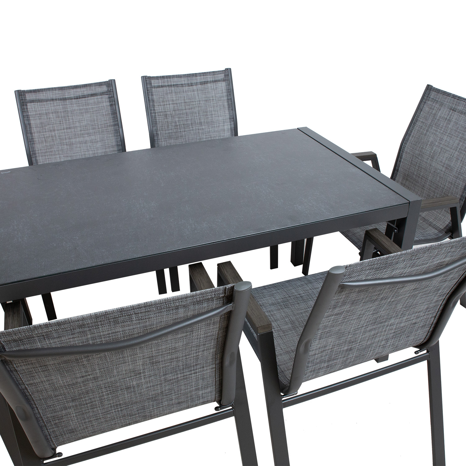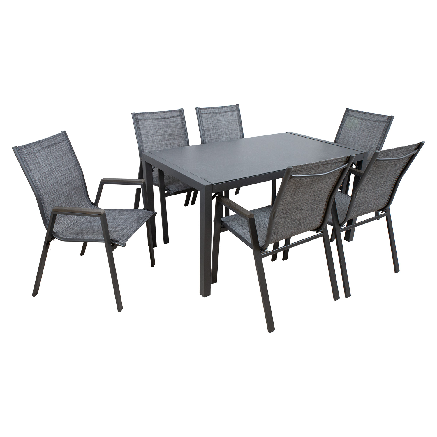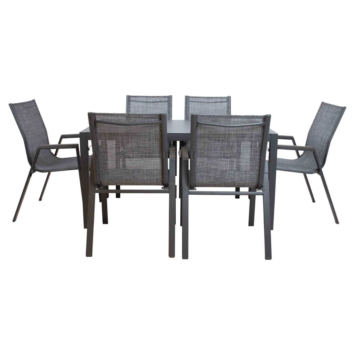 Sodo baldų komplektas DELGADO stalas ir 6 kėdės. Stalo matmenys 140x80xH72 cm. Stalo stalviršis: 5 mm pilkas grūdintas stiklas. Stalo ir kėdžių kojos bei rėmas pagaminti iš plieno ir nudažyti pilkais milteliniais dažais. Tekstilinė kėdžių sėdynė gerai praleidžia orą, greitai džiūsta ir yra lengvai valoma. Kėdės porankiai turi pilkas plastikines juosteles. Kėdės yra sukraunamos viena ant kitos, kad jas būtų lengva laikyti ir sutaupyti vietos. Bendrieji kėdės matmenys yra 56x61xH90 cm. Ribinis svoris 100 kg.
