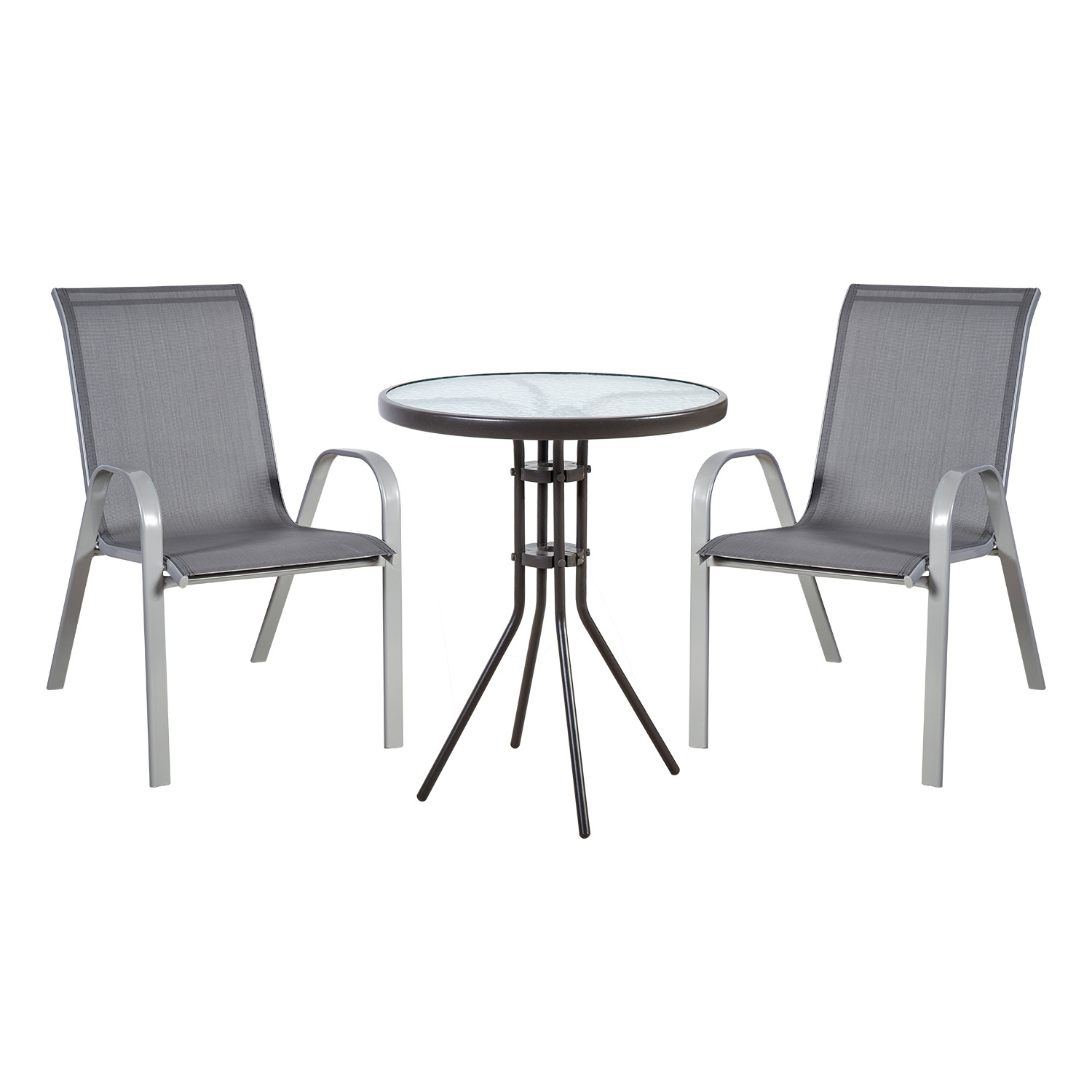 Sodo baldų komplektas DUBLIN stalas ir 2 kėdės, pilkos spalvos. Stalo matmenys D60xH70 cm. Stalo stalviršis: 5 mm skaidrus banguotas stiklas. Stalo rėmas ir kojos pagamintos iš plieno ir nudažytos tamsiai rudais milteliniais dažais. Stalas pagamintas iš juodos ir pilkos medienos, tamsiai pilkos spalvos ir juodai dažyto paviršiaus. Tekstilinė kėdžių sėdynė praleidžia orą, greitai džiūsta ir yra lengvai valoma. Kėdės rėmas ir kojos pagamintos iš plieno ir nudažytos pilkais milteliniais dažais. Kėdes galima sukrauti viena ant kitos, kad jas būtų lengva ir taupant vietą sandėliuoti. Bendrieji kėdės matmenys yra 55,5x73xH90 cm. Sėdynės plotis 45 cm, sėdynės gylis 41 cm, sėdynės aukštis 44 cm. Atlošo aukštis 57 cm. Porankių aukštis nuo žemės 61 cm. Ribinis svoris 100 kg.