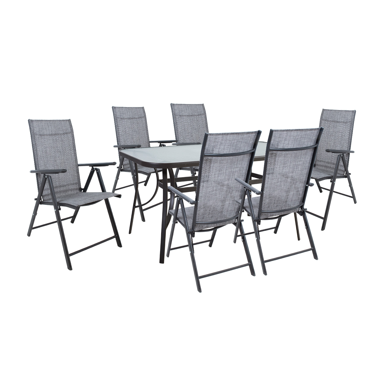 Sodo baldų komplektas DUBLIN stalas ir 6 sulankstomos kėdės, pilkos spalvos. Stalo matmenys 150x90xH70 cm. Stalo stalviršis. Stalas su D4cm skėčiu nuo saulės viduryje. Stalo rėmas ir kojos pagamintos iš plieno ir padengtos tamsiai ruda milteline danga. Bendrieji kėdžių matmenys 54x69xH102cm. Tekstilinė kėdės sėdynė praleidžia orą, greitai džiūsta ir yra lengvai valoma. Kėdės rėmas pagamintas iš plieno ir padengtas tamsiai pilka milteline danga. Norėdami sureguliuoti atlošą, pakelkite porankius, pasirinkite tinkamą atlošo padėtį ir pritvirtinkite porankius. Galima pasirinkti penkias skirtingas padėtis. Sulankstytą kėdę lengva nešiotis ar laikyti. Sulankstytos kėdės matmenys 54x81x17 cm. Sėdynės plotis 45 cm, sėdynės gylis 45 cm, sėdynės aukštis 44 cm. Atlošo aukštis 69 cm, porankio aukštis 63 cm. Ribinis svoris 100 kg.
