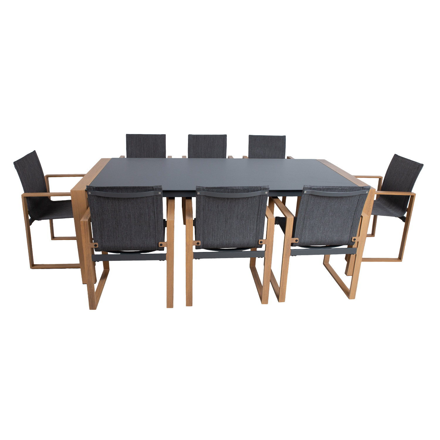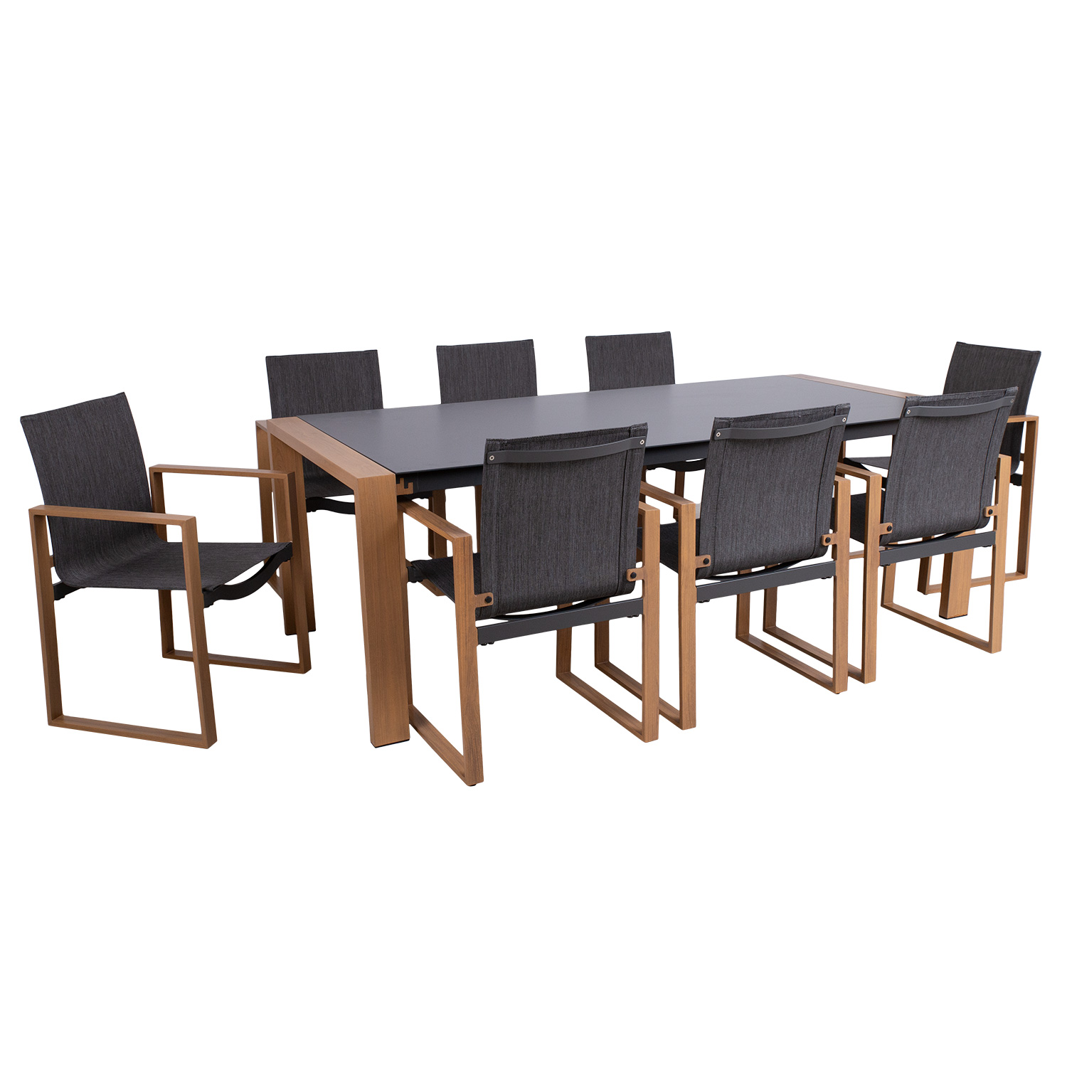 Sodo baldų komplektas DUISBURG. Komplektą sudaro didelis valgomojo stalas ir 8 kėdės. Stalo ir kėdžių rėmai pagaminti iš aliuminio. Paviršiaus apdaila, primenanti natūralią medžio tekstūrą, išgauta šiluminio perkėlimo spaudos būdu. Siekiant perkelti medžio tekstūrą ant aliuminio paviršiaus, ant aliuminio profilio užklijuojama perkėlimo plėvelė, kuri po to veikiama dideliu karščiu. Šio proceso metu rašalas nuo perkėlimo plėvelės persiduoda ant aliuminio paviršiaus ir sukuria medieną primenantį efektą. Taip apdorotas paviršius yra labai patvarus, atsparus saulės spinduliams ir nedideliems įbrėžimams. Stalviršis turi tamsiai pilko grūdinto stiklo viršų. Kėdžių sėdynės pagamintos iš olefino audinio. Stalo matmenys 220x100xH74,5 cm. Kėdės matmenys 57x57xH86,5 cm. Sėdynės plotis 44 cm, sėdynės gylis 46 cm, sėdynės aukštis 44 cm. Porankio aukštis nuo žemės 65 cm. Gaminys labai atsparus besikeičiančioms oro sąlygoms ir lengvai prižiūrimas. Rekomenduojame naudoti lauko baldų užvalkalus, kad prailgintumėte lauko baldų tarnavimo laiką. PRIEŽIŪRA: pasibaigus vasaros sezonui, rekomenduojame sodo baldus laikyti patalpoje. Pasibaigus vasaros sezonui, rekomenduojame palikti baldus sode žiemos mėnesiais. Sandėliavimui naudokite sausą ir gerai vėdinamą patalpą.