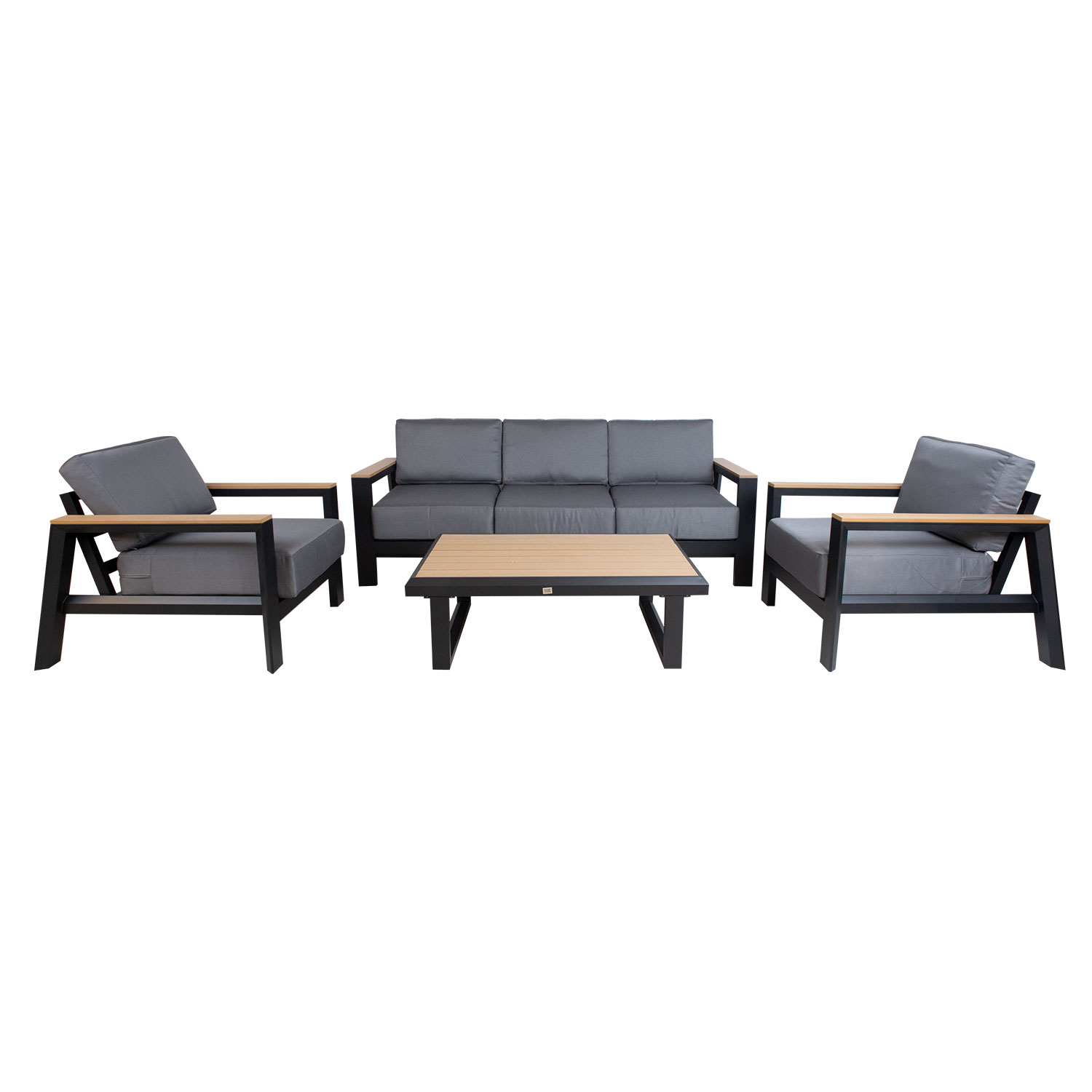 Sodo baldų komplektas FELINO su stalu, sofa ir 2 foteliais, juodos spalvos. Tvirta pagrindinė visų komplekto dalių konstrukcija pagaminta iš aliuminio ir nudažyta juodais milteliniais dažais. Stalo stalviršis ir fotelio bei sofos porankiai pagaminti iš tikmedžio spalvos dirbtinės medienos. Storos pilkos spalvos pagalvėlės užtikrina puikų sėdėjimo komfortą. Pagalvių užvalkalai pagaminti iš olefino audinio, puikiai iš atsparaus atmosferos poveikio. Rinkinį sudaro 2 fotelio sėdynės pagalvėlės 70x70x18 cm, 2 atlošo pagalvėlės 70x40x12 cm ir 3 sofos sėdynės pagalvėlės 70x64x18 cm, 3 atlošo pagalvėlės 65x40x12 cm. Stalo matmenys 117x80xH37 cm. Sofos matmenys 215x96xH71cm, fotelio matmenys 90x96xH71cm. Gaminys labai patvarus kintamomis oro sąlygomis, jį lengva prižiūrėti. Tik pagalvėles reikia apsaugoti nuo atmosferos poveikio. Užvalkalas pagalvei yra geras sprendimas, jei norite čiužinius laikyti kasdien ir išlaikyti juos sausus. Norėdami prailginti lauko baldų tarnavimo laiką, rekomenduojame naudoti lauko baldų užvalkalus. PRIEŽIŪRA: pasibaigus vasaros sezonui, rekomenduojame sodo baldus laikyti patalpoje. Jei plaktuko sezonui, rekomenduojame palikti sodo baldus žiemos mėnesiais. Sandėliavimui naudokite sausą ir gerai vėdinamą patalpą.