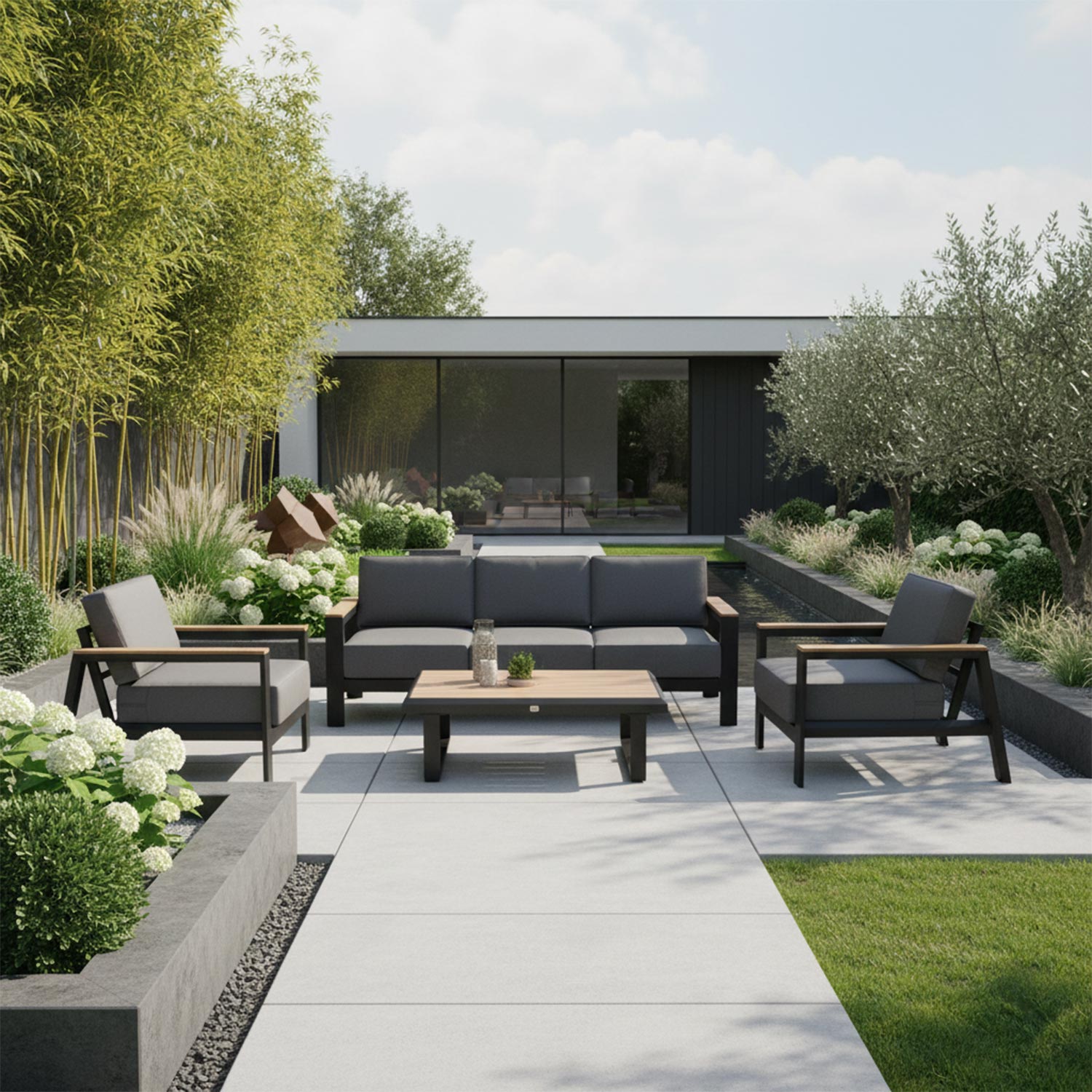 Sodo baldų komplektas FELINO stalas, sofa ir 2 kėdės, juodos spalvos