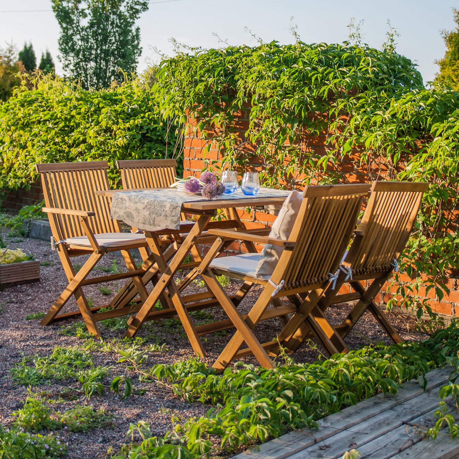 Sodo baldų rinkinys FINLAY stalas ir 4 kėdės su rankenomis. Stalas ir kėdės pagaminti iš akacijos medienos ir apdoroti medienos apsaugos alyva. Stalo matmenys 110x70xH74,5 cm. Kėdžių matmenys: 54x57xH86 cm. Sėdynės plotis 43 cm, gylis 39 cm, aukštis 45,5 cm. Ribinis svoris 90 kg. Gaminys atsparus kintamoms oro sąlygoms. KONSERVACIJA: Mediena yra gyva, natūrali medžiaga, kuri keičia savo išvaizdą priklausomai nuo oro sąlygų. Reguliariai valykite baldus, saugokite nuo drėgmės ir UV spindulių. Pakanka bent kartą per metus lengvai nušlifuoti ir padengti nauju alyvos sluoksniu, kad baldai atgautų naują išvaizdą. PRIEŽIŪRA: Pasibaigus vasaros sezonui rekomenduojame sodo baldus laikyti patalpoje. Pasibaigus vasaros sezonui, prieš sandėliuojant baldus patartina palikti juos sode, kad atvėstų ir išdžiūtų. Sandėliavimui naudokite sausą ir gerai vėdinamą patalpą. Sandėliavimo metu saugokite baldus nuo tiesioginių saulės spindulių.