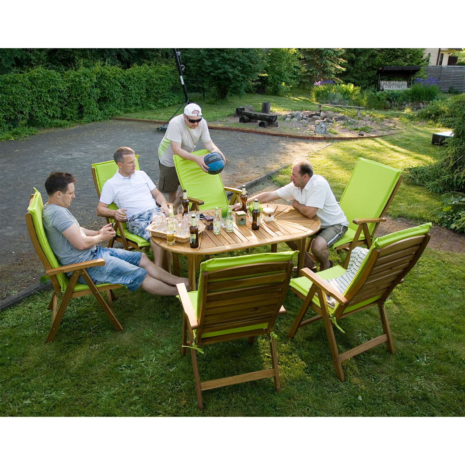 Sodo baldų komplektas FINLAY stalas ir 6 kėdės su rankenomis. Stalas ir kėdės pagaminti iš akacijos medienos ir apdoroti medienos apsaugos alyva. Išskleidžiamo stalo matmenys 153/195x90xH72 cm. Stalo viduryje yra 3,5 cm skylė skėčiui nuo saulės uždengti. Stalas per vidurį yra išskleidžiamas. Per vidurį sulankstomas 41,5 cm pločio prailgintojas, kuris dedamas po stalo stalviršiu. Bendrieji kėdės matmenys: 62x66xH110 cm, sėdimosios dalies plotis 51 cm, sėdimosios dalies gylis 47 cm, sėdimosios dalies aukštis 44 cm, atlošo aukštis 69 cm. Porankių aukštis nuo žemės 68 cm. Ribinis svoris 100 kg. Gaminys atsparus besikeičiančioms oro sąlygoms. KONSERVACIJA: Mediena yra gyva natūrali medžiaga, kuri keičia savo išvaizdą priklausomai nuo oro sąlygų. Baldai yra veikiami kintančių oro sąlygų. Reguliariai valykite, saugokite nuo drėgmės ir UV spindulių. Pakanka bent kartą per metus lengvai nušlifuoti ir padengti nauju alyvos sluoksniu, kad baldai atgautų naują išvaizdą. PRIEŽIŪRA: Pasibaigus vasaros sezonui rekomenduojame sodo baldus laikyti patalpoje. Pasibaigus vasaros sezonui, prieš sandėliuojant baldus patartina palikti juos sode, kad atvėstų ir išdžiūtų. Sandėliavimui naudokite sausą ir gerai vėdinamą patalpą. Sandėliavimo metu saugokite baldus nuo tiesioginių saulės spindulių.