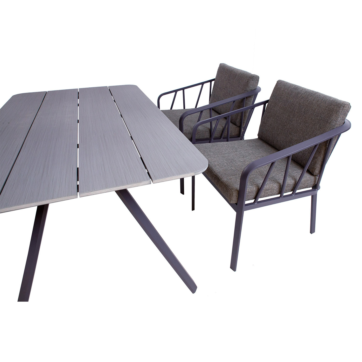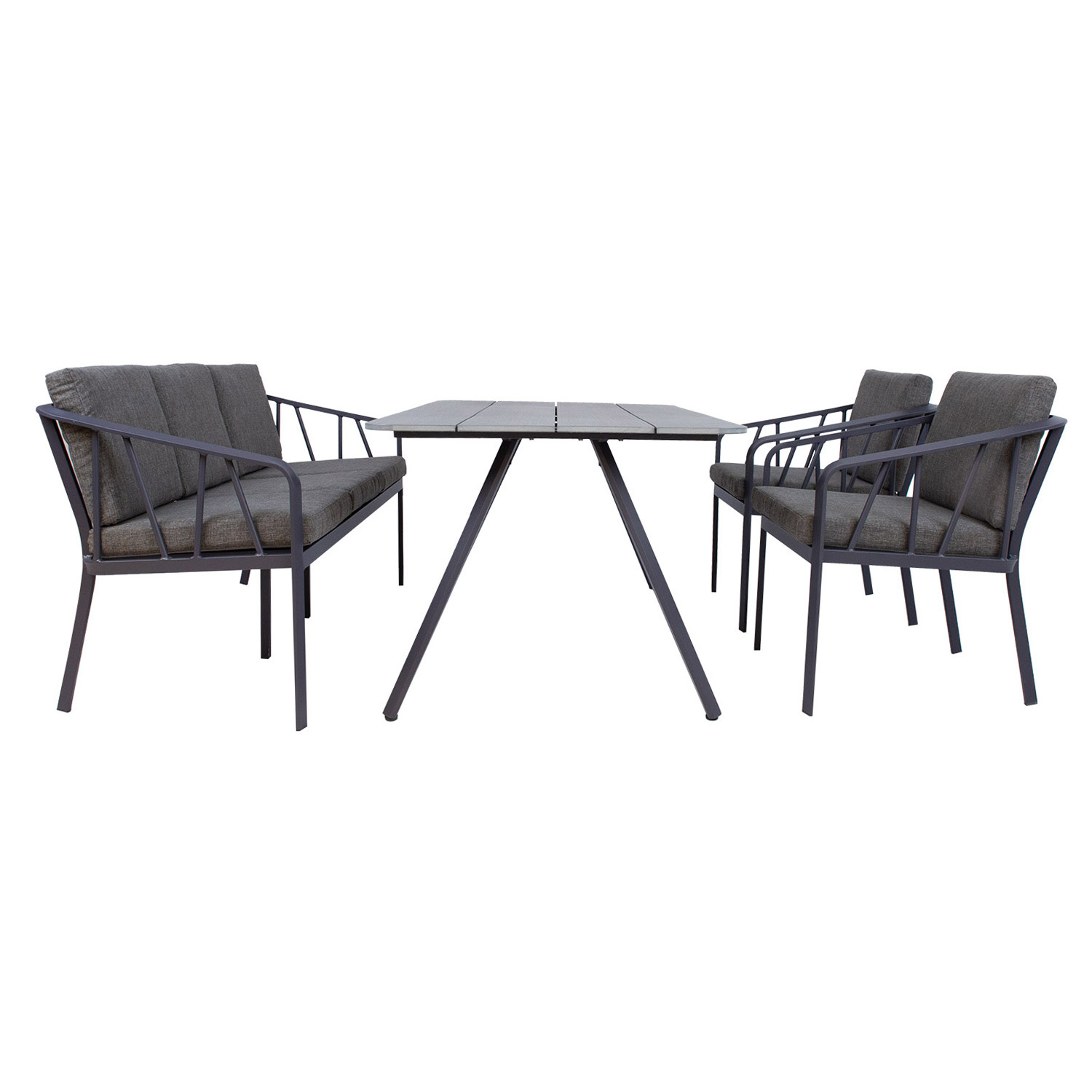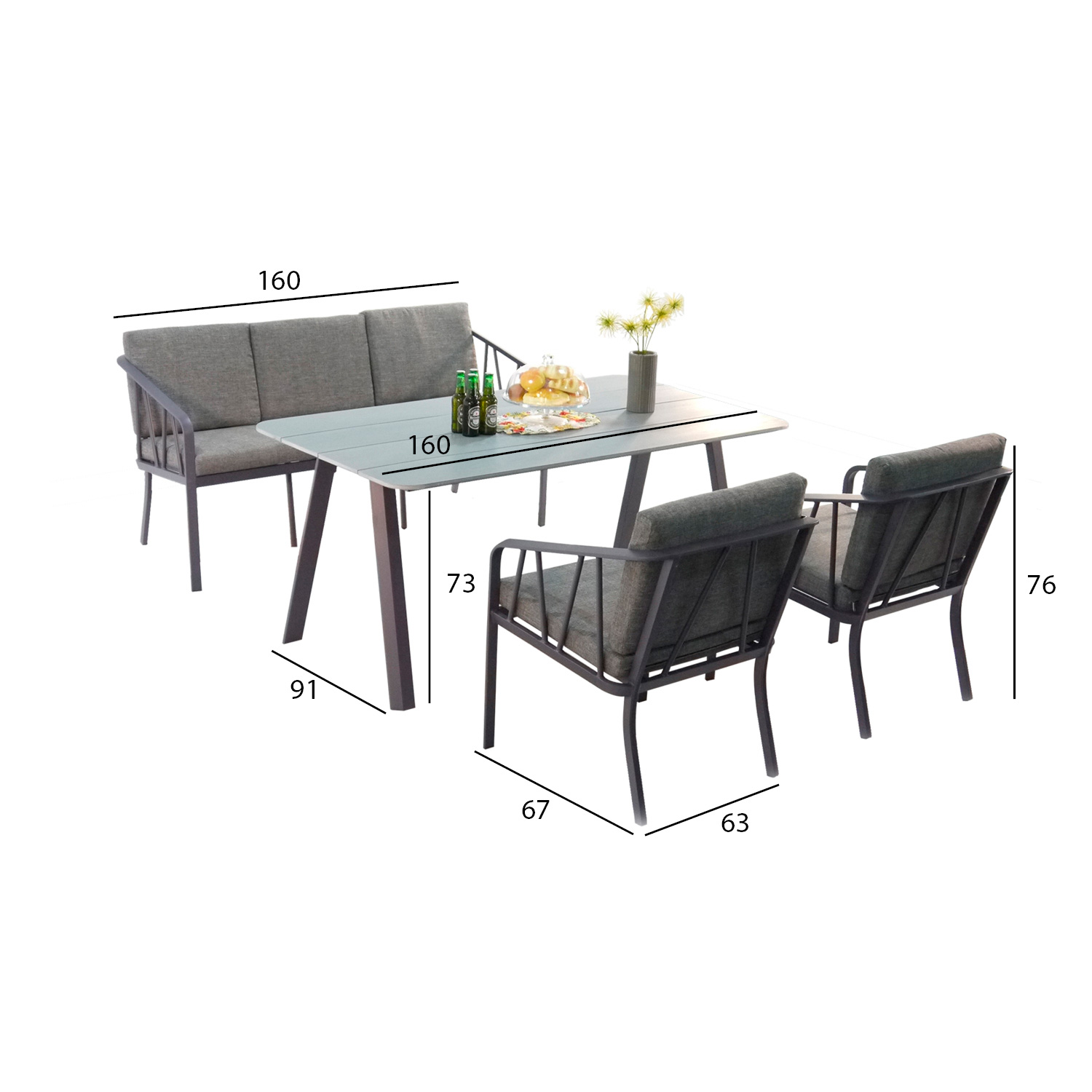 Sodo baldų komplektas KAHLA stalas, sofa ir 2 kėdės, pilkos spalvos. Sofos ir kėdžių rėmai, stalo kojos ir pagrindo rėmas pagaminti iš aliuminio ir dažyti milteliniu būdu violetinės pilkos spalvos dažais. Stalo stalviršis: pilka laminuota mediena (4 plokštės 1600x223x15 mm). Stalo matmenys 160x91xH73 cm. Kėdės matmenys 63x67xH76 cm, sėdimoji pagalvėlė 57x54x6 cm, atlošo pagalvėlė 57x40x6 cm. 3 vietų sofos išmatavimai 160x67xH76cm, sėdynės pagalvėlė 3vnt – 51x54x6cm, atlošo pagalvėlė 3vnt – 51x40x6cm. Pagalvėlių užvalkalai pagaminti iš pilko olefino audinio. Gaminys labai atsparus besikeičiančioms oro sąlygoms ir lengvai prižiūrimas. Tik pagalvėles reikia apsaugoti nuo atmosferos poveikio. Užvalkalas pagalvei yra geras sprendimas, jei norite kasdien laikyti čiužinius ir išlaikyti juos sausus. Norėdami prailginti lauko baldų tarnavimo laiką, rekomenduojame naudoti lauko baldų užvalkalus. PRIEŽIŪRA: pasibaigus vasaros sezonui, rekomenduojame sodo baldus laikyti patalpoje. Jei plaktuko sezonui, rekomenduojame palikti sodo baldus žiemos mėnesiais. Sandėliavimui naudokite sausą ir gerai vėdinamą patalpą.