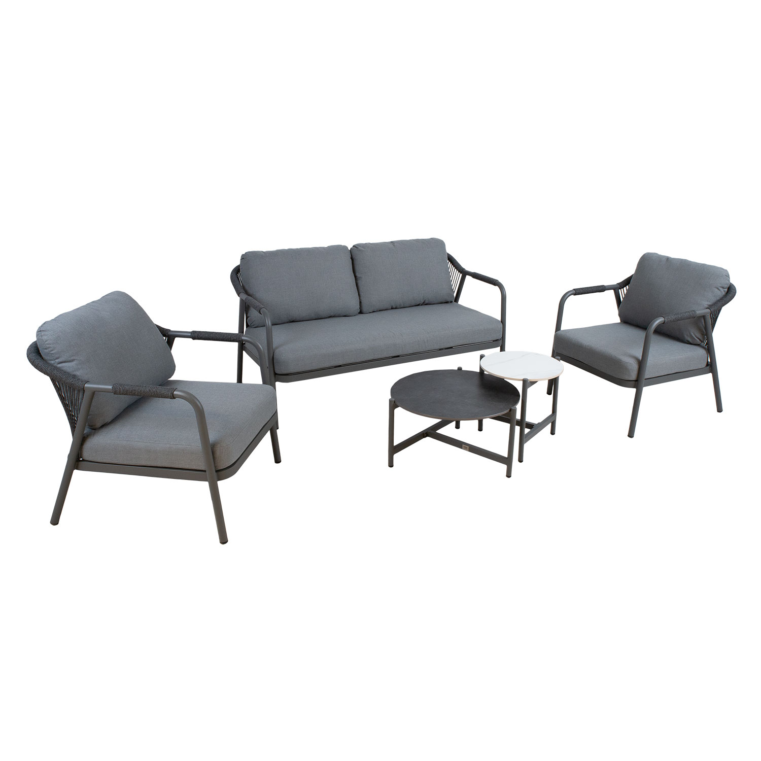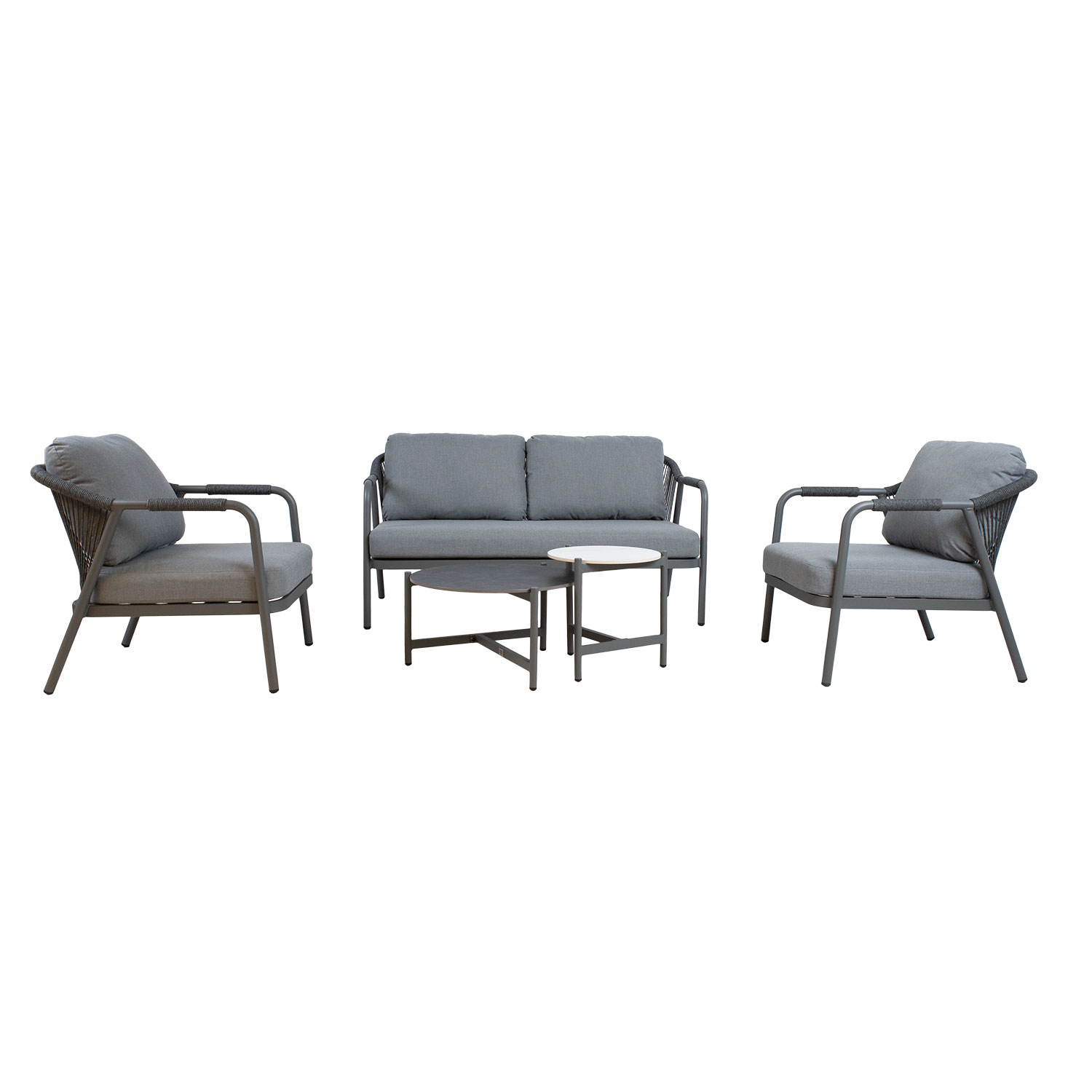 Sodo baldų komplektas KASSEL 2 stalai, sofa ir 2 kėdės. Pagrindinė visų komplekto dalių konstrukcija pagaminta iš aliuminio ir nudažyta pilkais milteliniais dažais. Sofos ir fotelių atlošai ir porankiai aptraukti akį traukiančiu virvės pynimu. Komplekte yra minkštos pagalvėlės. Stalų matmenys D60xH34, D440xH42 cm. Stalų stalviršiai pagaminti iš sukepinto akmens. Didesniojo stalo stalviršis yra pilkas, o mažesniojo – baltas. Sofos matmenys 148x81xH73,5 cm, kėdės matmenys 69x81xH73,5 cm. Sėdynių pagrindas su aliuminio sėdynėmis. Apmušalai pagaminti iš kordo, pasižyminčio puikiu azartu atmosferos poveikiui. Pagalvėlių užvalkalai pagaminti iš poliesterio audinio. Sėdynės pagalvėlės storis 10 cm. Gaminys atsparus besikeičiančioms oro sąlygoms ir lengvai prižiūrimas. Pagalvėlės pagamintos iš medžiagų, tinkamų naudoti lauke, tačiau dėl didelės drėgmės gali atsirasti pelėsis, o dėl UV spindulių užvalkalas gali prarasti spalvą. Pagalvių dėžė yra geras sprendimas kasdien laikyti čiužinius ir išlaikyti juos sausus. Norėdami prailginti lauko baldų tarnavimo laiką, rekomenduojame naudoti lauko baldų užvalkalus. PRIEŽIŪRA: Pasibaigus vasaros sezonui, rekomenduojame sodo baldus laikyti patalpoje. Vasaros sezonui rekomenduojame palikti sodo baldus žiemos mėnesiais. Sandėliavimui naudokite sausą ir gerai vėdinamą patalpą.