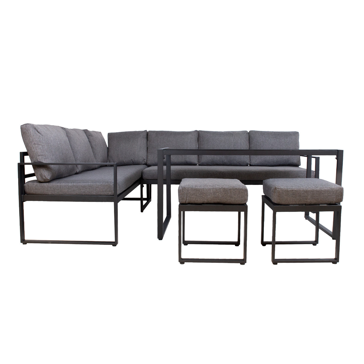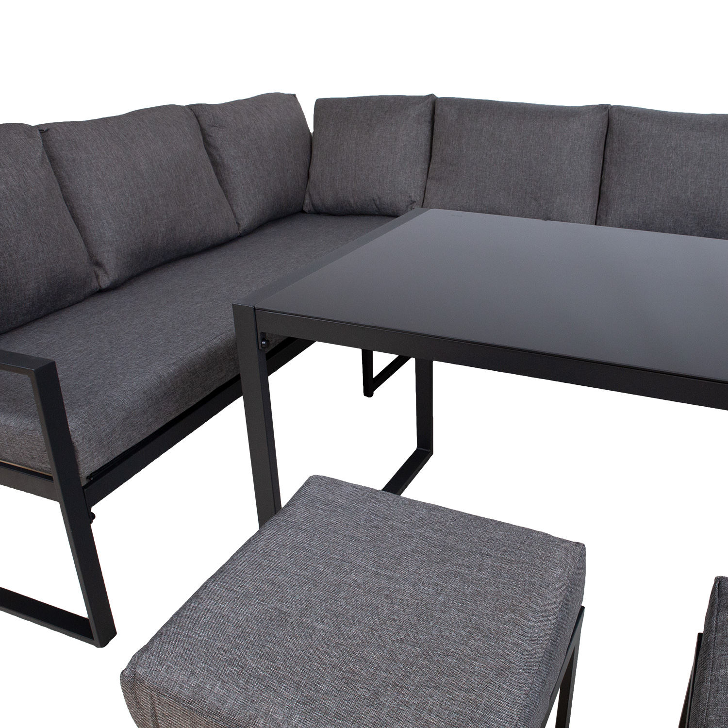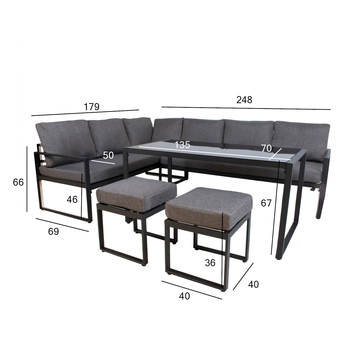 Sodo baldų komplektas LEIPZIG kampinė sofa, stalas ir 2 kėdės. Pagrindinė visų komplekto dalių konstrukcija pagaminta iš plieno ir nudažyta tamsiai pilkais milteliniais dažais. Kampinę sofą sudaro du 3 vietų moduliai, kurių matmenys 179x69xH66 cm. Į komplektą įeina pagalvėlės. Pagalvėlės pagamintos iš pilko poliesterio audinio. Stalo matmenys 135x70xH67 cm, stalo stalviršis: 5 mm tamsiai pilkas grūdintas stiklas. Kėdžių matmenys: 40x40xH36cm. Gaminys labai atsparus besikeičiančioms oro sąlygoms ir lengvai prižiūrimas. Tik pagalvėles reikia apsaugoti nuo atmosferos poveikio. Rekomenduojame naudoti lauko baldų užvalkalus, kad prailgintumėte lauko baldų tarnavimo laiką. PRIEŽIŪRA: pasibaigus vasaros sezonui, rekomenduojame sodo baldus laikyti patalpoje. Pasibaigus vasaros sezonui, rekomenduojame palikti baldus sode žiemos mėnesiais. Sandėliavimui naudokite sausą ir gerai vėdinamą patalpą.