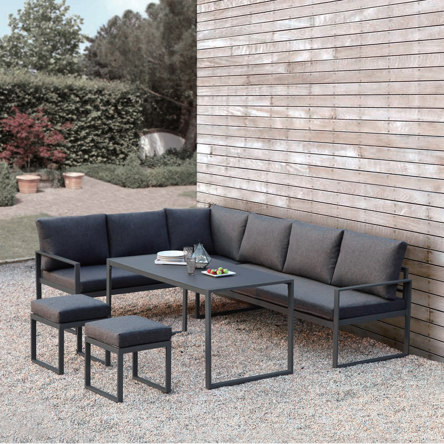 Sodo baldų komplektas LEIPZIG stalas, kampinė sofa, 2 pufai
