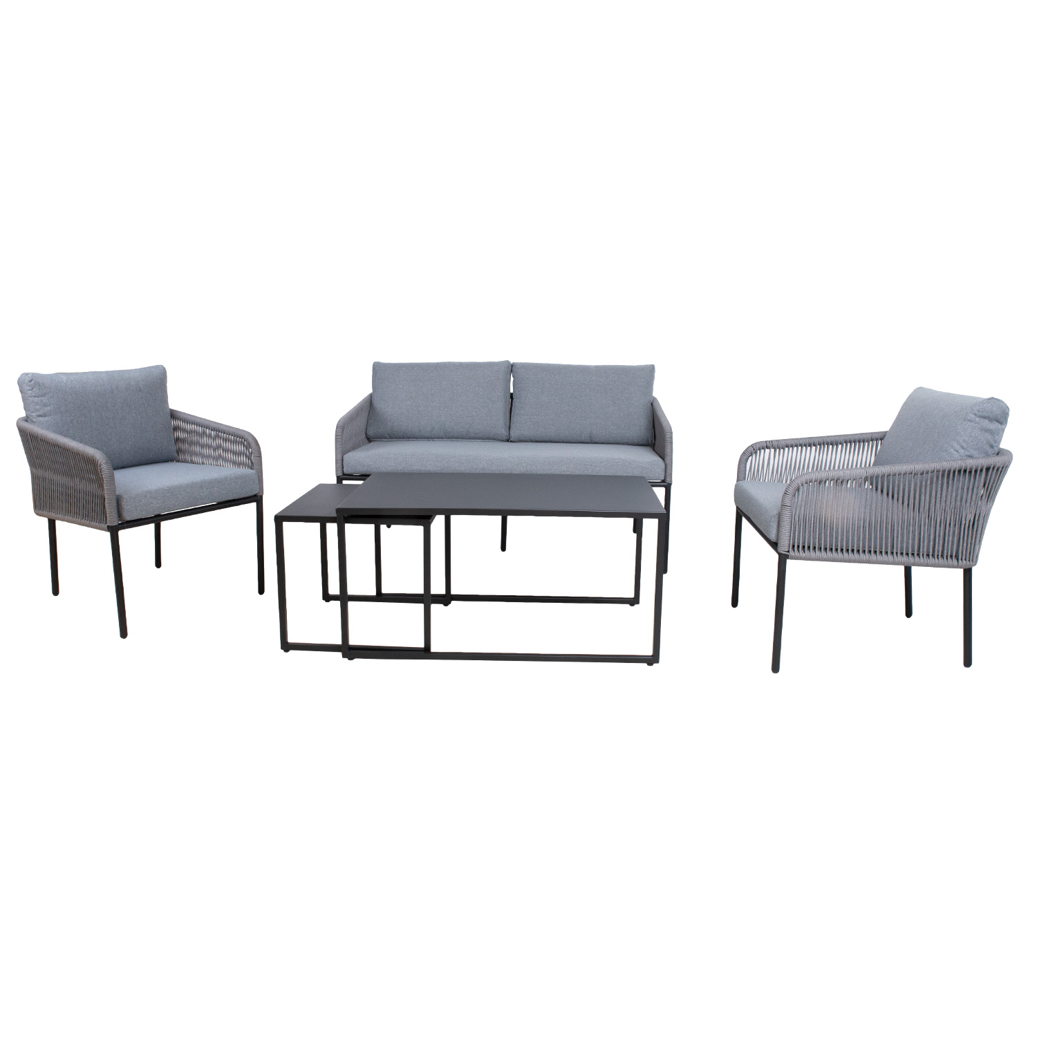 Sodo baldų komplektas LEVINE 2 stalai, sofa ir 2 foteliai, pilkos spalvos. Rinkinį sudaro 2 sofos staliukai, kuriuos pagal poreikį galima statyti vieną po kitu arba atskirai. Pagrindinė sofos, fotelių ir staliukų konstrukcija pagaminta iš plieno, staliukų stalviršiai pagaminti iš 1 mm skardos. Visos metalinės dalys nudažytos pilkais milteliniais dažais. Sofos ir kėdžių atlošai ir porankiai aptraukti virvių pynimu. Minkštos pilkos spalvos pagalvėlės užtikrina sėdėjimo komfortą. Pagalvėlės pagamintos iš pilko poliesterio audinio. Rinkinį sudaro 2 kėdžių pagalvėlės 55x60x8 cm, 2 atlošo pagalvėlės 54x48x8 cm, sofos sėdimoji pagalvėlė 135x60x8 cm ir 2 atlošo pagalvėlės 68x40x8 cm. Pagalvių užvalkalai nuimami ir gali būti skalbiami. Stalų matmenys 49x49xH45 cm, 100x55xH50 cm. Sofos matmenys 142×69,5xH70,5 cm. Fotelio matmenys 60×69,5xH70,5 cm. Sėdynės aukštis iki rėmo krašto yra 41 cm, su pagalvėle – 49 cm. Gaminys labai atsparus besikeičiančioms oro sąlygoms ir lengvai prižiūrimas. Tik pagalvėles reikia apsaugoti nuo atmosferos poveikio. Rekomenduojame naudoti lauko baldų užvalkalus, kad prailgintumėte jų tarnavimo laiką. PRIEŽIŪRA: Pasibaigus vasaros sezonui rekomenduojame sodo baldus laikyti patalpoje. Per vasaros sezonui, rekomenduojame palikti baldus sode žiemos mėnesiais. Sandėliavimui naudokite sausą ir gerai vėdinamą patalpą.