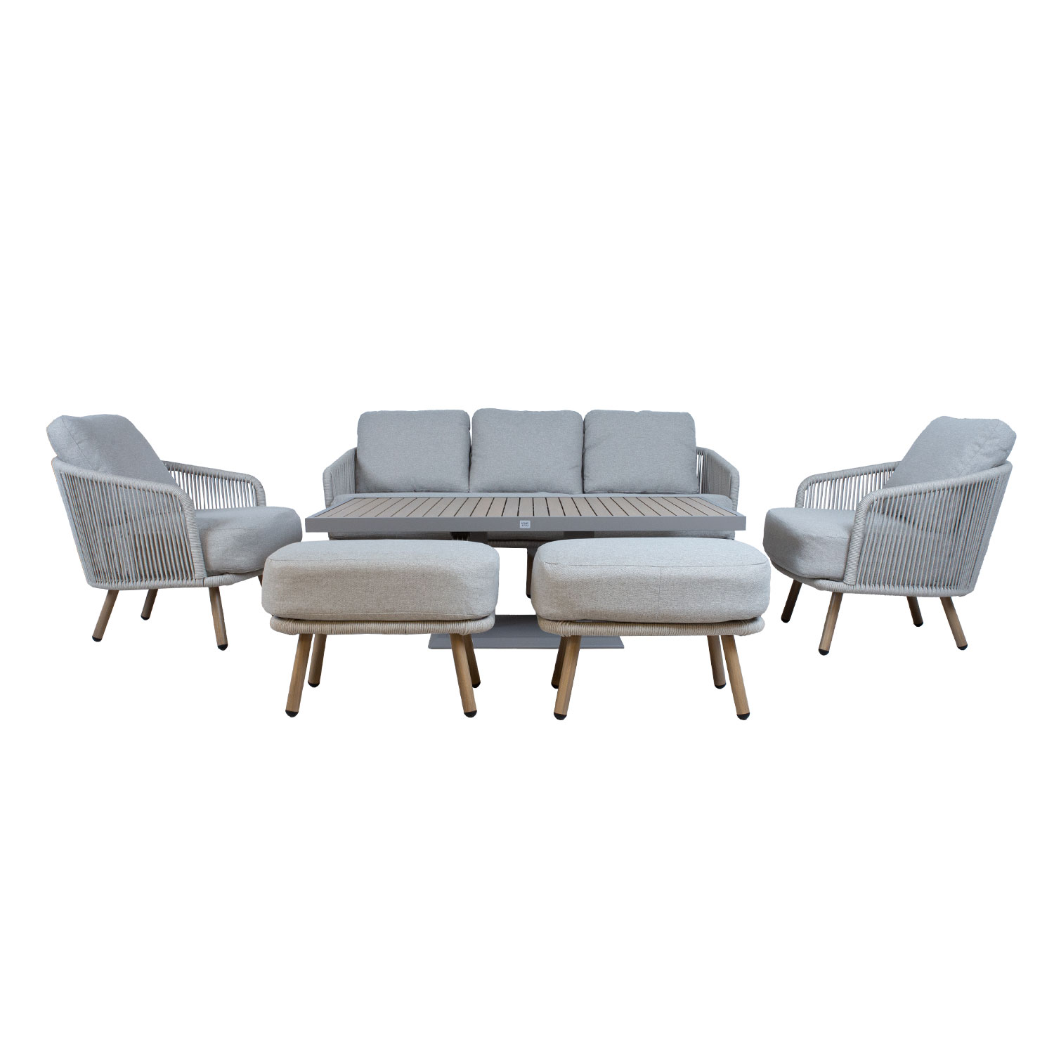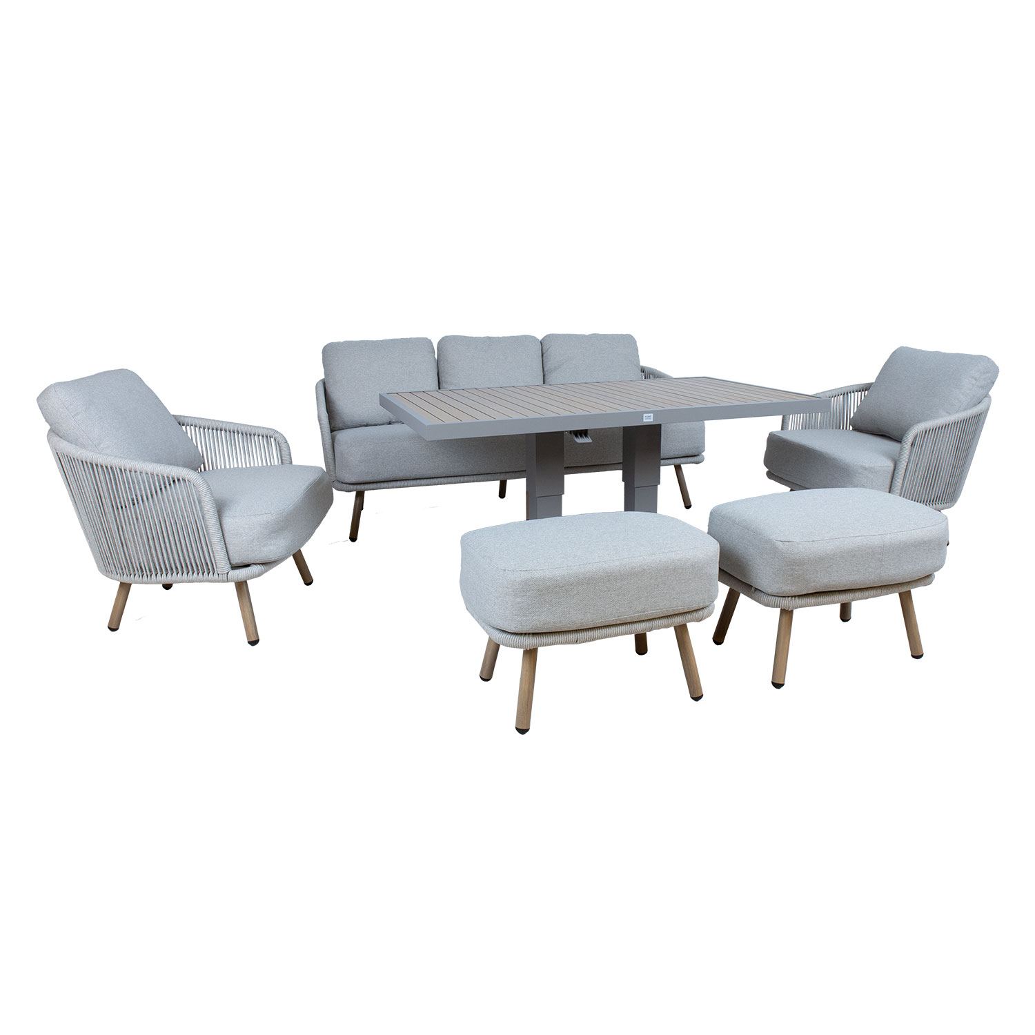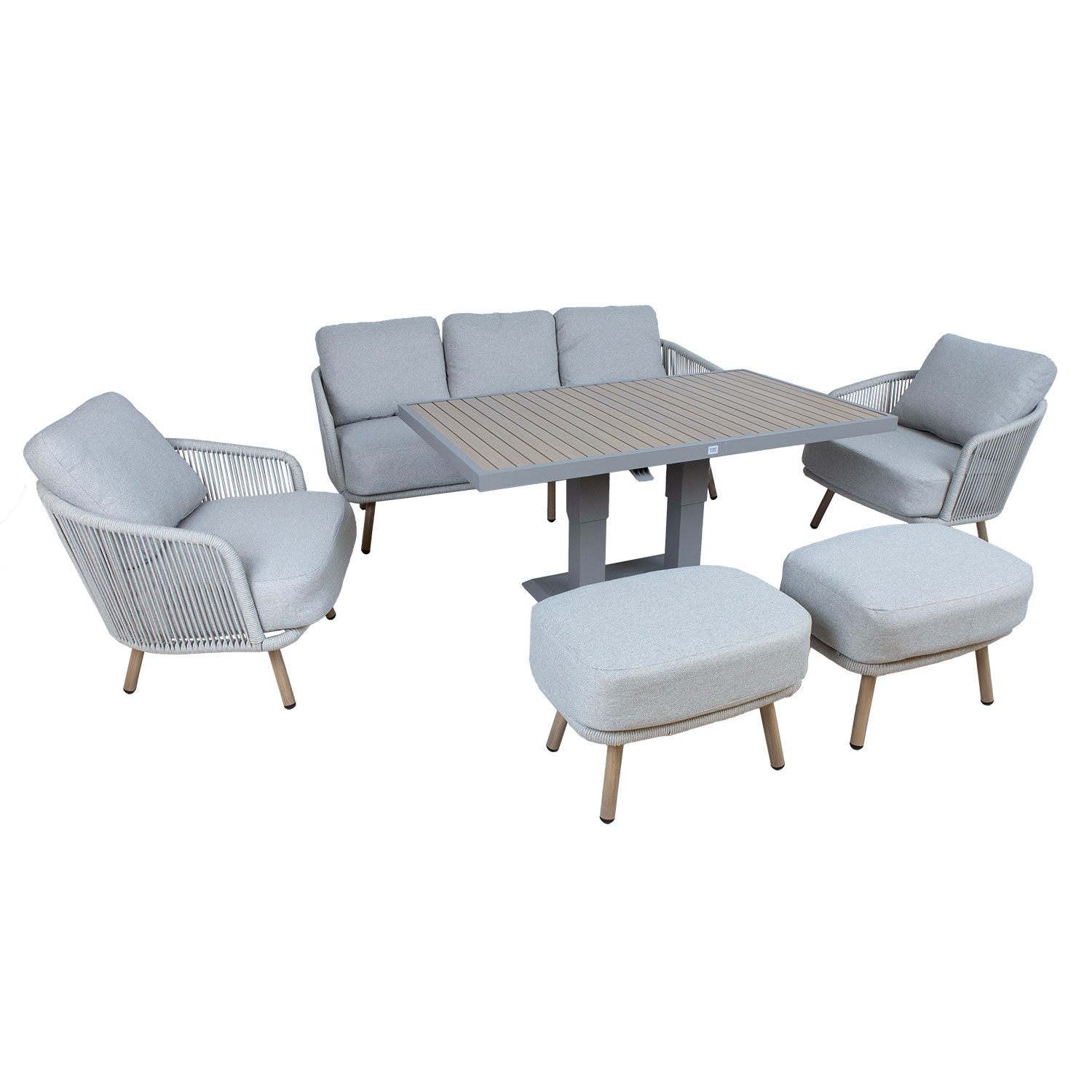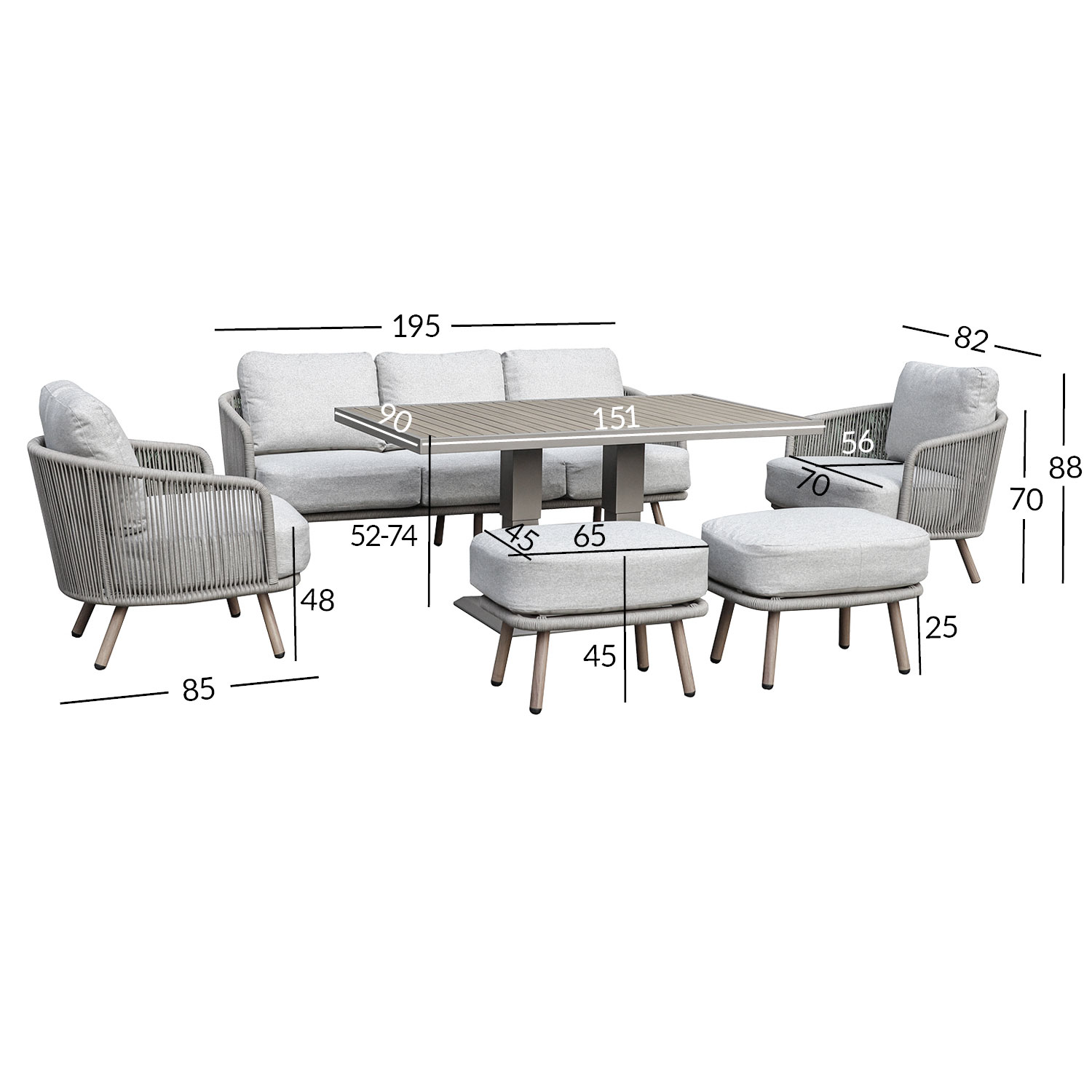 Rinkinį sudaro reguliuojamo aukščio stalas, 3 sėdimų vietų sofa, 2 foteliai ir 2 tumbos.